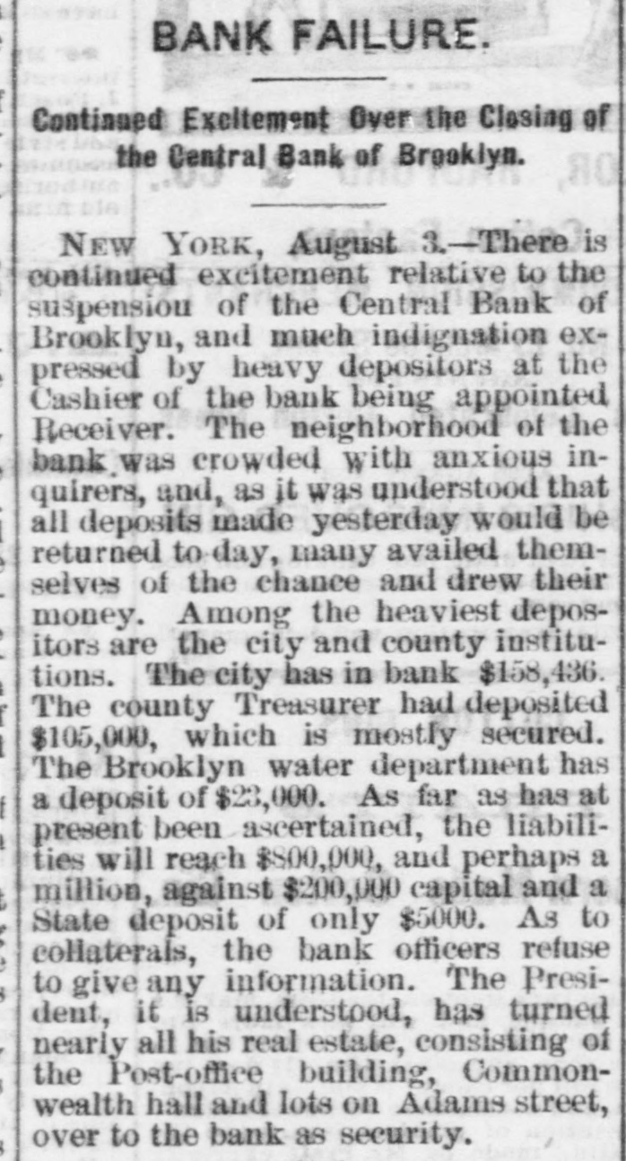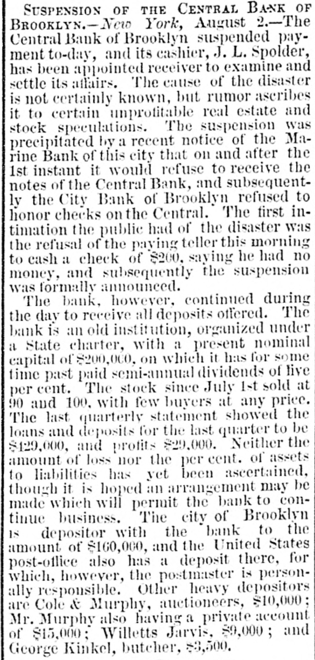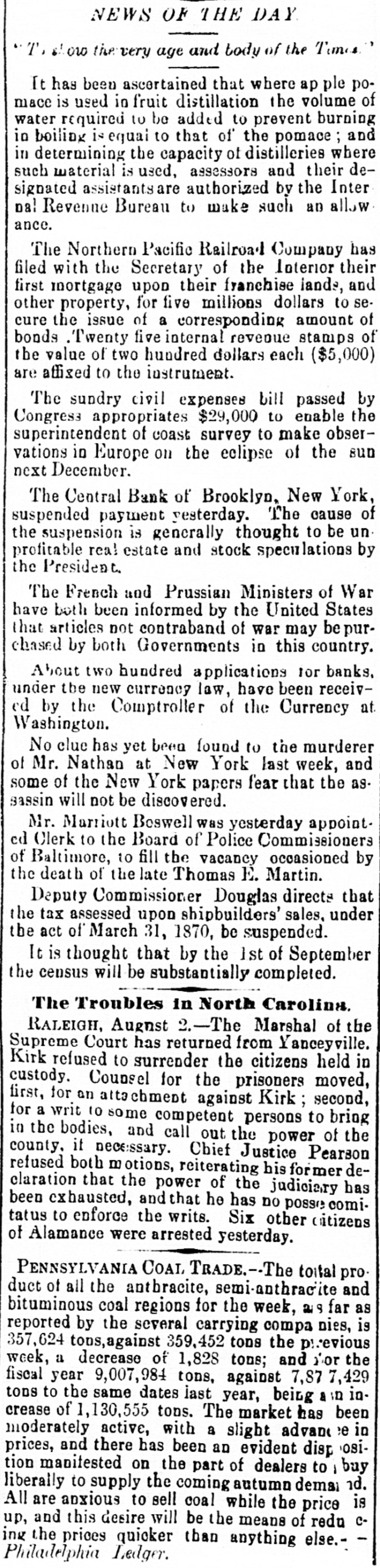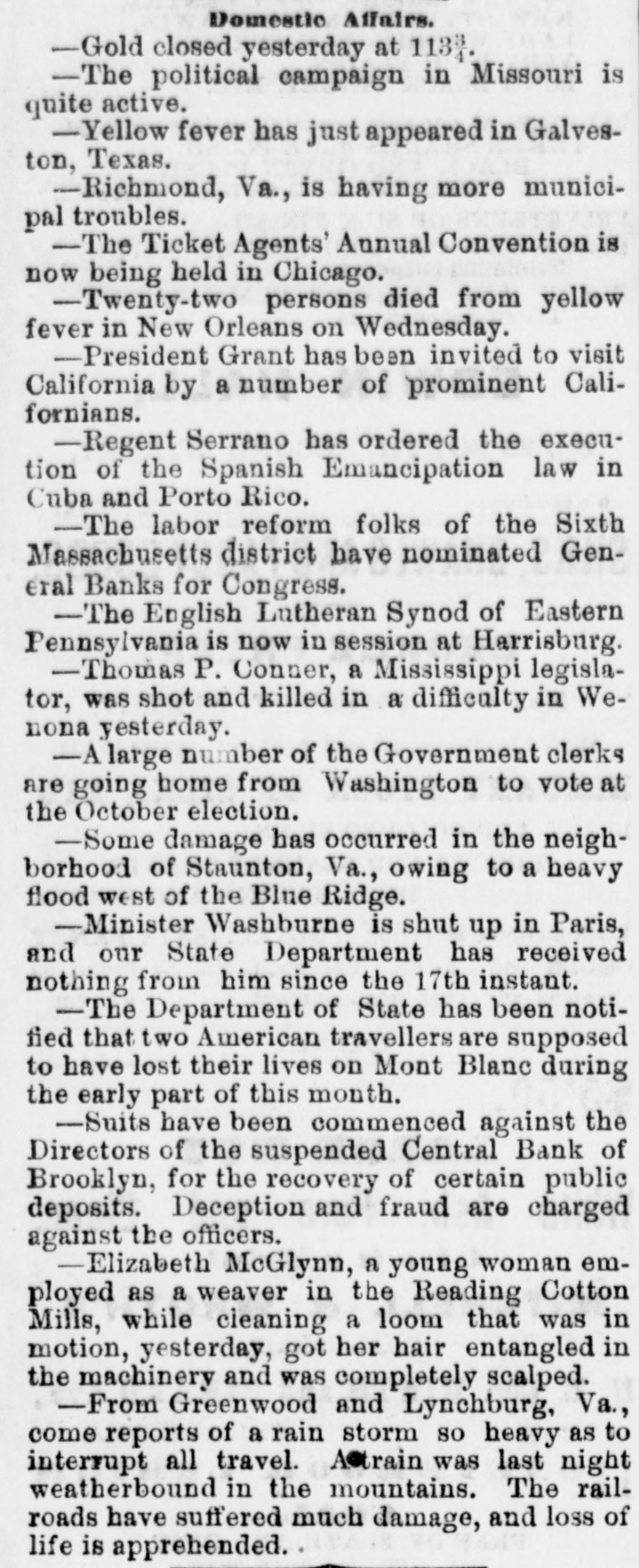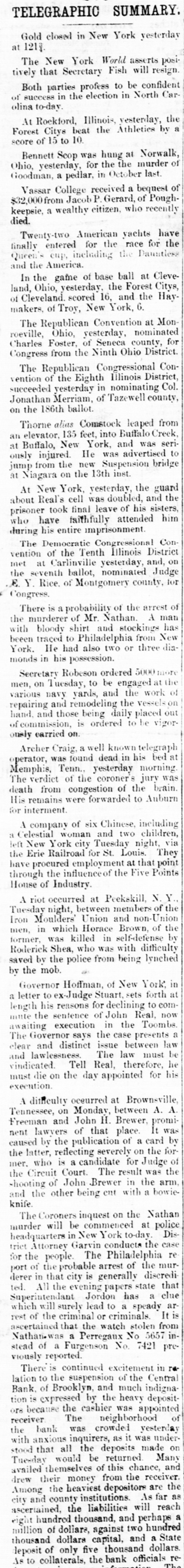 NEW-YORK CITY. The Société Alsaecinne-Lorraine, last month, aided 76 Alsacian and Lorrain immigrants, at an expense of $894. Protection and advice was afforded to 150 others at Castle Garden. Judge Tappen's decision commanding the Boards of Kings and Queens County Supervisors to collect their quota of the State deficiency tax will be reviewed before the general term of the Supreme Court at Brooklyn, in February. In the United States District Court, on Saturday in the collision case of Daniel Owen and others agst. The Brig Annie Lindsey. Judge Blatchford directed the entry of a decree for the libelants with costs, and the usual order of reference to ascertain damages. This decision establishes the rule that a brig being in the wind, and close hauled, "18 bound to keep her course." The Bloomingdale Turnverein, in its annual report just issued, shows that the organization numbers 150 members? and has a capital of $12,000. The Turn school, established by the society, is attended by 175 boys and 38 girls. The officers for the ensuing year are: First Andres; Second Speaker. Jos. Laber; Secretaries, Mylins and H. Ridder; Treasurer, Fr. Flocken and Ferd. Wieler; Instructors, Kessler and J. Gose: Librarian, Lev. Schurr; Trustees, Jos. Berndt H. Templer, and Fr. Flocken. It is understood that all the conductors of the Harlem Railroad have tendered their resignations, to take effect on Thursday next, the directors having issued a new order requiring them to keep check books of their receipts, and give punched ticket to each passenger paying fare. The conductors consider such an evidence of distrust of their honesty as too marked and humiliating to be quietly submitted to. Joseph H. Havens, a depositor in the late Central Bank (of Brooklyn, recovered, on Saturday, a judgment against the assigner for $3,125, the amount of a deposit made in the bank after it had become insolvent, the plaintiff being ignorant of the fact. Judge Pratt in his decision held that aside from any technical point it was clear that the officers of the bank, in receiving the check without disclosing the condition of the bank, committed fraud upon the plaintiff, and obtained therefore no title to the check in question. BROOKLYN. Arrests last week, 344; taxes collected, $121,139 73; deaths, 182. Under a new regulation of Sheriff Williams visitors to the jail are now searched. and all intoxicating liquors taken from them. Liberated thieves are also prohibited from visiting their companions in confinement. A serious dispute has occurred in the Mormon Church, in the Eastern District, and the adherents of Brigham Young have ejected a member of their society for openly condemning polygamy. The leaders have organized a new branch, and style The Recognized Church of Jesus Christ. They met in Cosmopolitan Hall, yesterday, and listened to an address from one of the saints on Polygamy an Abomination in the sight of God." Tax-Collector Burrows has persistently refused to obey the law, it is alleged, in relation to the prompt payment to the Treasurer of moneys collected for taxes, and has withheld a balance of $964,903 03 for unexplained reasons. Controller Schroeder addressed a communication to the Collector regarding the matter, on Saturday, and said deem it my duty to demand and hereby do demand that you forthwith pay over the Treasurer of the city the sum of $964,903 03 due to the city, and now withheld by you contrary to law." The Collector says that it utterly impossible to pay over the Treasurer on the day of receipt all tax money, and that though the Controller may demand as often as he pleases, it will make no difference to him. LONG ISLAND. RIVERHEAD.-Judge Reid will hold Surrogate's Court here to-day Charles Serrell of New Village was brought to the county jail for theft a few days since. SOUTHOLD.-A special town meeting is to be held here to decide whether the Legislature shall be asked for an act bonding the town in $10,000 for building a town hall. HEMPSTEAD.-The new Treasurer of Queens County has opened an office at Freeport. STATEN ISLAND. NEW-BRIGHTON. - A coroner's verdiet of death from natural causes was rendered in the case of John Fion, who, it was alleged, had been killed by one Wilton, a bar-tender in Castleton-ave. FACTORYVILLE-I firemen were testing their new steam-engine, on Saturday, Michael Gorman was struck and dangerously injured by the nozzle of the hose. At the same time a boy (Joseph Joice) was seriously scalded about the neck and legs by steam escaping from the boiler. HUDSON RIVER COUNTIES. YONKERS.- The authorities of the new city intend to apply to the Legislature for some amendments to their charter. The principal changes proposed are to make the State, county, city, and school taxes payable at one time and place, and that the sales of land for non-payment of taxes shall be held here instead of at White Plains-that the Receivers of Taxes and Assessors, with the consent or approval of the Common Council, shall be appointed by the Mayor. POUGHKEEPSIE.- The Hudson River ice-cutting is now actively going on. There are nearly 7,000 men and 1,000 horses gathering the ice. which averages 11 inches in thickness. They are taking in about 9,500 tuns per day. The crop for the season, it is estimated, will reach 1,500,000 tuns. and will all be gathered by Feb. 1. MORRIFANIA.-The following have been elected officers of the Morrisania Saving Bank for the ensuing year:Win. Cauldwell, President John McLaughlin, Vice-President; E. B. Fellows, Secretary; H. P. De Graaf, Treasurer. YORKTOWN.-Henry Paterson has been appointed Postmaster James H. Purdy resigned. NEW-JERSEY. JERSEY CITY.-N. T. Cummings of No. 42 Morris-st. has been arrested by a New- York detective, on a charge of complicity in the recent silk robbery at the Williams & Guion steamship wharf in New-York. A water-pipe attached to the boiler of a kitchen range in W. Lewis's residence in Summit-ave. exploded on Satfurday and demolished the range and the windows