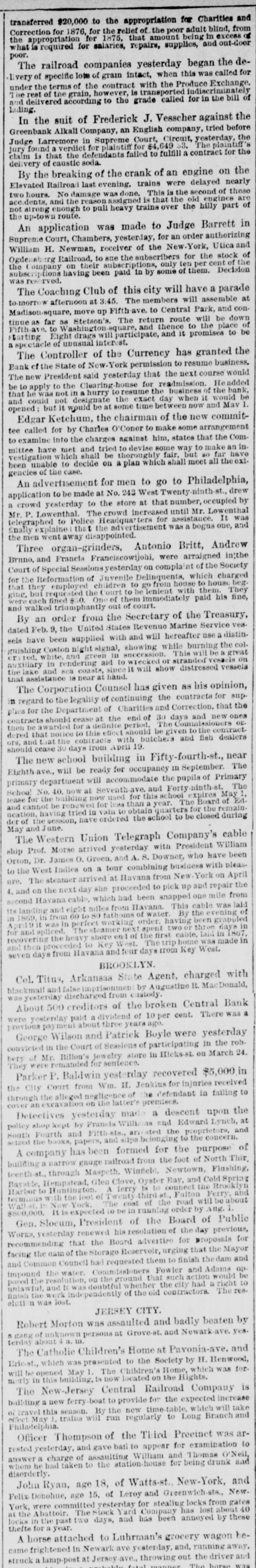 transferred $20,000 to the appropriation for Charities and Correction for 1876, for the relief of the poor adult blind, from of the appropriation for 1875, that amount being in excess what is required for salaries, repairs, supplies, and out-door poor. The railroad companies yesterday began the delivery of specific lote of grain intact, when this was called under the terms of the contract with the Produce Exchange, The rest of the grain, however, is transported indiscriminately of and delivered according to the grade called for in the bill lading. In the suit of Frederick J. Vesscher against the Greenbank Alkall Company, an English company, tried before Judge Larremore in Supreme Court, Circuit, yesterday, plaintiff's the The found verdict for plaintiff for $4,649 jury claim is that the defendants failed to fulfill a contract for the delivery of caustic soda. By the breaking of the crank of an engine on the Elevated Railroad last evening, trains were delayed nearly two hours No damage was done. This is the second of these accidents, and the reason assigned that the old engines are of not strong enough to pull heavy trains over the hilly part the up-town route. An application was made to Judge Barrett in Supreme Court, Chambers, yesterday, for an order authorizing William H. Newman, receiver of the New-York, Utica and Ogdensburg Railroad, to ane the subscribers for the stock of the Company on their subscriptions, only ten per cent Decision of the subscriptions having been paid in by some of them. was reserved. The Coaching Club of this city will have a parade to-morrow afternoon at 3:45. The members will assemble at Madison-square, move up Fifth ave. to Central Park, and con tinue as far 38 Stetson's The return route will the be place down Fifth-ave to Fashington- square, and thence to be starting Eight will participate, and it promises to a spectacle of unusual interest. The Controller of the Currency has granted the Bank of the State of New-York permission to resume business. The new President said yesterday that the next course would be to apply to the Clearing house for readmission. He added that he was not in hurry to resume the business of the bank and could not designate the exact day when it would be opened ; but it would be at some time bet een now and May 1. Edgar Ketchum, the chairman of the new committee called for by Charles O'Conor to make some arrangement to examine into the charges against him, states that the Committee have met and tried to devise some way to make an investigation which shall be thoroughly fair, but so far have been unable to decide on a plan which shall meet all the exigencies of the case. An advertisement for men to go to Philadelphia, application to be made at No. 243 West Twenty ninth-st., drew a crowd yesterday to the store at that number, occupied by Mr. P. Lowenthal. The crowd increased until Mr. Lowenthal to Police Headquarters for assistance. It was telegraphed finally explaine that the ertisement was bogus one, and the men went away disappointed. Three organ-grinders, Autonio Britt, Andrew Bruno, and Francis Franciscowijohi, were arraigned in'the Court of Special Sessions yesterday on complaint of the Society for the Reformation of Juvenile Delinquents, which charged to house b house from that they requested employee the children Court to be lenient with them. They ging, each fined $30. One of them immediately paid his fine, and walked triumphantly out of court. By an order from the Secretary of the Treasury. dated Feb. 9, the United States Revenue Marine Service veasels have been supplied with and will hereafter use a distinguishing Coston night signal, showing while burning be the great colersed, white and green in succession. This will auxiliary in rendering aid to wrecked or stranded vesaels on lake and sea coasts, since it will show distressed vessels that assistance is near at hand. The Corporation Counsel has given as his opinion, n regard to the legality of continuing the contracta for supplics for the Department of Charities and Correction. that the contracts should cease at the end of 30 days and new ones OF then for definite period. The that notice to this effect should be given to the contract the contracts with butchers and fish dealers ors,and that should cease 30 days from April 19. The new school building in Fifty-fourth-st., near Eighth-ave. will be ready for occupancy in September The primary department will accommodate the pupila of Primary School No. 40. now at Seventh ave aud Forty -ninth-st. May The lease for the bilding now used for this school The expires Board of Ed be renewe for less than year. and cannot vain to obtain quarters for the remain cation, aving tried have in ordered the school to be closed during der of the session, May and June. The Western Union Telegraph Company's cable ship Prof. Morse arrived yesterday with President William Orton, Dr. James O. Green and A. S. Downer, who have been to the West Indies on a tour combining business with please are. The steamer arrived at Havana from New York on April 4. and on the next day she proceeded to pick up and repair the second avana cable, which had been snapped one mile from and eight miles from Havana. This cable was laid landing from 60 to 80 fath oms of water By the evening of was In perfect working order. having two or been three grappled days in spent next steamer The heavy shore end of the first cable, laid in 1867, recovering the to Key West. The trip home was made in seven days from Havana and four days from Key West. BROOKLYN. Col. Titus, Arkansas State Agent, charged with blackmail by Augustine R. Ma Donald, as yesterday discharged from citatody. About 500 creditors of the broken Central Bank were yesterday paid a dividend of 10 per cent. There was a previous payment about three years George Wilson and Patrick Boyl were yesterday convicted in the Court of Seasions of participating in the rob bery of Mr. Billon's Jewelry store in Hicks-st. ou March 24. 