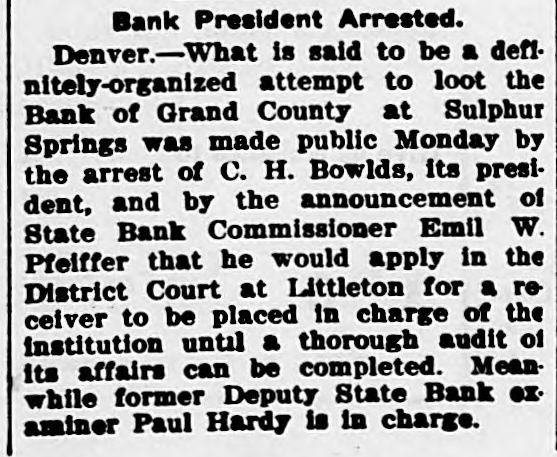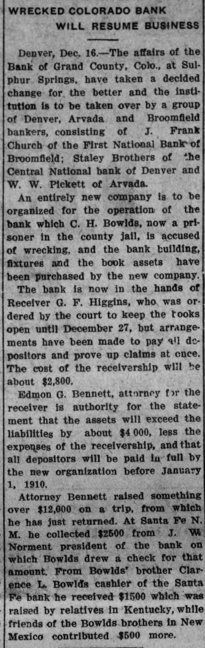 WRECKED COLORADO BANK WILL RESUME BUSINESS Denver, Dec. 16.-The affairs of the Bank of Grand County, Colo., at Sulphur Springs, have taken a decided change for, the better and the institution is to be taken over by a group of Denver, Arvada and Broomfield bankers, consisting of J. Frank Church of the First National Bank of Broomfield; Staley Brothers of the Central National bank of Denver and W. W. Pickett of Arvada. An entirely new company is to be organized for the operation of the bank which C. H. Bowlds, now a prisoner in the county jail, is accused of wrecking, and the bank building, fixtures and the book assets have been purchased by the new company. The bank is now in the hands of Receiver G. F. Higgins, who was or. dered by the court to keep the rooks open until December 27, but arrangements have been made to pay all depositors and prove up claims at once. The cost of the receivership will be about $2,800. Edmon G. Bennett, attorney for the receiver is authority for the statement that the assets will exceed the liabilities by about $4 000, less the expenses of the receivership, and that all depositors will be paid in full by the new organization before January 1, 1910. Attorney Bennett raised something over $12,000 on a trip, from which he has just returned. At Santa Fe N. M. he collected $2500 from J. W Norment president of the bank on which Bowlds drew a check for that amount. From Bowlds' brother Clarence L. Bowlds cashier of the Santa Fe bank he received $1500 which was raised by relatives in Kentucky, while friends of the Bowlds brothers in New Mexico contributed $500 more.