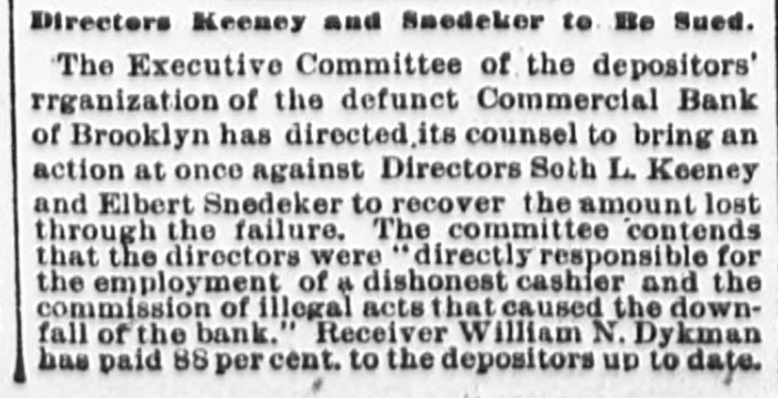 # Directors Keeney and Snedeker to Be Sued. The Executive Committee of the depositors' organization of the defunct Commercial Bank of Brooklyn has directed its counsel to bring an action at once against Directors Soth L. Keeney and Elbert Snedeker to recover the amount lost through the failure. The committee contends that the directors were "directly responsible for the employment of a dishonest cashier and the commission of illegal acts that caused the downfall of the bank." Receiver William N. Dykman has paid 88 per cent. to the depositors up to date.