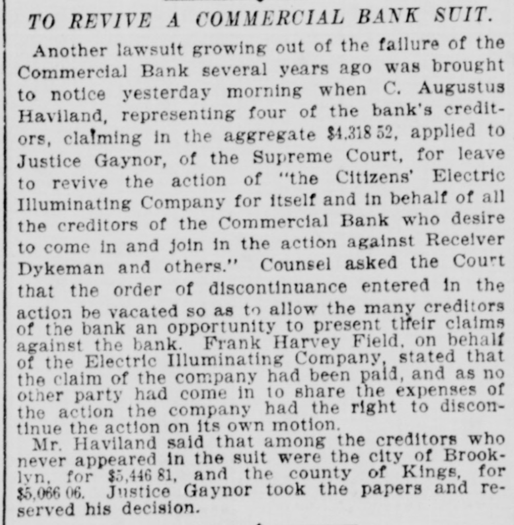 # TO REVIVE A COMMERCIAL BANK SUIT. Another lawsuit growing out of the failure of the Commercial Bank several years ago was brought to notice yesterday morning when C. Augustus Haviland, representing four of the bank's creditors, claiming in the aggregate $4,318 52, applied to Justice Gaynor, of the Supreme Court, for leave to revive the action of "the Citizens' Electric Illuminating Company for itself and in behalf of all the creditors of the Commercial Bank who desire to come in and join in the action against Receiver Dykeman and others." Counsel asked the Court that the order of discontinuance entered in the action be vacated so as to allow the many creditors of the bank an opportunity to present their claims against the bank. Frank Harvey Field, on behalf of the Electric Illuminating Company, stated that the claim of the company had been paid, and as no other party had come in to share the expenses of the action the company had the right to discontinue the action on its own motion. Mr. Haviland said that among the creditors who never appeared in the suit were the city of Brooklyn, for $5,446 81, and the county of Kings, for $5,066 06. Justice Gaynor took the papers and reserved his decision.