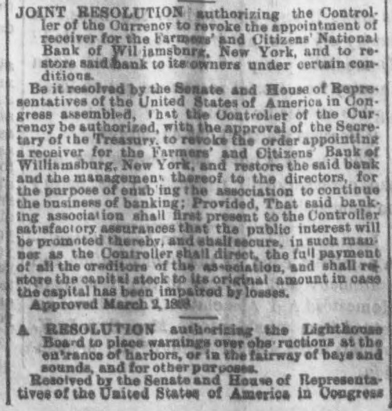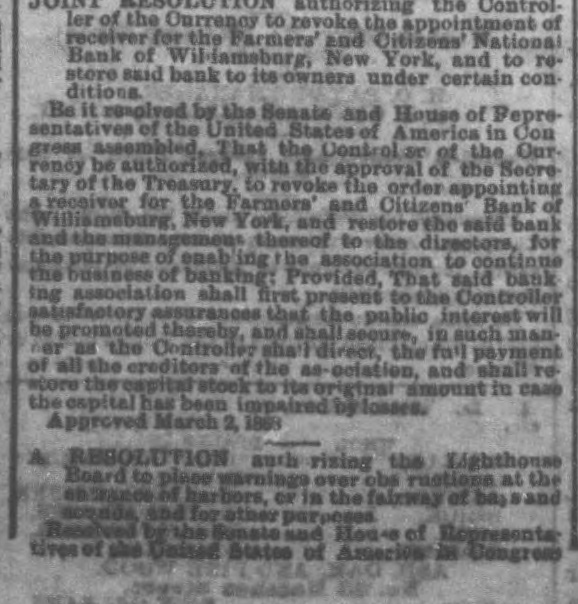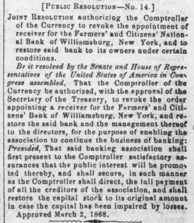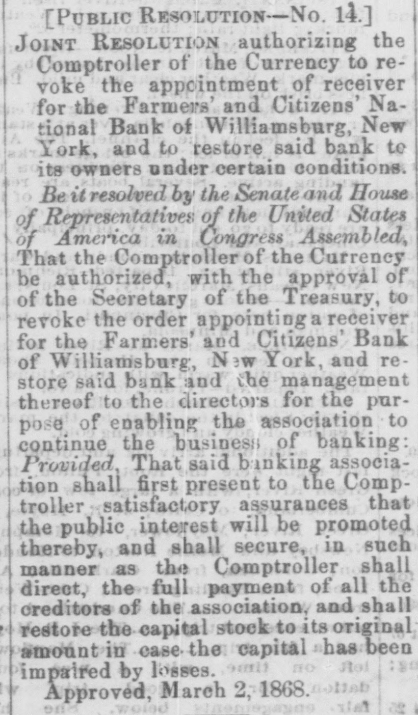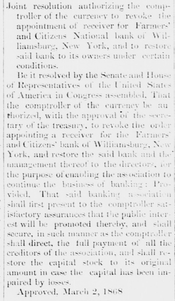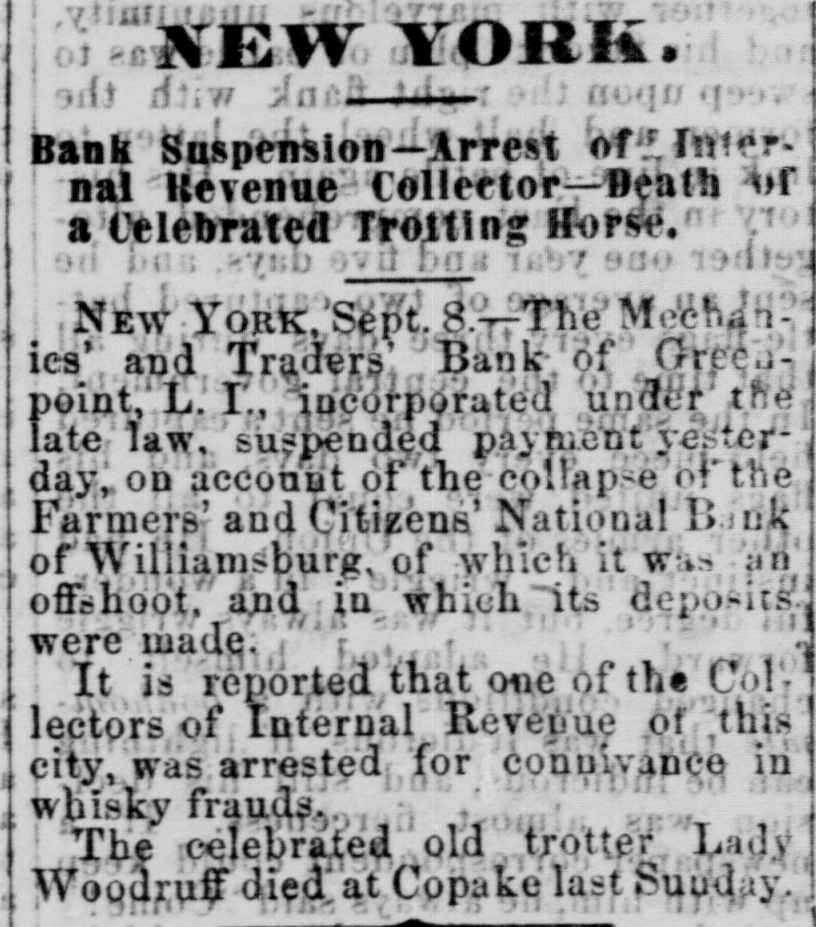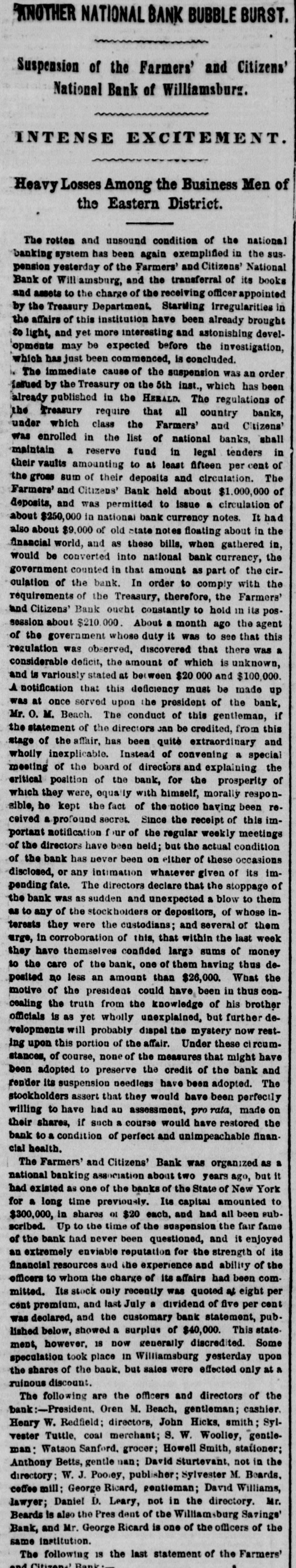 ANOTHER NATIONAL BANK BUBBLE BURST. Suspension of the Farmers' and Citizens' National Bank of Williamsburg. INTENSE EXCITEMENT. Heavyl Losses Among the Business Men of the Eastern District. The rotten and unsound condition of the national banking system has been again exemplified in the suspension yesterday of the Farmers' and Citizens' National Bank of Will amsburg, and the transferral of its books and assets to the charge of the receiving officer appointed by the Treasury Department. Starting irregularities in the affairs of this institution have been already brought to light, and yet more interesting and astonishing developments may be expected before the investigation, which has just been commenced, is concluded. is The immediate cause of the suspension was an order islued by the Treasury on the 5th inst., which has been already published in the HERALD. The regulations of the Treasury require that all country banks, under which class the Farmers' and Citizens' was enrolled in the list of national banks, shall maintain a reserve fund in legal tenders in their vaults amounting to at least fifteen per cent of the gross sum of their deposits and circulation. The Farmers' and Citizens' Bank held about $1.000,000 of deposits, and was permitted to issue a circulation of about $250,000 in national bank currency notes. It had also about $9.000 of old state notes floating about in the financial world, and as these bills, when gathered in, would be converted into national bank currency, the government counted in that amount as part of the ciroulation of the bank. In order to comply with the requirements of the Treasury, therefore, the Farmers' and Citizens' Bank ought constantly to hold in its possession about $210.000. About a month ago the agent of the government whose duty it was to see that this regulation was observed, discovered that there was a considerable deficit, the amount of which is unknown, and is variously stated at between $20.00 and $100,000. A notification that this deficiency must be made up was at once served upon the president of the bank, Mr. O. M. Beach. The conduct of this gentleman, if the statement of the directors Jan be credited, from this stage of the affair, has been quité extraordinary and wholly inexplicable. Instead of convening a special meeting of the board of directors and explaining the critical position of the bank, for the prosperity of which they were, equally with himself, morally responsible, he kept the fact of the notice having been received a profound secret. Since the receipt of this important notification ur of the regular weekly meetings of the directors have been beld; but the actual condition of the bank has never been on either of these occasions disclosed, or any intimation whatever given of its impending fate. The directors declare that the stoppage of the bank was as sudden and unexpected a blow to them as to any of the stockholders or depositors, of whose interests they were the custodians; and several of them urge, in corroboration of this, that within the last week they have themselves confided larga sums of money to the care of the bank, one of them having thus deposited no less an amount than $26,000. What the motive of the president could have been in thus concealing the truth from the knowledge of his brother officials is as yet wholly unexplained, but further developments will probably dispel the mystery now resting upon this portion of the affair. Under these cl rcumstances, of course, none of the measures that might have been adopted to preserve the credit of the bank and render its suspension needless have been adopted. The stockholders assert that they would have been perfectly willing to have had an assessment, pro rata, made on their shares, if such a course would have restored the bank to a condition of perfect and unimpeachable finan. cial health. The Farmers' and Citizens' Bank was organized as a national banking association about two years ago, but it had existed as one of the banks of the State of New York for a long time previously. Its capital amounted to $300,000, in shares of $20 each, and had all been subscribed. Up to the time of the suspension the fair fame of bank had never been questioned, and it enjoyed an enviable reputation for its and the experience and the financial the extremely resources the strength ability of of officers to whom the charge of its affairs had been committed. Its stock only recently was quoted at eight per cent and last July a dividend of five per cent was and the customary bank pub. declared, premium. $40,000. statement, This state. lished below, showed a surplus of 18 now generally took place in Williamsburg upon speculation ment, however, discredited. effected yesterday only Some at the shares of the bank. but sales were a ruinous discount. The following are the officers and directors of the bank:-President. Oren M. Beach, gentleman; cashier. Henry W. Redfield; directors, John Hicks, smith; Sylvester Tuttle, coal merchant; S. W. Woolley, gentleman: Watson Sanford. grocer; Howell Smith, stationer; Anthony Betts, gentle nan; David Sturtevant, not in the directory W. J. Pooley, publisher; Sylvester M. Boards. coffee mill; George Ricard, gentleman; David Williams, lawyer; Daniel D. Leary, not in the directory. Mr. Beards is also the Pres dent of the Williamsburg Savings' Bank, and Mr. George Ricard is one of the officers of the same institution. The following 18 the last statement of the Farmers' Citizen