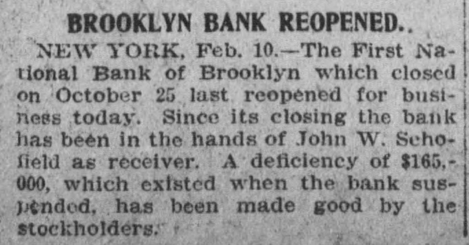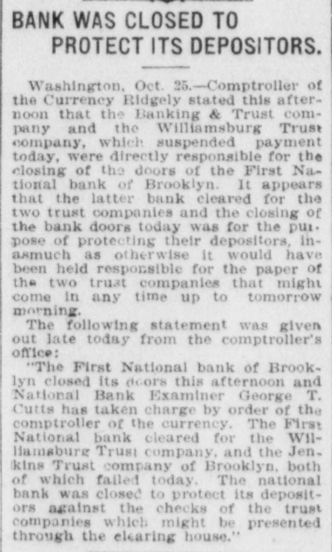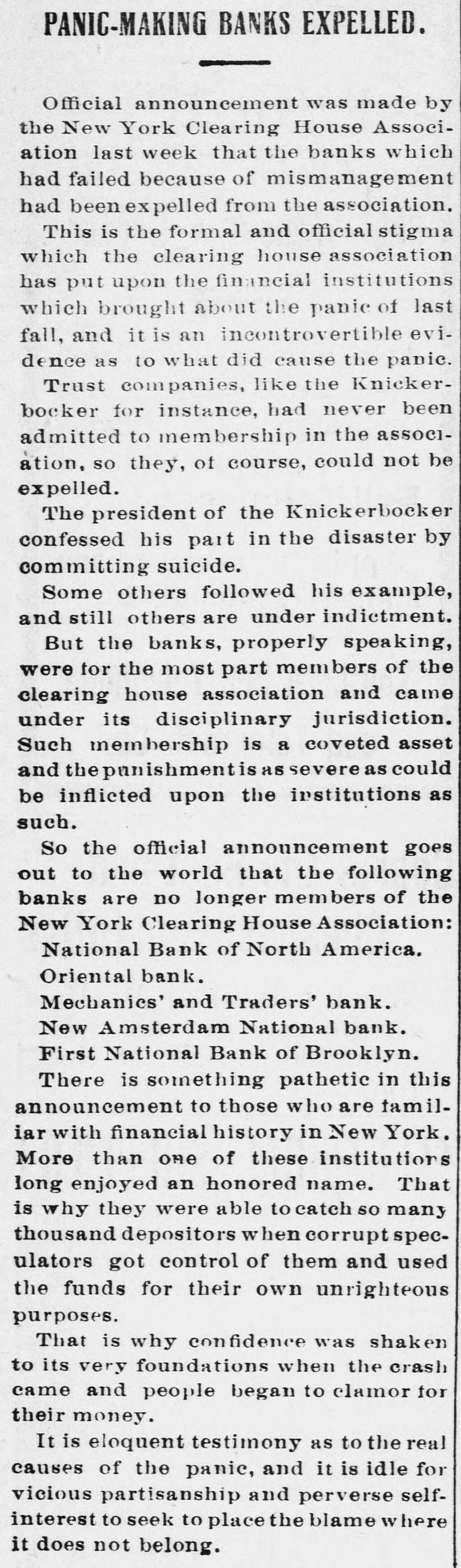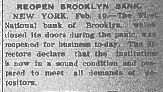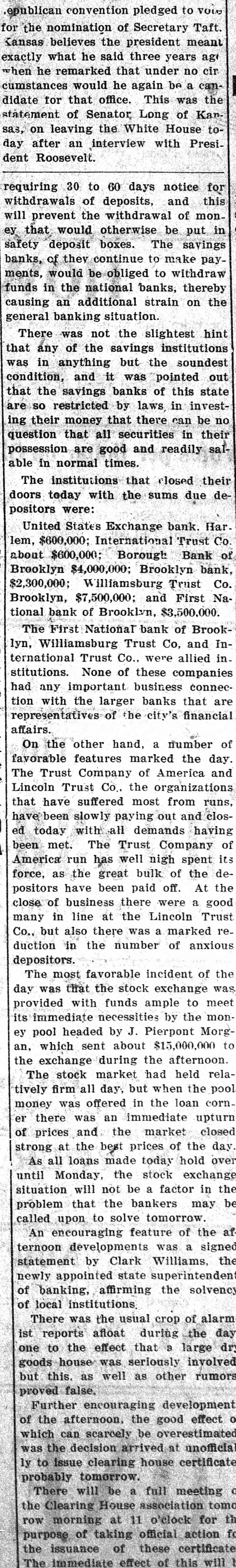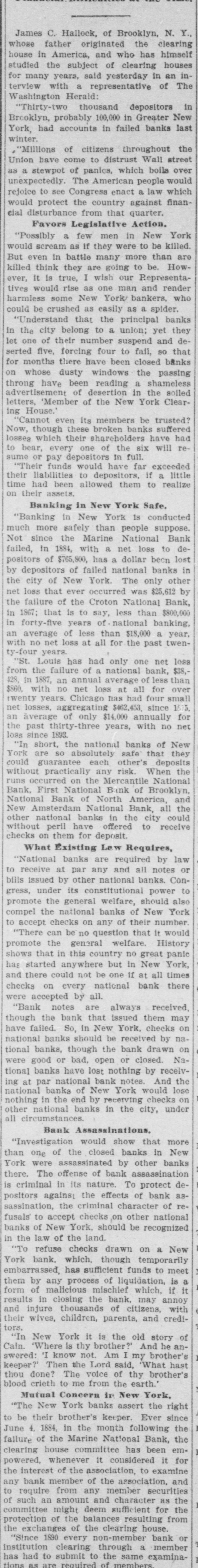 James C. Hallock, of Brooklyn, whose father originated the clearing house in America, and who has himself studied the subject of clearing houses for many years, said yesterday in an interview with a representative of The Washington Herald: "Thirty-two thousand depositors in Brooklyn, probably 100,000 in Greater New York, had accounts in failed banks last winter. of the "Millions have citizens distrust throughout Wall Union come to street as a stewpot of panics, which boils over unexpectedly. The American people would rejoice to see Congress enact a law which would protect the country against financial disturbance from that quarter. Favors Legislative Action. a few men in New York scream as If were to killed. would "Possibly they be than But even in battle many more are killed think they are going to be. However, it is true, I wish our Representatives would rise as one man and render harmless some New York/ bankers, who could be crushed as easily as a spider. "Understand that the principal banks in the city belong to a union; yet they let one of their number suspend and deserted five, forcing four to fail, so that for months there have been closed banks on whose dusty windows the passing throng have been reading a shameless advertisement of desertion in the soiled letters, 'Member of the New York Clearing House. "Cannot even its members be trusted? Now, though these broken banks suffered losses which their shareholders have had to bear, every one of the six will resume or pay depositors in full. "Their funds would have far exceeded their liabilities to depositors. if a little time had been allowed them to realize on their assets. Banking in New York Safe. in New York is conducted more safely than suppose. much "Banking since people National Not the Marine Bank failed, in 1884, with a net loss to depositors of $765,800, has a dollar been lost by depositors of failed national banks in the city of New York. The only other net loss that ever occurred was $25,612 by the failure of the Croton National Bank, 1867; that is to say, less than $800,000 years of of less than a year, in in an forty-five average national $18,000 banking, with no net loss at all for the past twenty-four years. "St. Louis has had only one net loss from the failure of a national bank, $38.428, in 1887, an annual average of less than $860. with no net loss at all for over twenty years. Chicago has had four small aggregating $462,453 since 1675. for of only $14,000 thirty-three years, no net net an the average losses, past annually with loss since 1893. "In short, the national banks of New York are so absolutely safe that they could guarantee each other's deposits without practically any risk. When the occurred on the Mercantile National runs Bank, First National Bank of Brooklyn, National Bank of North America, and New Amsterdam National Bank, all the other national banks in the city receive could without peril have offered to checks on them for deposit. What Existing Lew Requires, "National banks are required by law at par any and all notes or by other national to bills to receive issued banks. power Conunder its constitutional gress, promote the general welfare, should also compel the national banks of New York to accept checks on any of their number. "There can be no question that it would promote the general welfare. History shows that in this country no great panic anywhere but in New York, could not be one if at has and there started bank all there times checks on every national were accepted by all. "Bank notes are always received, bank that issued them may So, in New York, na- on banks should be though the national have though failed. the received bank checks drawn by on or bad, open or banks have lost nothing the tional were tional good banks, notes. closed. by And receiv- Nspar national bank would lose New on receiving national ing nothing at in banks the end of by York checks under other national banks in the city, all circumstances. Bank Assassinations. "Investigation would show that more New of the closed banks in banks than one assassinated by other York were The offense of bank assassination dethere. in its nature. To protect is criminal against the effects of bank of as- repositors the criminal character national sassination, accept checks on other recognized banks fusals' of to New York, should be the law of the land. New in refuse checks drawn temporarily on a "To bank. which, though meet York has sufficient funds to is a them by mischief embarrassed, any process of liquidation, which, if it form of malicious the bank, may annoy results in closing thousands of citizens, credi- with and their injure wives, children, parents, and of tors. "In New York thy it brother?" is the old And story he anCain. 'Where know is not. Am my What brother's hast swered: 'I the Lord said, keeper?' Then voice of thy brother's from the blood thou done? crieth to The me earth. York, Concern in New Mutual New York banks assert the since right "The their brother's keeper. following Ever the to be 1884, in the month the June 4. Marine National Bank, emfailure committee has for clearing of house the considered been it whenever it examine the interest of the powered, of the association, to and the any bank member from any member association, securities as to require amount and character for the committee might resulting the of protection such exchanges an of the of balances deem clearing sufficient house. bank from or the every non-member member same institution "Since 1890 submit clearing to through the members a examinahas had to of are as required tions