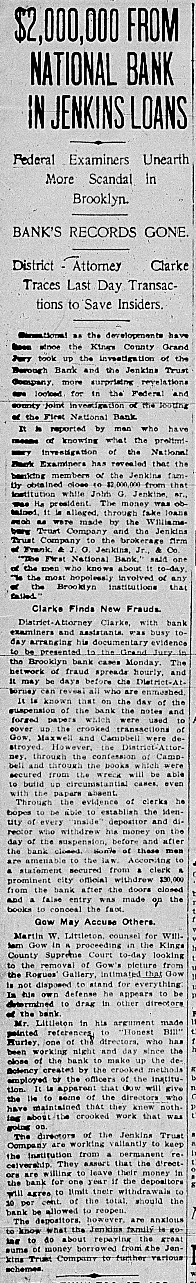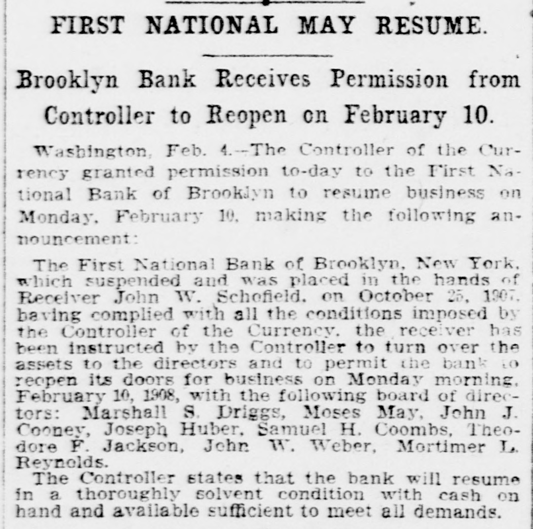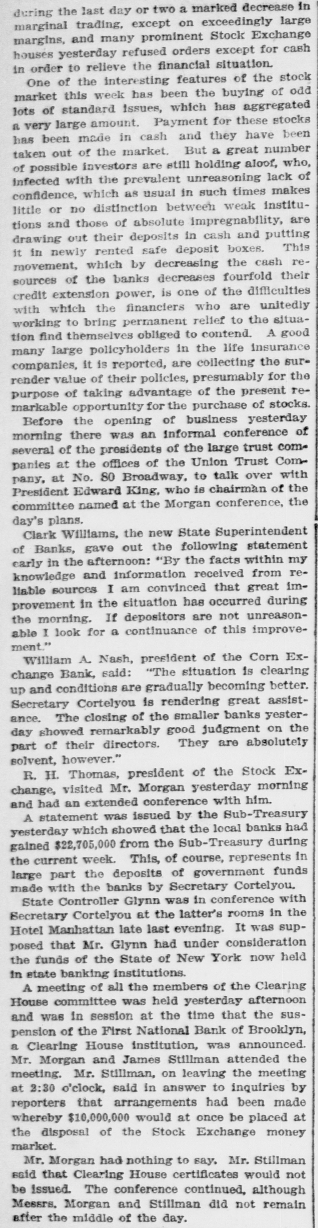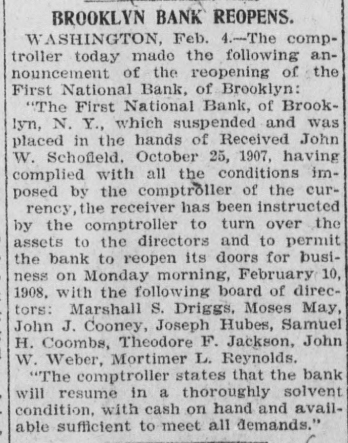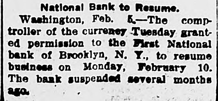 James C. Hallock, of Brooklyn, whose father originated the clearing house in America, and who has himself studied the subject of clearing houses for many years, said yesterday in an interview with a representative of The Washington Herald: "Thirty-two thousand depositors in Brooklyn, probably 100,000 in Greater New York, had accounts in failed banks last winter. of the "Millions have citizens distrust throughout Wall Union come to street as a stewpot of panics, which boils over unexpectedly. The American people would rejoice to see Congress enact a law which would protect the country against financial disturbance from that quarter. Favors Legislative Action. a few men in New York scream as If were to killed. would "Possibly they be than But even in battle many more are killed think they are going to be. However, it is true, I wish our Representatives would rise as one man and render harmless some New York/ bankers, who could be crushed as easily as a spider. "Understand that the principal banks in the city belong to a union; yet they let one of their number suspend and deserted five, forcing four to fail, so that for months there have been closed banks on whose dusty windows the passing throng have been reading a shameless advertisement of desertion in the soiled letters, 'Member of the New York Clearing House. "Cannot even its members be trusted? Now, though these broken banks suffered losses which their shareholders have had to bear, every one of the six will resume or pay depositors in full. "Their funds would have far exceeded their liabilities to depositors. if a little time had been allowed them to realize on their assets. Banking in New York Safe. in New York is conducted more safely than suppose. much "Banking since people National Not the Marine Bank failed, in 1884, with a net loss to depositors of $765,800, has a dollar been lost by depositors of failed national banks in the city of New York. The only other net loss that ever occurred was $25,612 by the failure of the Croton National Bank, 1867; that is to say, less than $800,000 years of of less than a year, in in an forty-five average national $18,000 banking, with no net loss at all for the past twenty-four years. "St. Louis has had only one net loss from the failure of a national bank, $38.428, in 1887, an annual average of less than $860. with no net loss at all for over twenty years. Chicago has had four small aggregating $462,453 since 1675. for of only $14,000 thirty-three years, no net net an the average losses, past annually with loss since 1893. "In short, the national banks of New York are so absolutely safe that they could guarantee each other's deposits without practically any risk. When the occurred on the Mercantile National runs Bank, First National Bank of Brooklyn, National Bank of North America, and New Amsterdam National Bank, all the other national banks in the city receive could without peril have offered to checks on them for deposit. What Existing Lew Requires, "National banks are required by law at par any and all notes or by other national to bills to receive issued banks. power Conunder its constitutional gress, promote the general welfare, should also compel the national banks of New York to accept checks on any of their number. "There can be no question that it would promote the general welfare. History shows that in this country no great panic anywhere but in New York, could not be one if at has and there started bank all there times checks on every national were accepted by all. "Bank notes are always received, bank that issued them may So, in New York, na- on banks should be though the national have though failed. the received bank checks drawn by on or bad, open or banks have lost nothing the tional were tional good banks, notes. closed. by And receiv- Nspar national bank would lose New on receiving national ing nothing at in banks the end of by York checks under other national banks in the city, all circumstances. Bank Assassinations. "Investigation would show that more New of the closed banks in banks than one assassinated by other York were The offense of bank assassination dethere. in its nature. To protect is criminal against the effects of bank of as- repositors the criminal character national sassination, accept checks on other recognized banks fusals' of to New York, should be the law of the land. New in refuse checks drawn temporarily on a "To bank. which, though meet York has sufficient funds to is a them by mischief embarrassed, any process of liquidation, which, if it form of malicious the bank, may annoy results in closing thousands of citizens, credi- with and their injure wives, children, parents, and of tors. "In New York thy it brother?" is the old And story he anCain. 'Where know is not. Am my What brother's hast swered: 'I the Lord said, keeper?' Then voice of thy brother's from the blood thou done? crieth to The me earth. York, Concern in New Mutual New York banks assert the since right "The their brother's keeper. following Ever the to be 1884, in the month the June 4. Marine National Bank, emfailure committee has for clearing of house the considered been it whenever it examine the interest of the powered, of the association, to and the any bank member from any member association, securities as to require amount and character for the committee might resulting the of protection such exchanges an of the of balances deem clearing sufficient house. bank from or the every non-member member same institution "Since 1890 submit clearing to through the members a examinahas had to of are as required tions