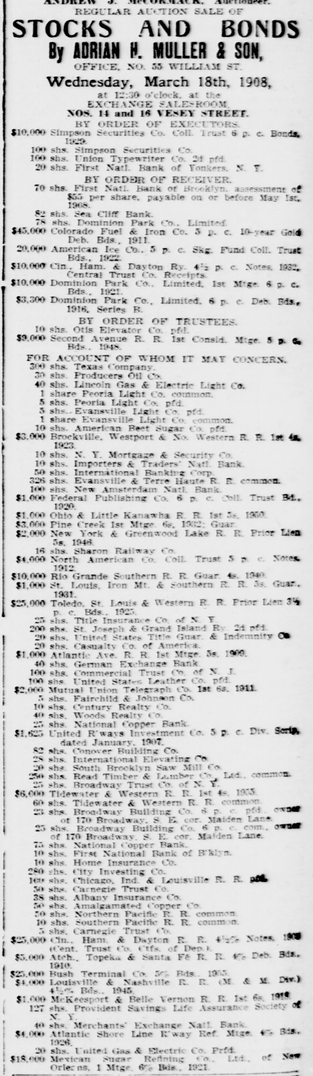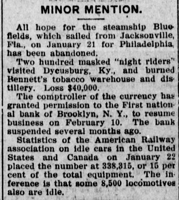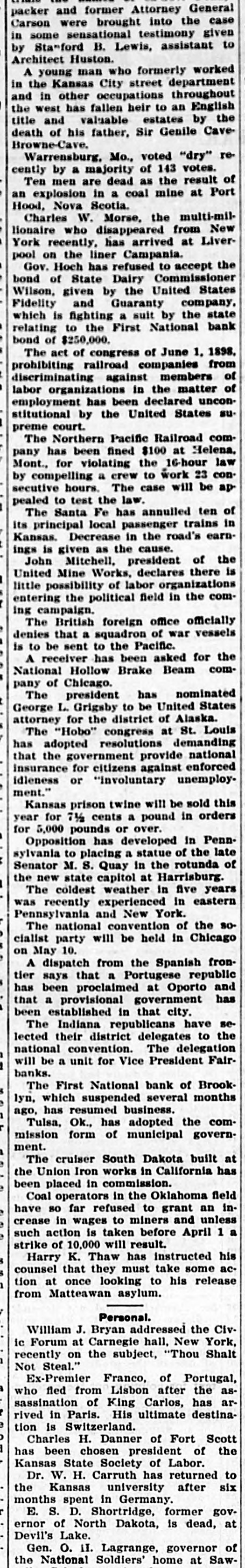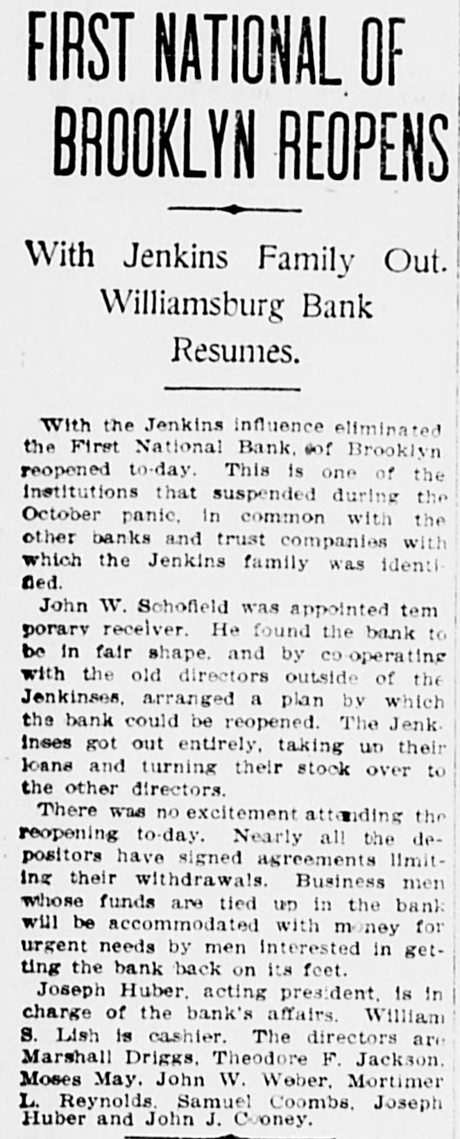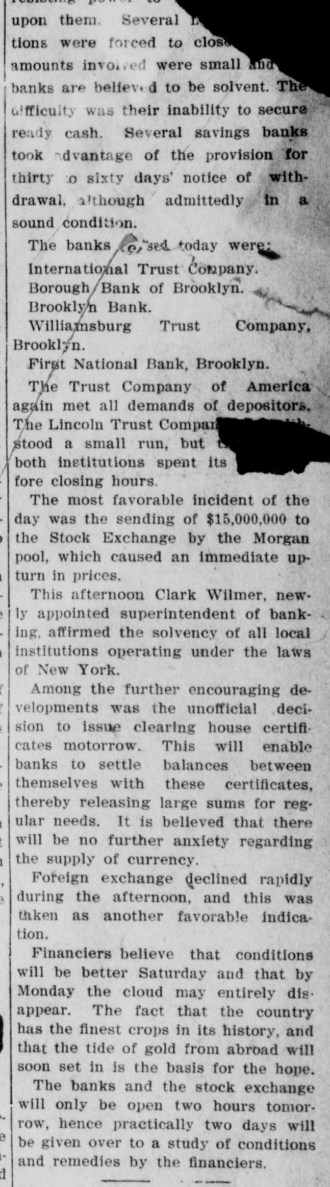 James C. Hallock, of Brooklyn, whose father originated the clearing house in America, and who has himself studied the subject of clearing houses for many years, said yesterday in an interview with a representative of The Washington Herald: "Thirty-two thousand depositors in Brooklyn, probably 100,000 in Greater New York, had accounts in failed banks last winter. of the "Millions have citizens distrust throughout Wall Union come to street as a stewpot of panics, which boils over unexpectedly. The American people would rejoice to see Congress enact a law which would protect the country against financial disturbance from that quarter. Favors Legislative Action. a few men in New York scream as If were to killed. would "Possibly they be than But even in battle many more are killed think they are going to be. However, it is true, I wish our Representatives would rise as one man and render harmless some New York/ bankers, who could be crushed as easily as a spider. "Understand that the principal banks in the city belong to a union; yet they let one of their number suspend and deserted five, forcing four to fail, so that for months there have been closed banks on whose dusty windows the passing throng have been reading a shameless advertisement of desertion in the soiled letters, 'Member of the New York Clearing House. "Cannot even its members be trusted? Now, though these broken banks suffered losses which their shareholders have had to bear, every one of the six will resume or pay depositors in full. "Their funds would have far exceeded their liabilities to depositors. if a little time had been allowed them to realize on their assets. Banking in New York Safe. in New York is conducted more safely than suppose. much "Banking since people National Not the Marine Bank failed, in 1884, with a net loss to depositors of $765,800, has a dollar been lost by depositors of failed national banks in the city of New York. The only other net loss that ever occurred was $25,612 by the failure of the Croton National Bank, 1867; that is to say, less than $800,000 years of of less than a year, in in an forty-five average national $18,000 banking, with no net loss at all for the past twenty-four years. "St. Louis has had only one net loss from the failure of a national bank, $38.428, in 1887, an annual average of less than $860. with no net loss at all for over twenty years. Chicago has had four small aggregating $462,453 since 1675. for of only $14,000 thirty-three years, no net net an the average losses, past annually with loss since 1893. "In short, the national banks of New York are so absolutely safe that they could guarantee each other's deposits without practically any risk. When the occurred on the Mercantile National runs Bank, First National Bank of Brooklyn, National Bank of North America, and New Amsterdam National Bank, all the other national banks in the city receive could without peril have offered to checks on them for deposit. What Existing Lew Requires, "National banks are required by law at par any and all notes or by other national to bills to receive issued banks. power Conunder its constitutional gress, promote the general welfare, should also compel the national banks of New York to accept checks on any of their number. "There can be no question that it would promote the general welfare. History shows that in this country no great panic anywhere but in New York, could not be one if at has and there started bank all there times checks on every national were accepted by all. "Bank notes are always received, bank that issued them may So, in New York, na- on banks should be though the national have though failed. the received bank checks drawn by on or bad, open or banks have lost nothing the tional were tional good banks, notes. closed. by And receiv- Nspar national bank would lose New on receiving national ing nothing at in banks the end of by York checks under other national banks in the city, all circumstances. Bank Assassinations. "Investigation would show that more New of the closed banks in banks than one assassinated by other York were The offense of bank assassination dethere. in its nature. To protect is criminal against the effects of bank of as- repositors the criminal character national sassination, accept checks on other recognized banks fusals' of to New York, should be the law of the land. New in refuse checks drawn temporarily on a "To bank. which, though meet York has sufficient funds to is a them by mischief embarrassed, any process of liquidation, which, if it form of malicious the bank, may annoy results in closing thousands of citizens, credi- with and their injure wives, children, parents, and of tors. "In New York thy it brother?" is the old And story he anCain. 'Where know is not. Am my What brother's hast swered: 'I the Lord said, keeper?' Then voice of thy brother's from the blood thou done? crieth to The me earth. York, Concern in New Mutual New York banks assert the since right "The their brother's keeper. following Ever the to be 1884, in the month the June 4. Marine National Bank, emfailure committee has for clearing of house the considered been it whenever it examine the interest of the powered, of the association, to and the any bank member from any member association, securities as to require amount and character for the committee might resulting the of protection such exchanges an of the of balances deem clearing sufficient house. bank from or the every non-member member same institution "Since 1890 submit clearing to through the members a examinahas had to of are as required tions