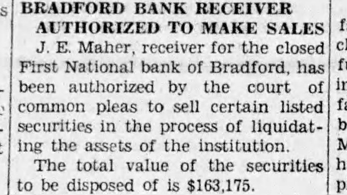BRADFORD BANK RECEIVER AUTHORIZED TO MAKE SALES receiver for the closed National bank Bradford, been authorized by court common pleas to sell listed securities in the of liquidatthe the institution. The total value of the securities be disposed $163,175.