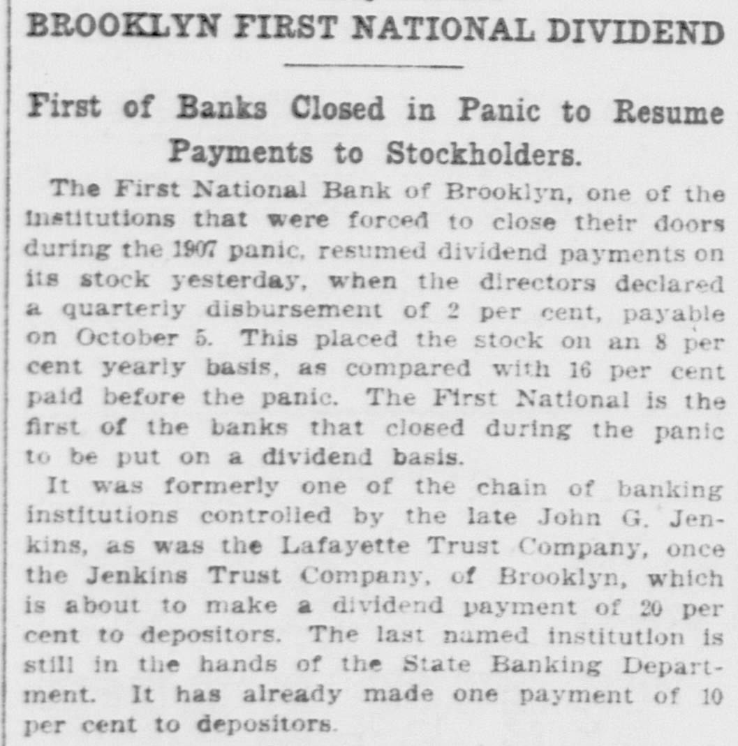 BROOKLYN FIRST NATIONAL DIVIDEND First of Banks Closed in Panic to Resume Payments to Stockholders. The First National Bank of Brooklyn, one of the institutions that were forced to close their doors during the 1907 panic, resumed dividend payments on its stock yesterday, when the directors declared a quarterly disbursement of 2 per cent, payable on October 5. This placed the stock on an 8 per cent yearly basis, as compared with 16 per cent paid before the panic. The First National is the first of the banks that closed during the panic to be put on a dividend basis. It was formerly one of the chain of banking institutions controlled by the late John G. Jenkins, as was the Lafayette Trust Company, once the Jenkins Trust Company, of Brooklyn, which is about to make a dividend payment of 20 per cent to depositors. The last named institution is still in the hands of the State Banking Department. It has already made one payment of 10 per cent to depositors.