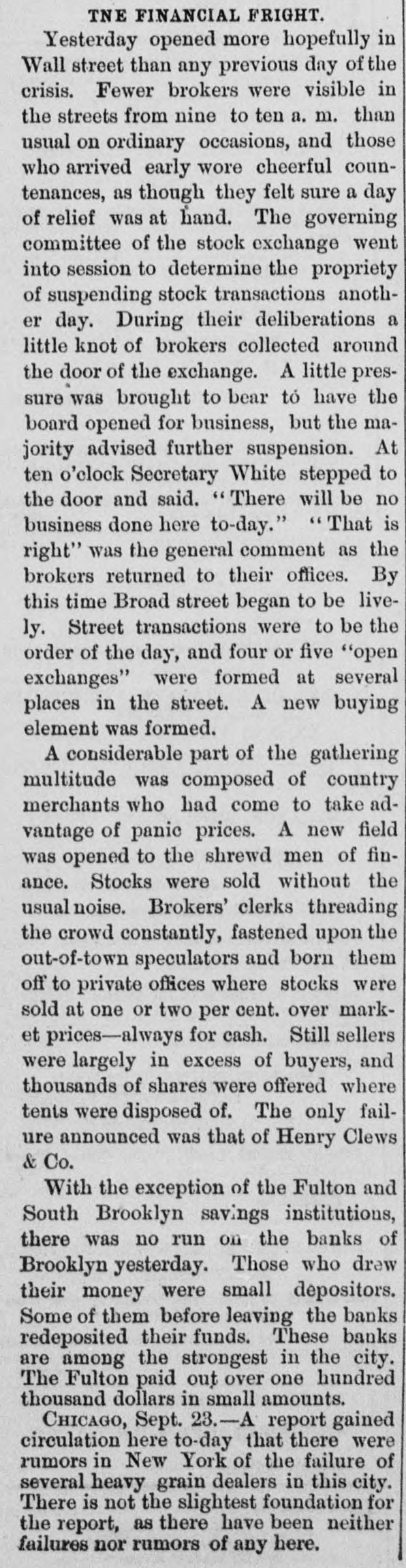 TNE FINANCIAL FRIGHT. Yesterday opened more hopefully in Wall street than any previous day of the crisis. Fewer brokers were visible in the streets from nine to ten a. m. than usual on ordinary occasions, and those who arrived early wore cheerful countenances, as though they felt sure a day of relief was at hand. The governing committee of the stock exchange went into session to determine the propriety of suspending stock transactions another day. During their deliberations a little knot of brokers collected around the door of the exchange. A little pressure was brought to bear to have the board opened for business, but the majority advised further suspension. At ten o'clock Secretary White stepped to the door and said. "There will be no business done here to-day." 'That is right" was the general comment as the brokers returned to their offices. By this time Broad street began to be lively. Street transactions were to be the order of the day, and four or five "open exchanges" were formed at several places in the street. A new buying element was formed. A considerable part of the gathering multitude was composed of country merchants who had come to take advantage of panic prices. A new field was opened to the shrewd men of finance. Stocks were sold without the usual noise. Brokers' clerks threading the crowd constantly, fastened upon the out-of-town speculators and born them off to private offices where stocks were sold at one or two per cent. over market prices-always for cash. Still sellers were largely in excess of buyers, and thousands of shares were offered where tents were disposed of. The only failure announced was that of Henry Clews & Co. With the exception of the Fulton and South Brooklyn savings institutions, there was no run on the banks of Brooklyn yesterday. Those who drew their money were small depositors. Some of them before leaving the banks redeposited their funds. These banks are among the strongest in the city. The Fulton paid out over one hundred thousand dollars in small amounts. CHICAGO, Sept. 23.-A report gained circulation here to-day that there were rumors in New York of the failure of several heavy grain dealers in this city. There is not the slightest foundation for the report, as there have been neither failures nor rumors of any here.
