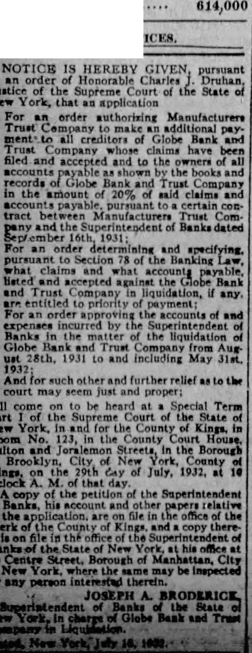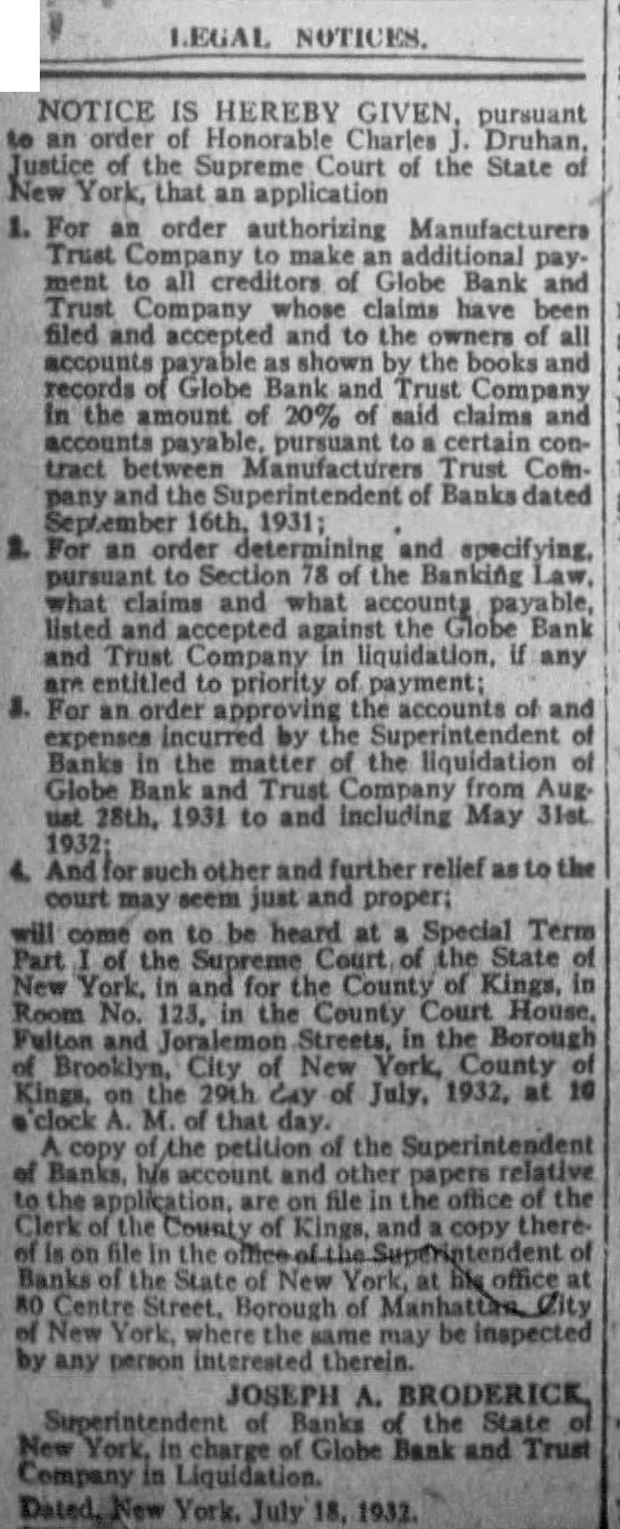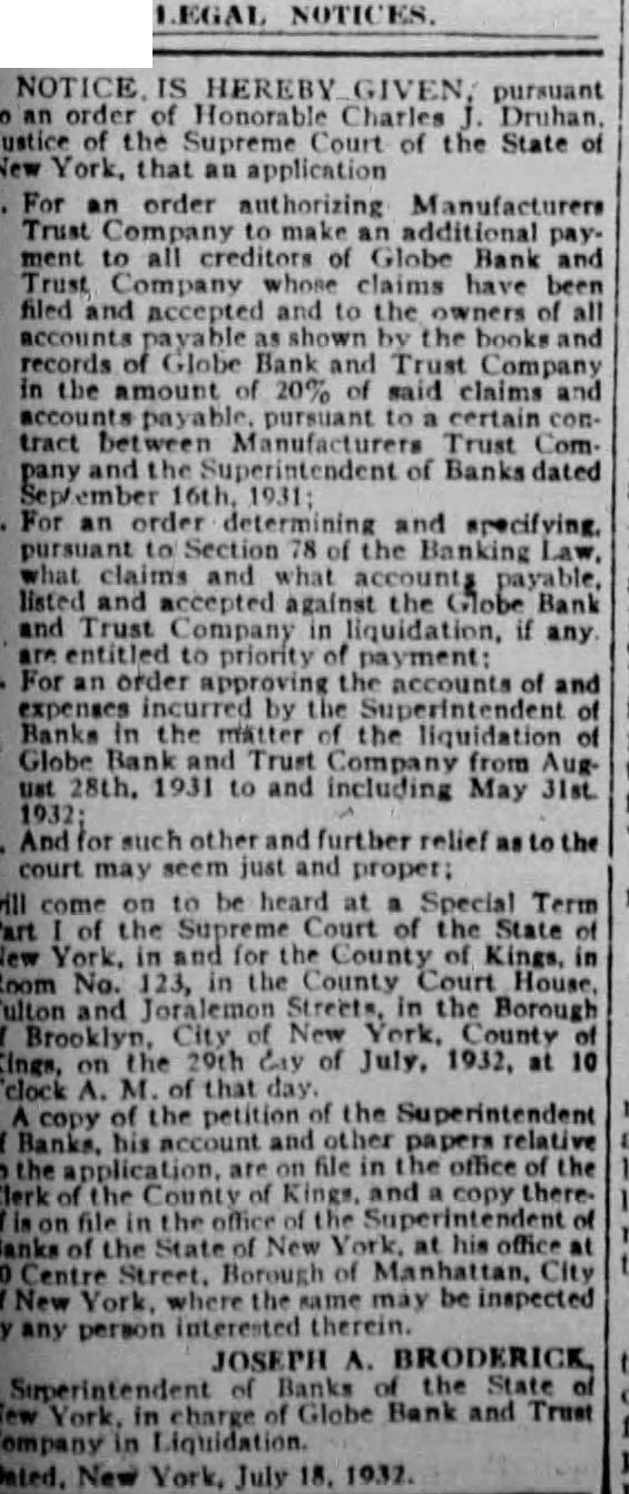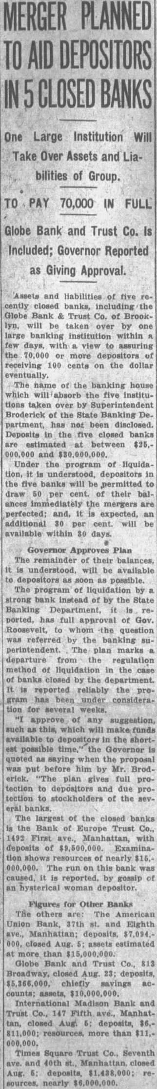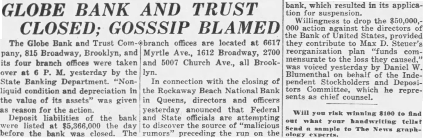 GLOBE BANK AND TRUST CLOSED; GOSSSIP BLAMED pany, 815 Broadway, Brooklyn, and its four branch offices were taken over at 6 P. M. yesterday by the State Banking Department. "Nonliquid condition and depreciation in the value of its assets" was given as reason for the action. Deposit liabilities of the bank were listed at $5,366,000 the day before the bank was closed. The Myrtle Ave., 1612 Broadway, 2700 and 5007 Church Ave., all Brooklyn. In connection with the closing of the Rockaway Beach National Bank in Queens, directors and officers yesterday anounced that Federal and State officials are attempting to discover the source of "malicious rumors" preceding the run on the bank, which resulted in its application for suspension. Willingness to drop the $50,000,000 action against the directors of the Bank of United States, provided they contribute to Max D. Steuer's reorganization plan "funds commensurate to the loss they caused," was voiced yesterday by Daniel W. Blumenthal on behalf of the Independent Stockholders and Depositors Committee, which he represents as chief counsel. Will you risk winning $100 to find out what your handwriting tells? Send a sample to The News graphology experts.
