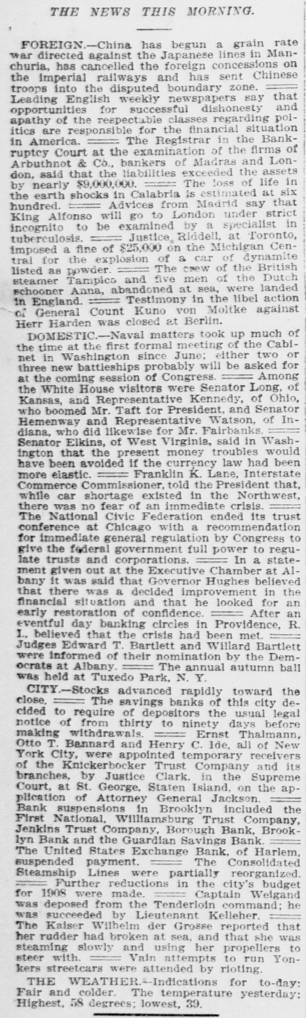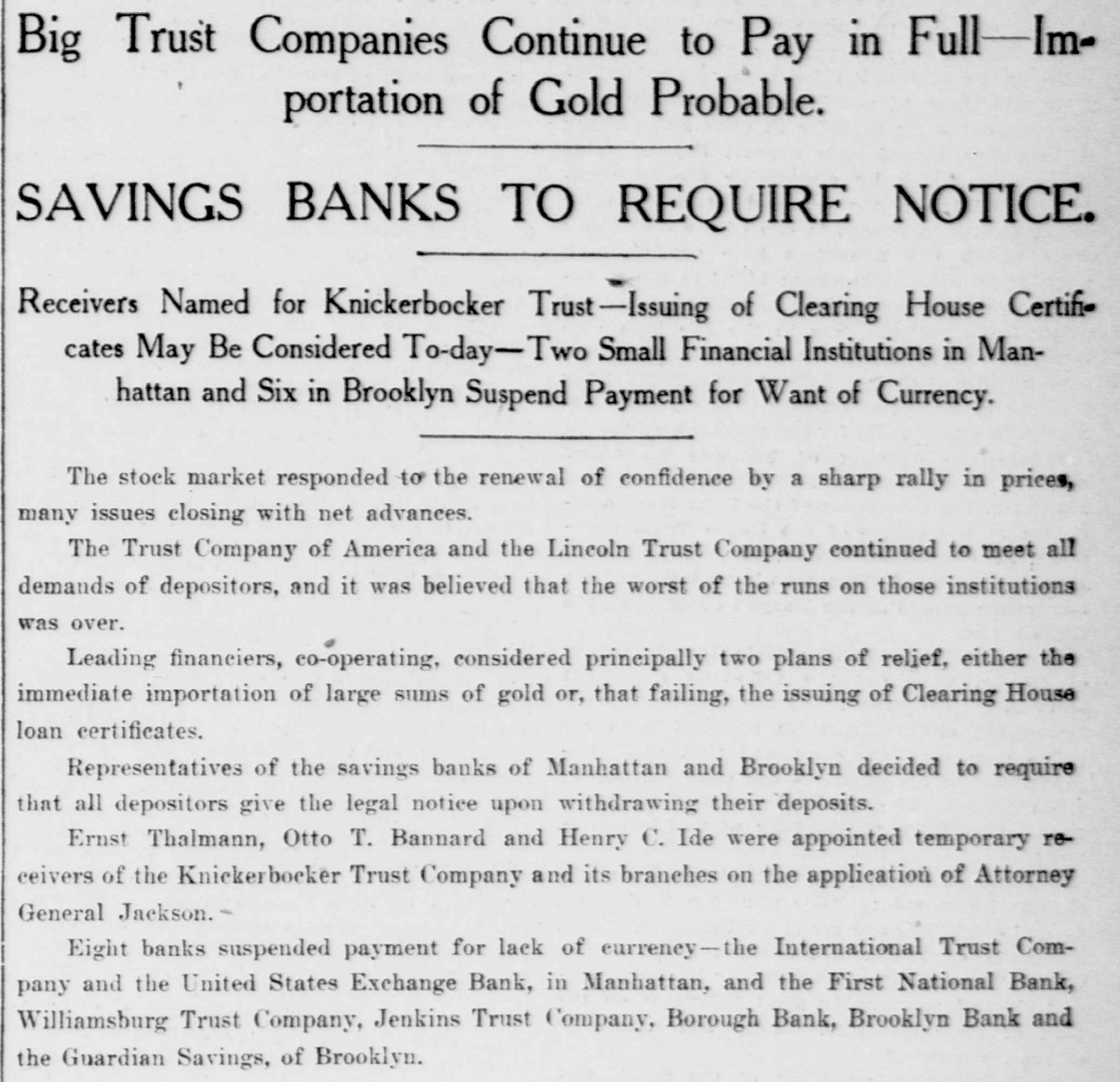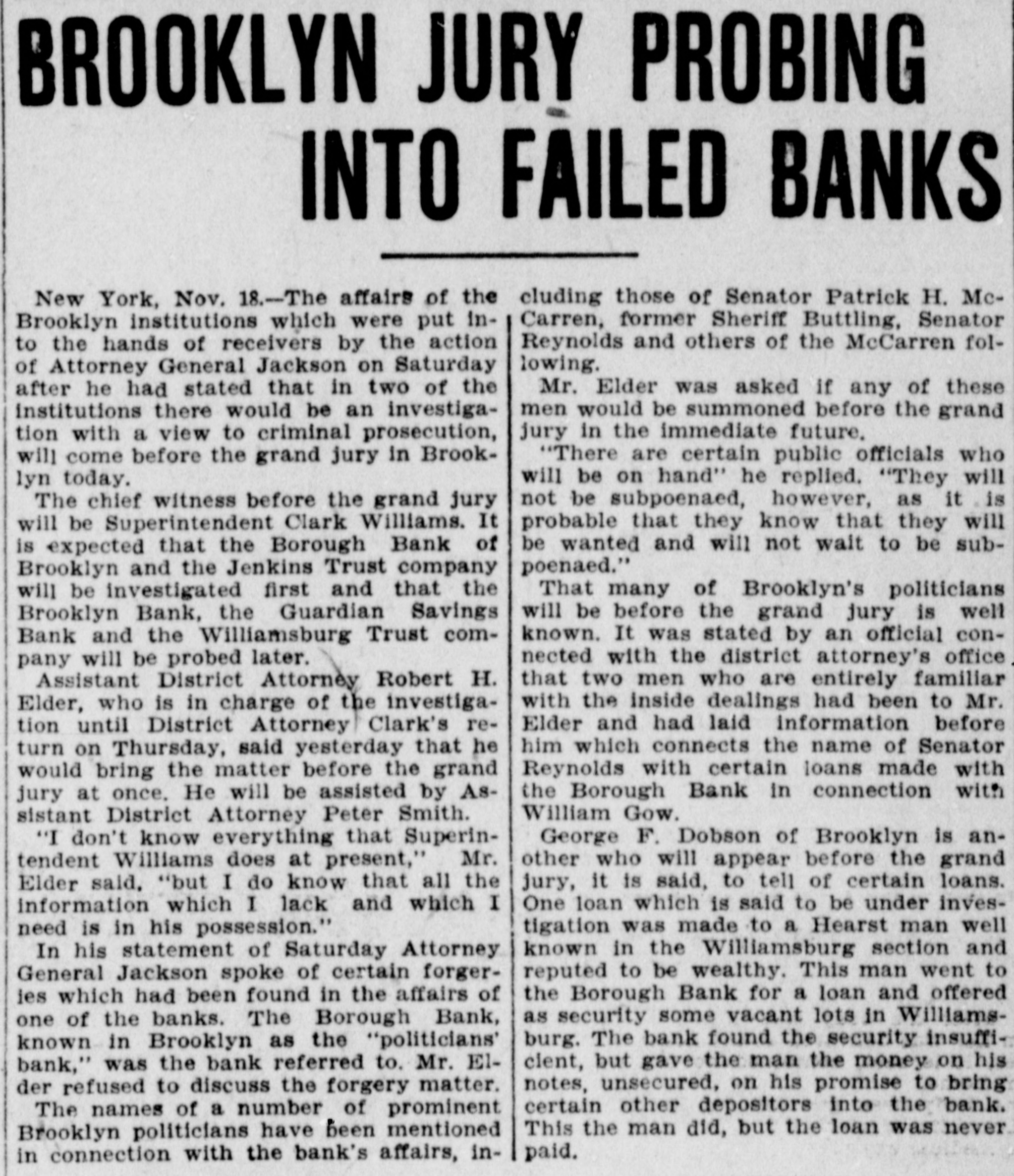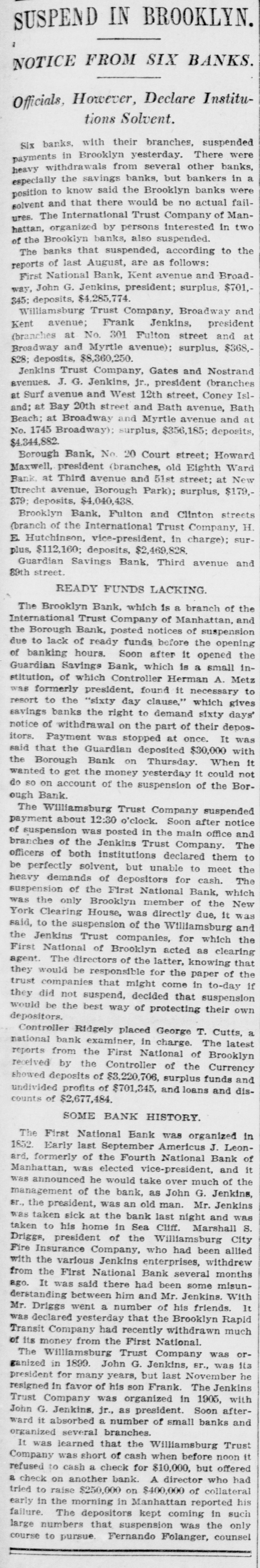 SUSPEND IN BROOKLYN. NOTICE FROM SIX BANKS. Officials, However, Declare Institutions Solvent. Six banks, with their branches, suspended payments in Brooklyn yesterday. There were withdrawals from several other banks, the savings a to know said were position especially heavy the banks, would Brooklyn be but bankers banks actual fail- in solvent and that there no ures. The International Trust Company of Manhattan, organized by persons interested in two of the Brooklyn banks, also suspended. The banks that suspended, according to the reports of last August, are as follows: First National Bank, Kent avenue and Broadway, John G. Jenkins, president; surplus, $701,345: deposits, $4,285,774. Williamsburg Trust Company. Broadway and Kent avenue; Frank Jenkins, president (branches at No. 301 Fulton street and at Broadway and Myrtle avenue): surplus, $368,828; deposits, $8,360,250. Jenkins Trust Company, Gates and Nostrand avenues. J. G. Jenkins, jr., president (branches at Surf avenue and West 12th street, Coney Island: at Bay 20th street and Bath avenue, Bath Beach; at Broadway and Myrtle avenue and at No. 1745 Broadway): surplus, $356,185; deposits, $4,344,882. Borough Bank, No. 20 Court street; Howard Maxwell, president (branches, old Eighth Ward Bank at Third avenue and 51st street; at New Utrecht avenue, Borough Park): surplus, $179,379: deposits, $4,040,438. Brooklyn Bank, Fulton and Clinton streets (branch of the International Trust Company, H. El Hutchinson, vice-president, in charge); surplus, $112,160; deposits, $2,469,828. Guardian Savings Bank, Third avenue and 89th street. READY FUNDS LACKING. The Brooklyn Bank, which is a branch of the International Trust Company of Manhattan, and the Borough Bank, posted notices of suspension due to lack of ready funds before the opening of banking hours. Soon after it opened the Guardian Savings Bank, which is a small institution, of which Controller Herman A. Metz was formerly president, found it necessary to resort to the "sixty day clause," which gives savings banks the right to demand sixty days' notice of withdrawal on the part of their depositors. Payment was stopped at once. It was said that the Guardian deposited $30,000 with the Borough Bank on Thursday. When it wanted to get the money yesterday it could not do so on account of the suspension of the Borough Bank. The Williamsburg Trust Company suspended payment about 12:30 o'clock. Soon after notice of suspension was posted in the main office and branches of the Jenkins Trust Company. The officers of both institutions declared them to be perfectly solvent, but unable to meet the heavy demands of depositors for cash. The suspension of the First National Bank, which was the only Brooklyn member of the New York Clearing House, was directly due, it was said, to the suspension of the Williamsburg and the Jenkins Trust companies, for which the First National of Brooklyn acted as clearing agent. The directors of the latter, knowing that they would be responsible for the paper of the trust companies that might come in to-day if they did not suspend, decided that suspension would be the best way of protecting their own depositors. Controller Ridgely placed George T. Cutts, a national bank examiner, in charge. The latest reports from the First National of Brooklyn received by the Controller of the Currency showed deposits of $3,220,706, surplus funds and undivided profits of $701,345. and loans and discounts of $2,677,484. SOME BANK HISTORY. The First National Bank was organized in 1852. Early last September Americus J. Leonard, formerly of the Fourth National Bank of Manhattan, was elected vice-president, and it was announced he would take over much of the management of the bank, as John G. Jenkins, sr., the president, was an old man. Mr. Jenkins was taken sick at the bank last night and was taken to his home in Sea Cliff. Marshall S. Driggs, president of the Williamsburg City Fire Insurance Company, who had been allied with the various Jenkins enterprises, withdrew from the First National Bank several months ago. It was said there had been some misunderstanding between him and Mr. Jenkins. With Mr. Driggs went a number of his friends. It was declared yesterday that the Brooklyn Rapid Transit Company had recently withdrawn much of its money from the First National. The Williamsburg Trust Company was organized in 1899. John G. Jenkins, sr., was its president for many years, but last November he resigned in favor of his son Frank. The Jenkins Trust Company was organized in 1905, with John G. Jenkins, jr., as president. Soon afterward it absorbed a number of small banks and organized several branches. It was learned that the Williamsburg Trust Company was short of cash when before noon it refused to cash a check for $10,000, but offered a check on another bank. A director who had tried to raise $250,000 on $400,000 of collateral early in the morning in Manhattan reported his failure. The depositors kept coming in such large numbers that suspension was the only course to pursue. Fernando Folanger, counsel