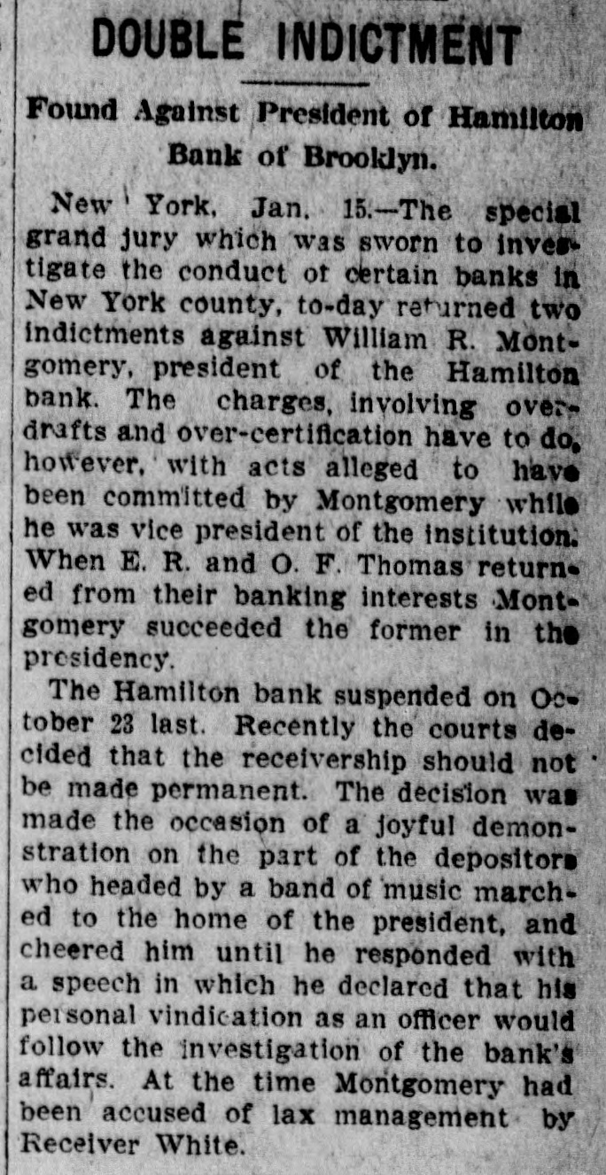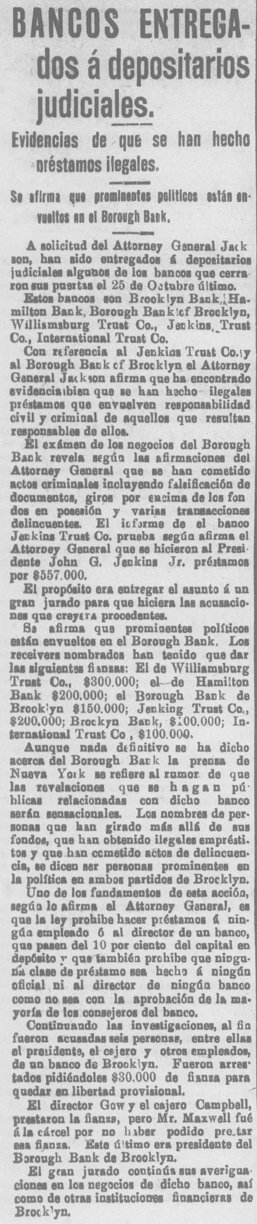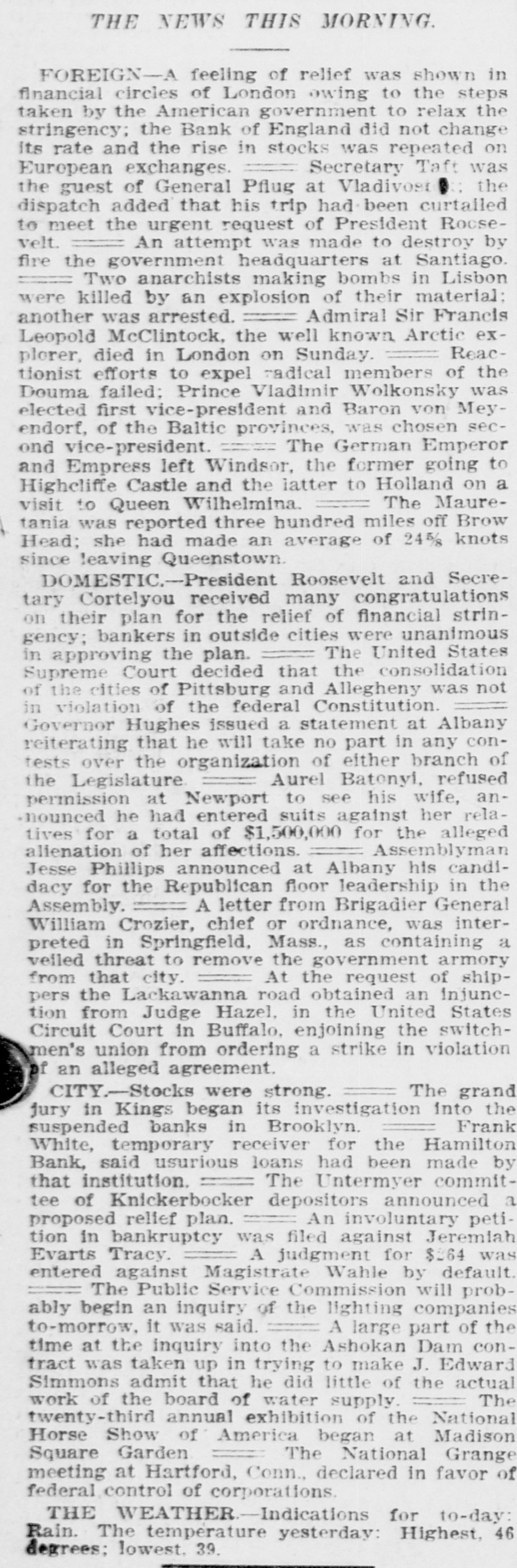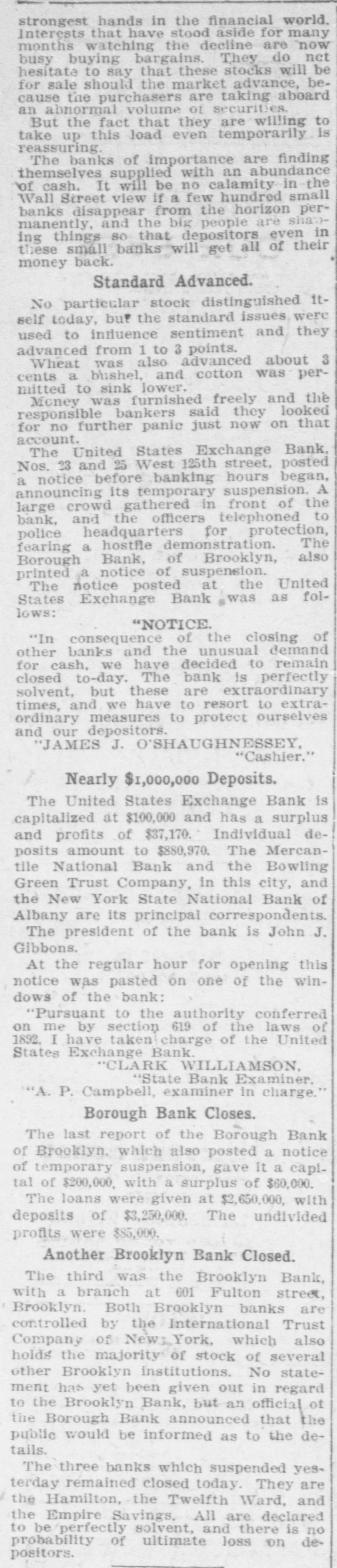 strongest hands in the financial world. Interests that have stood aside for many months watching the decline are now busy buying bargains. They do net hesitate to say that these stocks will be for sale should the market advance, because the purchasers are taking aboard an abnormal volume ot securities. But the fact that they are willing to take up this load even temporarily is reassuring. The banks of importance are finding themselves supplied with an abundance of cash. It will be no calamity in the Wall Street view if a few hundred small banks disappear from the horizon permanently, and the big people are shaning things so that depositors even in these smáll banks will get all of their money back. Standard Advanced. No particular stock distinguished itself today, but the standard issues were used to influence sentiment and they advanced from 1 to 3 points. Wheat was also advanced about 3 cents a bushel, and cotton was permitted to sink lower. Money was furnished freely and the responsible bankers said they looked for no further panic just now on that account. The United States Exchange Bank, Nos. 23 and 25 West 125th street, posted a notice before banking hours began, announcing its temporary suspension, A large crowd gathered in front of the bank, and the officers telephoned to police headquarters for protection, fearing a hostile demonstration. The Borough Bank, of Brooklyn, also printed a notice of suspension. The notice posted at the United States Exchange Bank was as follows: "NOTICE. "In consequence of the closing of other banks and the unusual demand for cash, we have decided to remain closed to-day. The bank is perfectly solvent, but these are extraordinary times, and we have to resort to extraordinary measures to protect ourselves and our depositors. "JAMES J. O'SHAUGHNESSEY, "Cashier." Nearly $1,000,000 Deposits. The United States Exchange Bank is capitalized at $100,000 and has a surplus and profits of $37,170. Individual deposits amount to $880,970. The Mercantile National Bank and the Bowling Green Trust Company, in this city, and the New York State National Bank of Albany are its principal correspondents. The president of the bank is John J. Gibbons. At the regular hour for opening this notice was pasted on one of the windows of the bank: "Pursuant to the authority conferred on me by section 619 of the laws of 1892, I have taken charge of the United States Exchange Bank. "CLARK WILLIAMSON, "State Bank Examiner. "A. P. Campbell, examiner in charge." Borough Bank Closes. The last report of the Borough Bank of Brooklyn, which also posted a notice of temporary suspension, gave It a capital of $200,000, with a surplus of $60,000. The loans were given at $2,650,000, with deposits of $3,250,000. The undivided profits were $85,000. Another Brooklyn Bank Closed. The third was the Brooklyn Bank, with a branch at 601 Fulton street, Brooklyn. Both Brooklyn banks are controlled by the International Trust Company of New York, which also holds the majority of stock of several other Brooklyn institutions. No statement has yet been given out in regard to the Brooklyn Bank, but an official of the Borough Bank announced that the public would be informed as to the details. The three banks which suspended yesterday remained closed today. They are the Hamilton, the Twelfth Ward, and the Empire Savings. All are declared to be perfectly solvent, and there is no probability of ultimate loss on depositors.