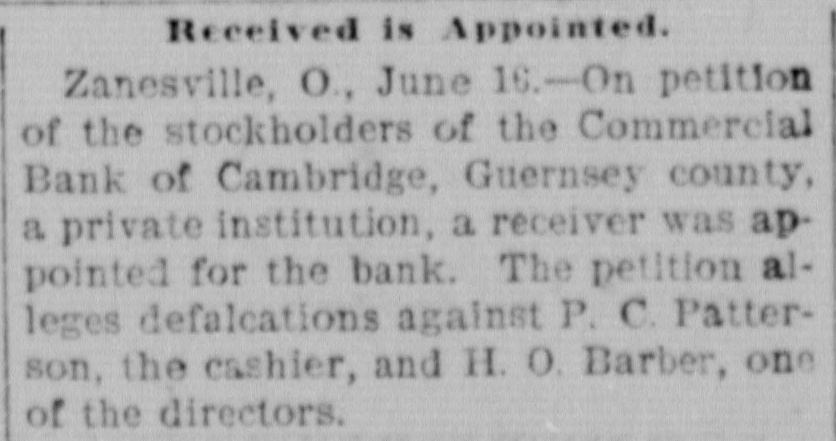 Articles (June 1904) report the Commercial Bank of Cambridge (Guernsey County), a private institution, closed and a receiver (R. V. Orme/Orue) appointed after discovery of large defalcations by Cashier P. C. Patterson and Vice President H. O. (Herbert) Barber. No article describes a depositor run; failure follows discovery of embezzlement and receivership.