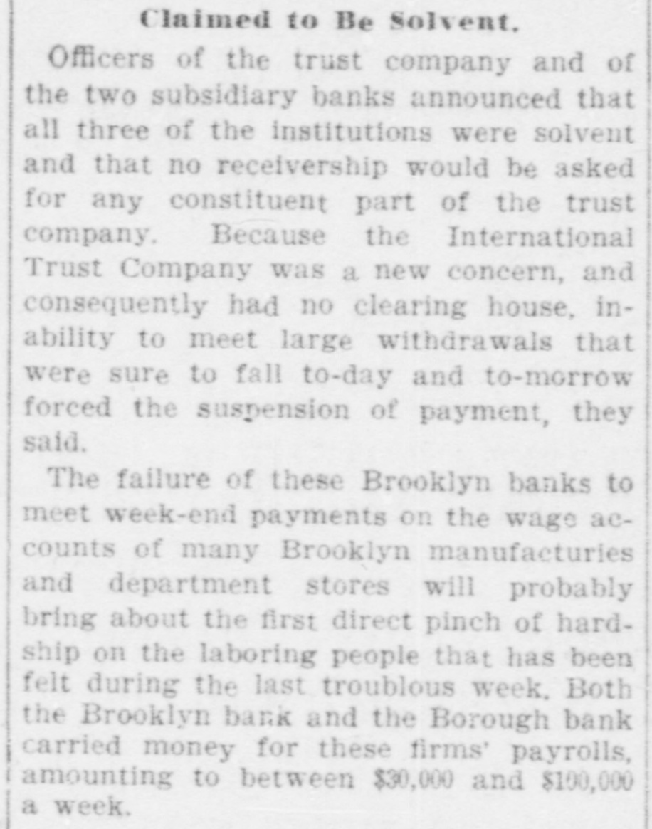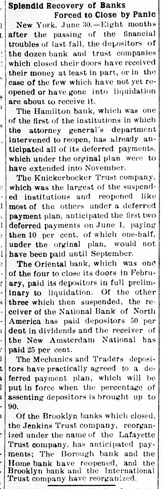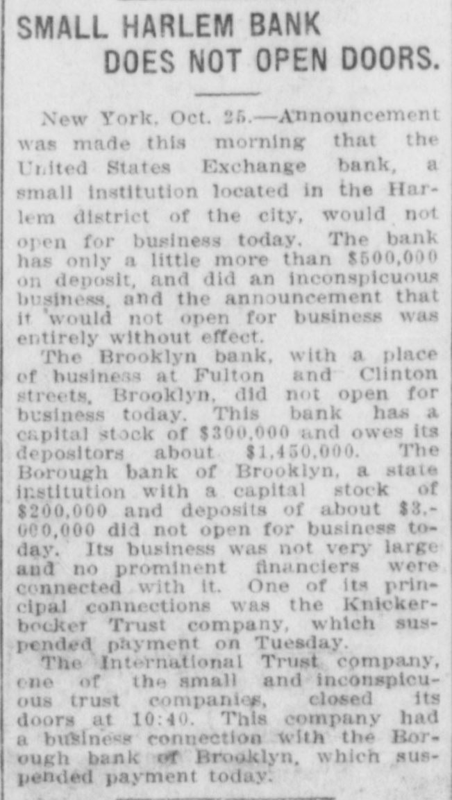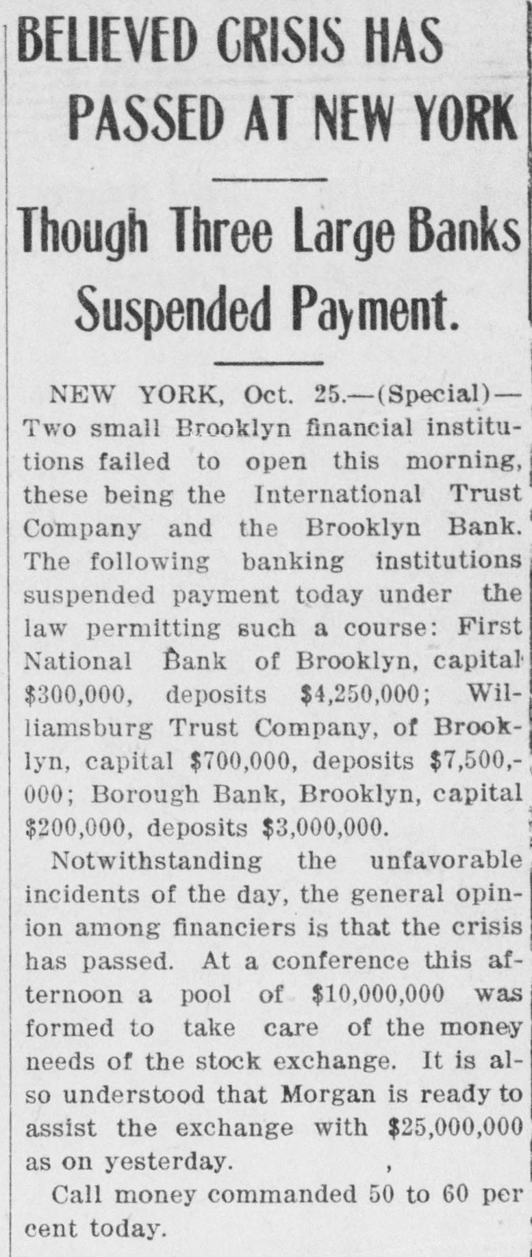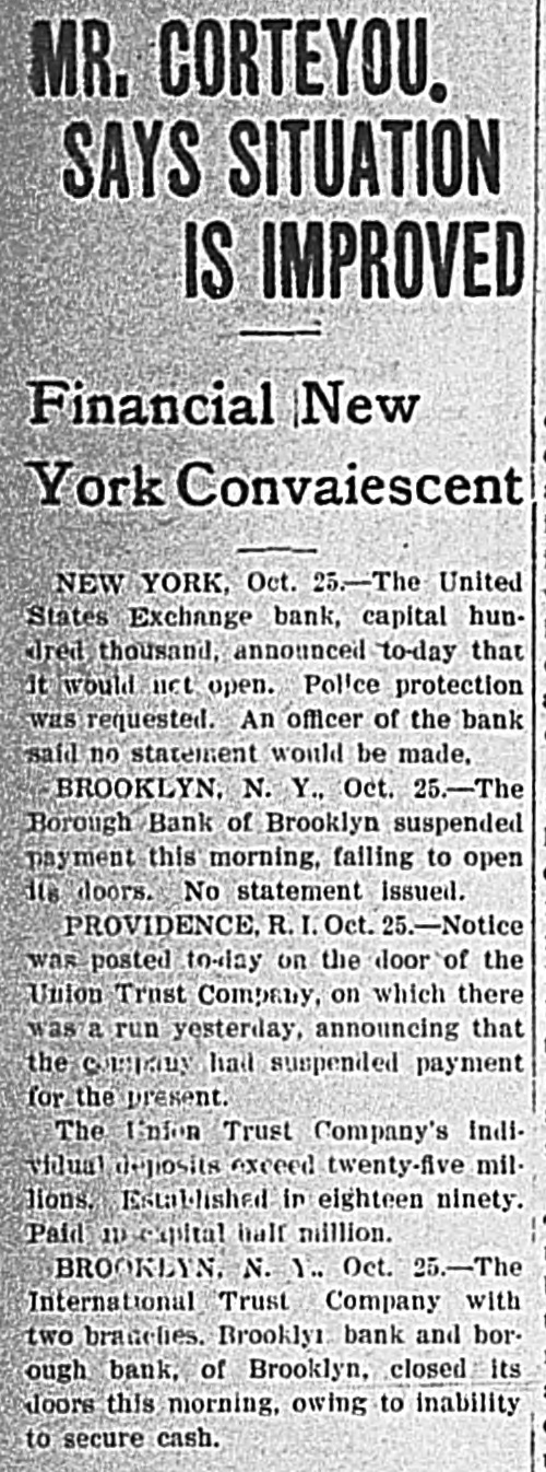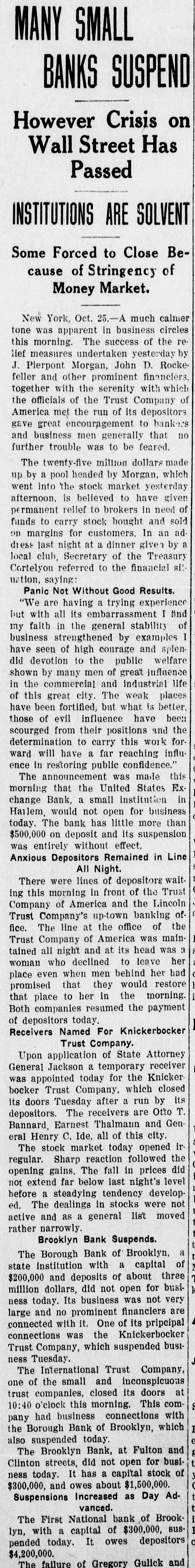 He Believes That Finances W!ll Speedily Resume Their Normal Condition Without Loss. CONCERNS SOLVENT BUT LACK CURRENCY Heavy Deposits by Financial Men And Government Are Having Good Effect In Allaying Fears of Other Interested Parties. New York, Oct. 25.-A much calmer tone was apparent in busicircles this morning. The sucness cess of the relief measures undertaken yesterday by J. Pierpont Morgan, John D. Rockefeller and other with prominent financiers, together officials the serenity with which the of the Trust Company of America met the run of depositors gave encouragemen to business men is great generally that no further trouble to be feared. Twenty-fiv million headed dollars made up by a pool the Morgan, which went into by stock market yesterday afternoon, is believed to have given permanent relief to the brokers in need of funds to carry stock bought and sold on margins for customers. Cortelyou's Views. In an address last night at a dingiven by the Graduates club, the Sercetary ner Cortevyou referred to financial situation, saying: "We are having a trying experbut with all its embarrassience ments I find my faith in the general stability of business strengthened the examples I have seen of high the courage by and splendid devotion to public welfare shown by many men of great influence in commercial The and industrial life in this city. places have been fortified but, weak is better, those of evil influ- their what have been acourged from ence positions and a determination to this work forward will have a carry far reaching influence in restoring the public She confidence." Stood All Night. The announcement was made this Exthat the United States morning bank. a small institution in change would not open for business Harlem, The bank has little more than today. $500,000 on deposit and its suspen- effect. entirely without There sion was were lines of depositors wait- the this morning in front and of the Trust ing Company of America uptown Trust company's Lincoln office. The line at the office banking Trust Company of Ameriof the was maintained all night and declin- at ca head was a woman, who the the leave her place even when it men ed to behind promised to restore to The her in Borough the morning Bank of Brooklyn, state institution with a capital .o $3.$200,000 a and deposits of about business did not open for 000,000. Its business was not very large today. and no prominent One financiers of dts are connected connections with it. was the Knicksusprincipal erbocker Trust company, which pended business Tuesday No Session of Exchange. Pa. Oct. 25. There Pittsburg, of the stock exchange was no session having decided to today, have the the directors exchange remain closed for the Protecting present. Its Depositors. The Providence, R. I., Oct. on 25 which Union Trust run, company, did not open for there was a the usual hour. business at 9 o'clock, The following notice was posted will not open to"This company in the the stringency day, owing market to There were several money in line who wished hundred people The East Greento draw branch money of the Union Trust remained comwich of Providence also notice was closed pany this morning. A closed posted saying that it was kept for the protection of depositors Receivers Named. New York, Oct. 25 General Upon appll- Jack cation State Attorney were ap temporary receivers Knickerbocker son, today for the its pointed company, which closed its deTrust Tuesday after a run by Otto T. doors The receivers are General positors. Ernest Thalmani and York Bannard, Henry C. Ide, all of New City Small Concern. company The International Trust inconspicuous the small and at one of concerns, closed its doors business trust This company had bank connections 10:40 with the Borough toBrooklyn, which suspended Fulton of The Brooklyn bank at today Clinton streets did not open $300.and capital stock of 000 day and It has owes a about one million, five thousand dollars. hundred Resumed Payment. reThe Lincoln Trust depositors company today sumed payment to to a statement as usual Accord 29 ding last, the bank at Providence, issued June which closed $28,238,335 today, had aggregating resources included besides of $500. $3.Its liabilities surplus 000 capital stock, a of $25,465,625. 250,000 and deposits is president and J. Marsden Perry Edward Stadley first vice president of the Market institution. Slow. irreguThe stock market opened following the lar. a sharp reaction The fall in prices opening extend gains far below last night's level did not before a steadying tendency stocks were developed. not active and Dealings the general in list moved rather narrowly Deposits $8,000,000. Brook National bank of tolyn. The capital First $300,000. suspended