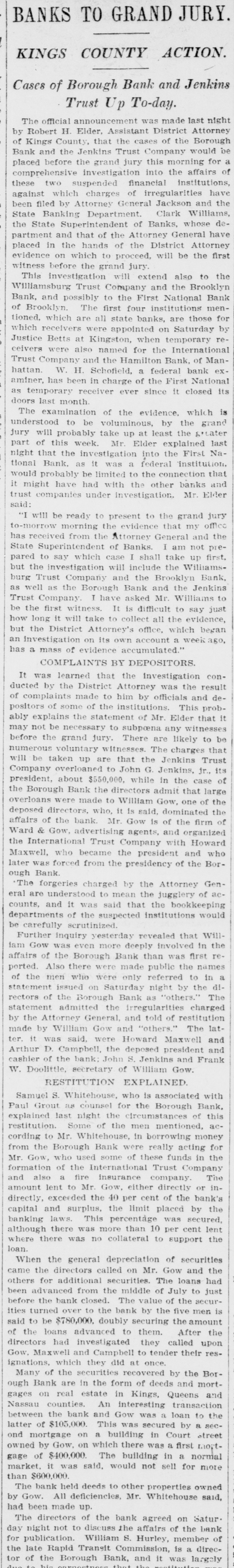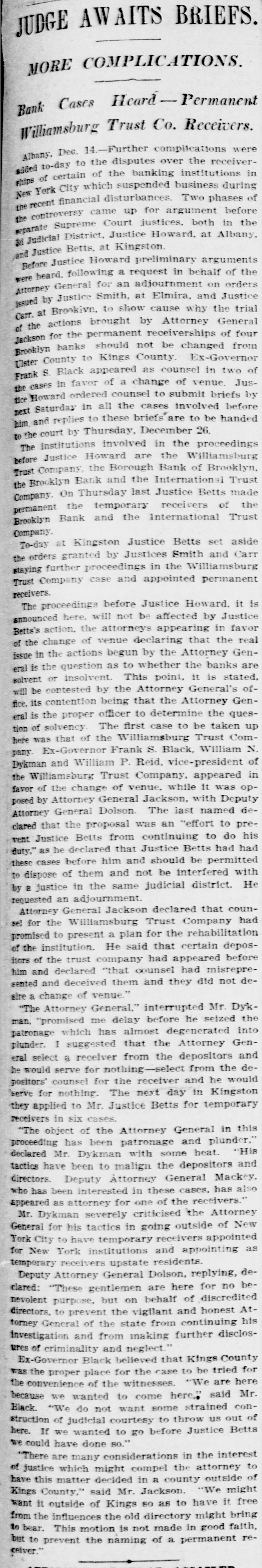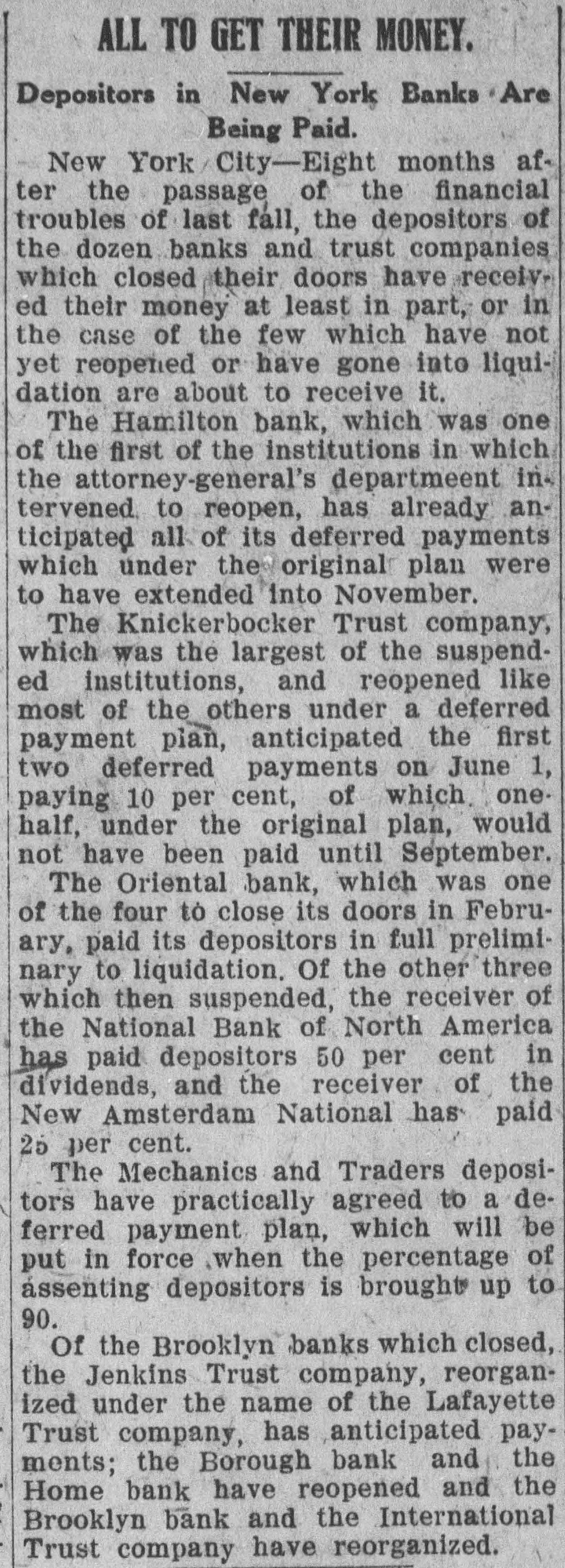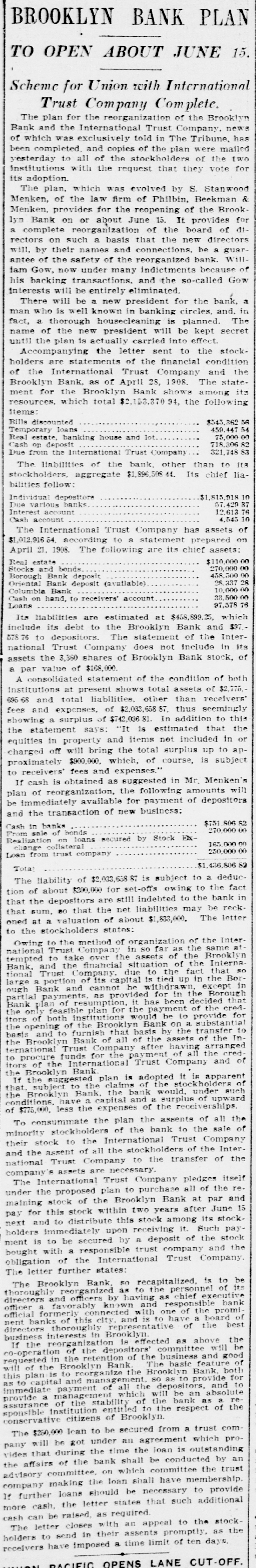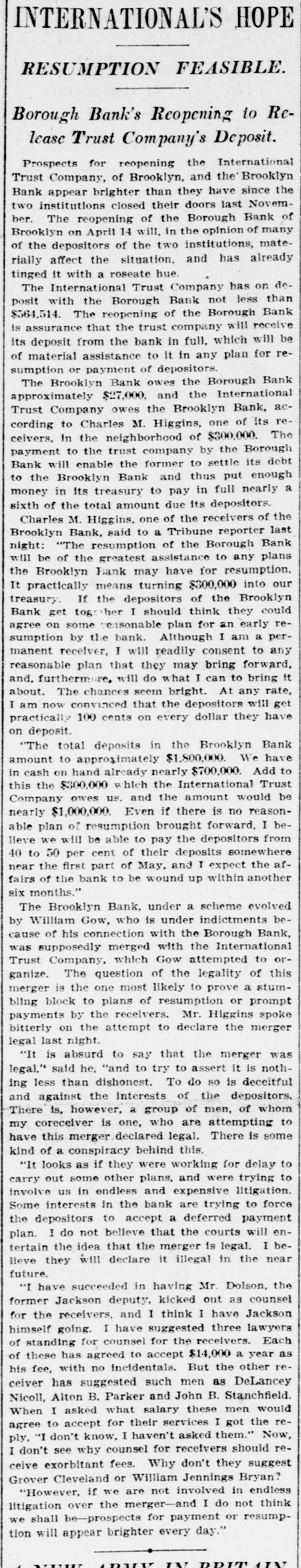 He Believes That Finances W!ll Speedily Resume Their Normal Condition Without Loss. CONCERNS SOLVENT BUT LACK CURRENCY Heavy Deposits by Financial Men And Government Are Having Good Effect In Allaying Fears of Other Interested Parties. New York, Oct. 25.-A much calmer tone was apparent in busicircles this morning. The sucness cess of the relief measures undertaken yesterday by J. Pierpont Morgan, John D. Rockefeller and other with prominent financiers, together officials the serenity with which the of the Trust Company of America met the run of depositors gave encouragemen to business men is great generally that no further trouble to be feared. Twenty-fiv million headed dollars made up by a pool the Morgan, which went into by stock market yesterday afternoon, is believed to have given permanent relief to the brokers in need of funds to carry stock bought and sold on margins for customers. Cortelyou's Views. In an address last night at a dingiven by the Graduates club, the Sercetary ner Cortevyou referred to financial situation, saying: "We are having a trying experbut with all its embarrassience ments I find my faith in the general stability of business strengthened the examples I have seen of high the courage by and splendid devotion to public welfare shown by many men of great influence in commercial The and industrial life in this city. places have been fortified but, weak is better, those of evil influ- their what have been acourged from ence positions and a determination to this work forward will have a carry far reaching influence in restoring the public She confidence." Stood All Night. The announcement was made this Exthat the United States morning bank. a small institution in change would not open for business Harlem, The bank has little more than today. $500,000 on deposit and its suspen- effect. entirely without There sion was were lines of depositors wait- the this morning in front and of the Trust ing Company of America uptown Trust company's Lincoln office. The line at the office banking Trust Company of Ameriof the was maintained all night and declin- at ca head was a woman, who the the leave her place even when it men ed to behind promised to restore to The her in Borough the morning Bank of Brooklyn, state institution with a capital .o $3.$200,000 a and deposits of about business did not open for 000,000. Its business was not very large today. and no prominent One financiers of dts are connected connections with it. was the Knicksusprincipal erbocker Trust company, which pended business Tuesday No Session of Exchange. Pa. Oct. 25. There Pittsburg, of the stock exchange was no session having decided to today, have the the directors exchange remain closed for the Protecting present. Its Depositors. The Providence, R. I., Oct. on 25 which Union Trust run, company, did not open for there was a the usual hour. business at 9 o'clock, The following notice was posted will not open to"This company in the the stringency day, owing market to There were several money in line who wished hundred people The East Greento draw branch money of the Union Trust remained comwich of Providence also notice was closed pany this morning. A closed posted saying that it was kept for the protection of depositors Receivers Named. New York, Oct. 25 General Upon appll- Jack cation State Attorney were ap temporary receivers Knickerbocker son, today for the its pointed company, which closed its deTrust Tuesday after a run by Otto T. doors The receivers are General positors. Ernest Thalmani and York Bannard, Henry C. Ide, all of New City Small Concern. company The International Trust inconspicuous the small and at one of concerns, closed its doors business trust This company had bank connections 10:40 with the Borough toBrooklyn, which suspended Fulton of The Brooklyn bank at today Clinton streets did not open $300.and capital stock of 000 day and It has owes a about one million, five thousand dollars. hundred Resumed Payment. reThe Lincoln Trust depositors company today sumed payment to to a statement as usual Accord 29 ding last, the bank at Providence, issued June which closed $28,238,335 today, had aggregating resources included besides of $500. $3.Its liabilities surplus 000 capital stock, a of $25,465,625. 250,000 and deposits is president and J. Marsden Perry Edward Stadley first vice president of the Market institution. Slow. irreguThe stock market opened following the lar. a sharp reaction The fall in prices opening extend gains far below last night's level did not before a steadying tendency stocks were developed. not active and Dealings the general in list moved rather narrowly Deposits $8,000,000. Brook National bank of tolyn. The capital First $300,000. suspended