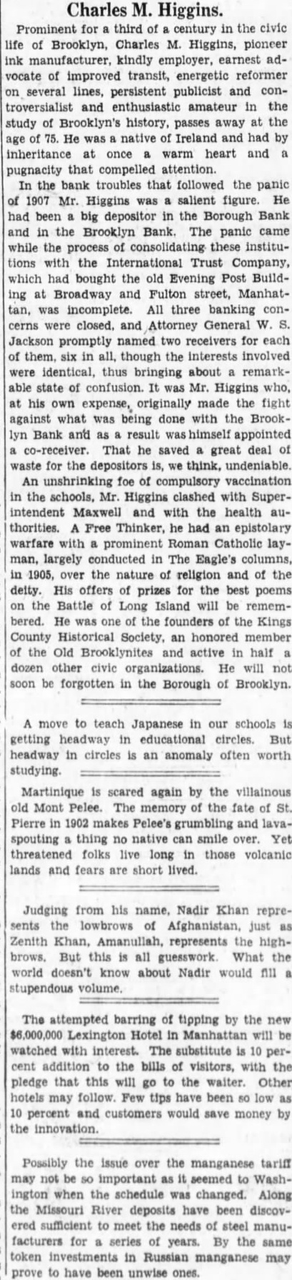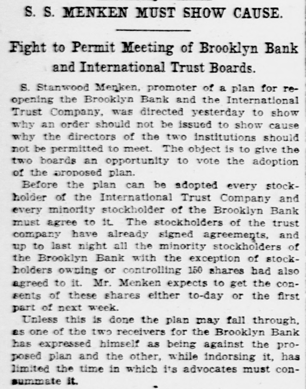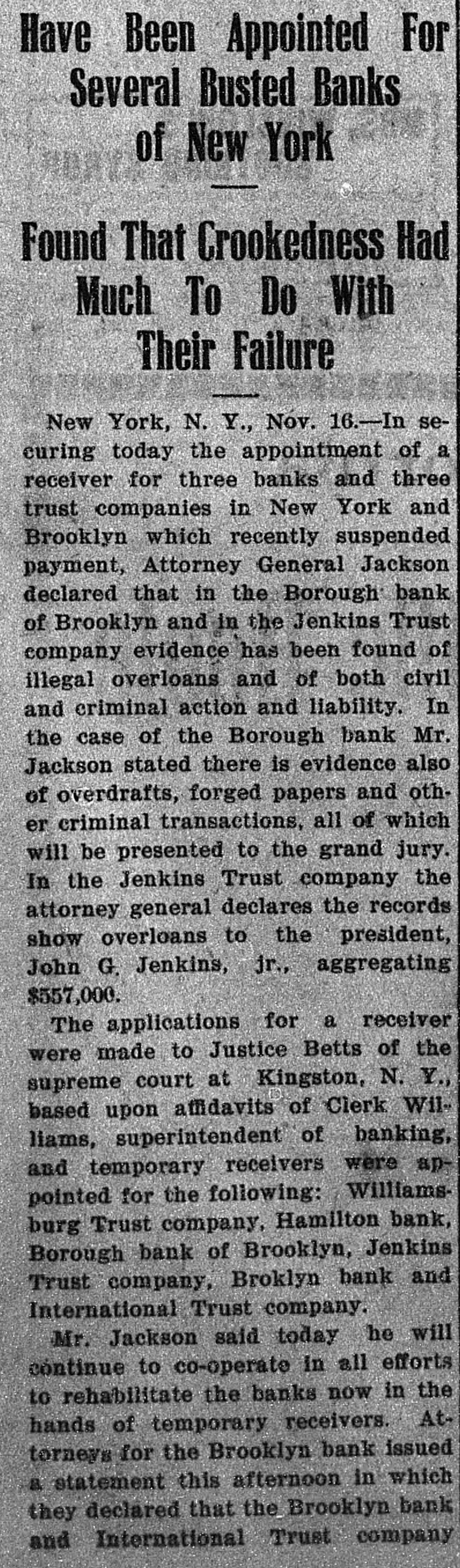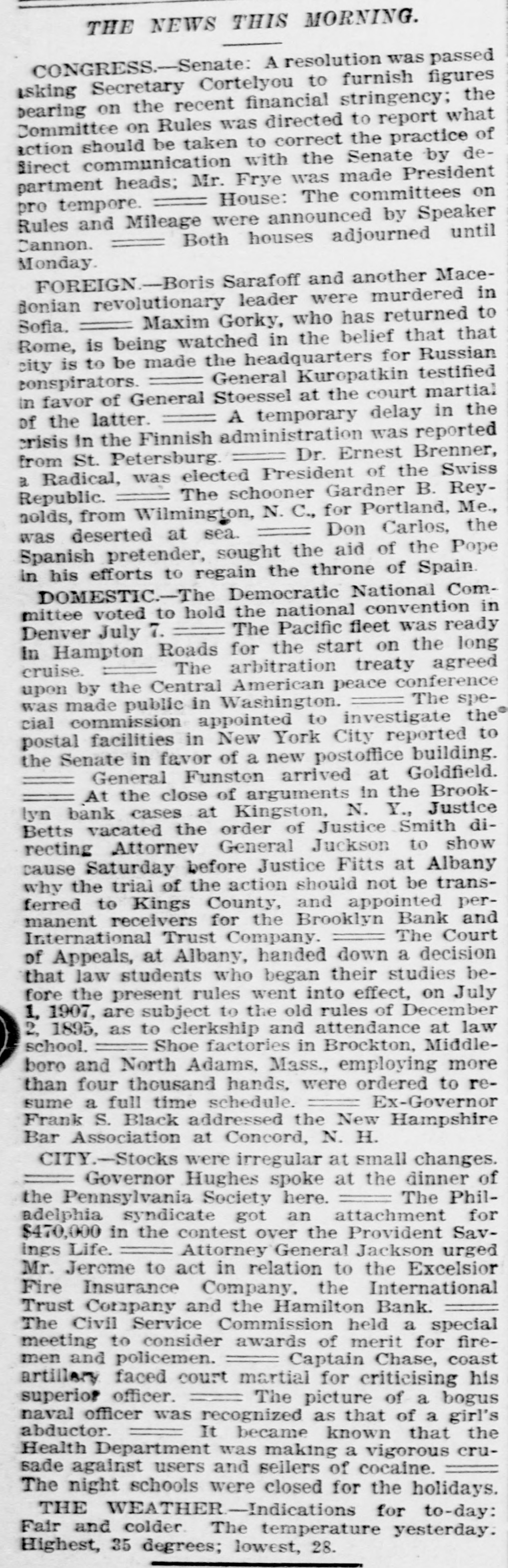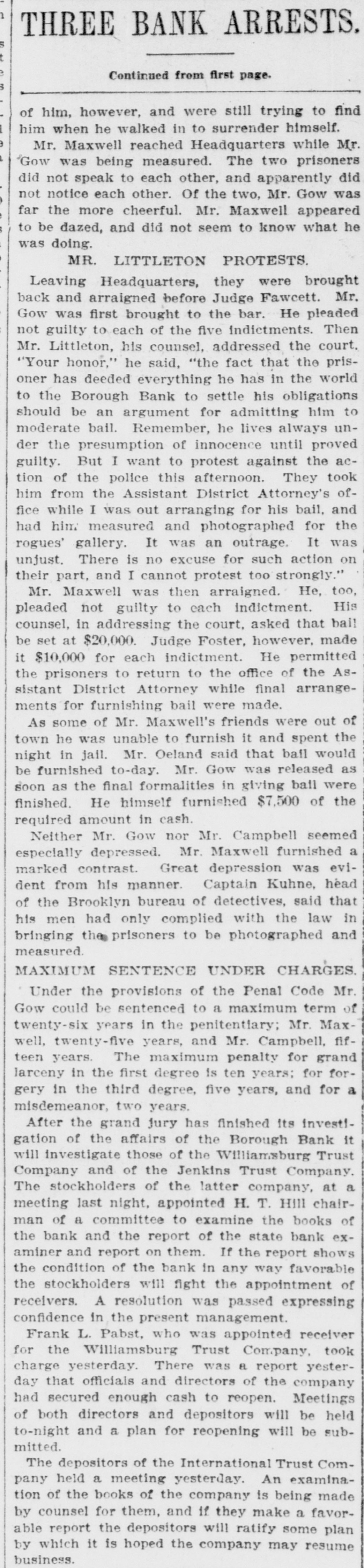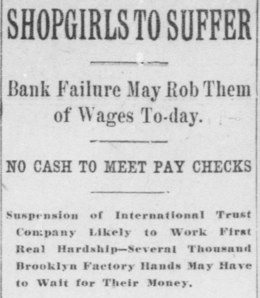 He Believes That Finances W!ll Speedily Resume Their Normal Condition Without Loss. CONCERNS SOLVENT BUT LACK CURRENCY Heavy Deposits by Financial Men And Government Are Having Good Effect In Allaying Fears of Other Interested Parties. New York, Oct. 25.-A much calmer tone was apparent in busicircles this morning. The sucness cess of the relief measures undertaken yesterday by J. Pierpont Morgan, John D. Rockefeller and other with prominent financiers, together officials the serenity with which the of the Trust Company of America met the run of depositors gave encouragemen to business men is great generally that no further trouble to be feared. Twenty-fiv million headed dollars made up by a pool the Morgan, which went into by stock market yesterday afternoon, is believed to have given permanent relief to the brokers in need of funds to carry stock bought and sold on margins for customers. Cortelyou's Views. In an address last night at a dingiven by the Graduates club, the Sercetary ner Cortevyou referred to financial situation, saying: "We are having a trying experbut with all its embarrassience ments I find my faith in the general stability of business strengthened the examples I have seen of high the courage by and splendid devotion to public welfare shown by many men of great influence in commercial The and industrial life in this city. places have been fortified but, weak is better, those of evil influ- their what have been acourged from ence positions and a determination to this work forward will have a carry far reaching influence in restoring the public She confidence." Stood All Night. The announcement was made this Exthat the United States morning bank. a small institution in change would not open for business Harlem, The bank has little more than today. $500,000 on deposit and its suspen- effect. entirely without There sion was were lines of depositors wait- the this morning in front and of the Trust ing Company of America uptown Trust company's Lincoln office. The line at the office banking Trust Company of Ameriof the was maintained all night and declin- at ca head was a woman, who the the leave her place even when it men ed to behind promised to restore to The her in Borough the morning Bank of Brooklyn, state institution with a capital .o $3.$200,000 a and deposits of about business did not open for 000,000. Its business was not very large today. and no prominent One financiers of dts are connected connections with it. was the Knicksusprincipal erbocker Trust company, which pended business Tuesday No Session of Exchange. Pa. Oct. 25. There Pittsburg, of the stock exchange was no session having decided to today, have the the directors exchange remain closed for the Protecting present. Its Depositors. The Providence, R. I., Oct. on 25 which Union Trust run, company, did not open for there was a the usual hour. business at 9 o'clock, The following notice was posted will not open to"This company in the the stringency day, owing market to There were several money in line who wished hundred people The East Greento draw branch money of the Union Trust remained comwich of Providence also notice was closed pany this morning. A closed posted saying that it was kept for the protection of depositors Receivers Named. New York, Oct. 25 General Upon appll- Jack cation State Attorney were ap temporary receivers Knickerbocker son, today for the its pointed company, which closed its deTrust Tuesday after a run by Otto T. doors The receivers are General positors. Ernest Thalmani and York Bannard, Henry C. Ide, all of New City Small Concern. company The International Trust inconspicuous the small and at one of concerns, closed its doors business trust This company had bank connections 10:40 with the Borough toBrooklyn, which suspended Fulton of The Brooklyn bank at today Clinton streets did not open $300.and capital stock of 000 day and It has owes a about one million, five thousand dollars. hundred Resumed Payment. reThe Lincoln Trust depositors company today sumed payment to to a statement as usual Accord 29 ding last, the bank at Providence, issued June which closed $28,238,335 today, had aggregating resources included besides of $500. $3.Its liabilities surplus 000 capital stock, a of $25,465,625. 250,000 and deposits is president and J. Marsden Perry Edward Stadley first vice president of the Market institution. Slow. irreguThe stock market opened following the lar. a sharp reaction The fall in prices opening extend gains far below last night's level did not before a steadying tendency stocks were developed. not active and Dealings the general in list moved rather narrowly Deposits $8,000,000. Brook National bank of tolyn. The capital First $300,000. suspended