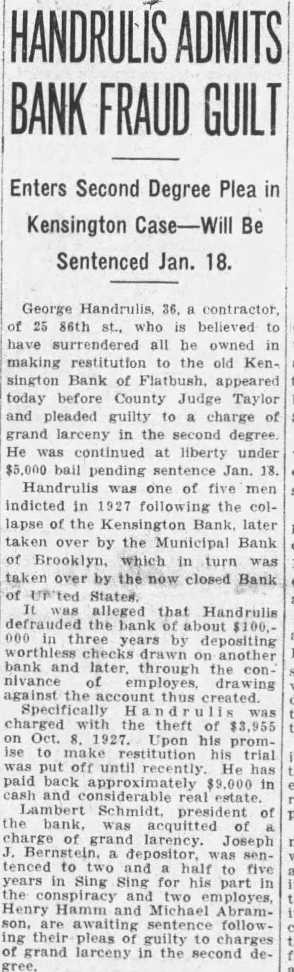 BANK FRAUD GUILT Enters Second Degree Plea in Kensington Be Sentenced Jan. 18. 25 86th st., believed have surrendered all he owned making restitution old Kensington Bank Flatbush. appeared today before County Judge Taylor and pleaded guilty charge grand second degree. continued liberty under bail pending one indicted in the lapse the Kensington Bank taken over by the Municipal Bank Brooklyn, which turn closed alleged Handrulis defrauded three depositing bank through nivance Specifically charged theft his paid Lambert president the bank, acquitted charge grand larency. Joseph five Sing Sing for part two Henry Hamm Michael Abramawaiting sentence following their pleas guilty charges grand larceny in the second gree.