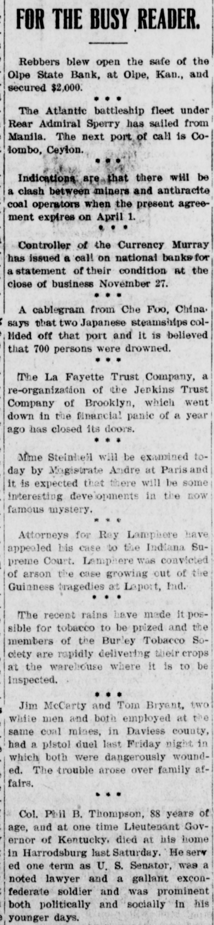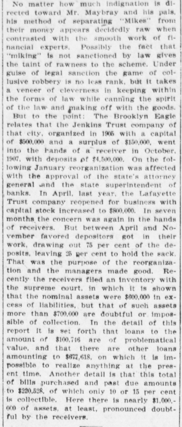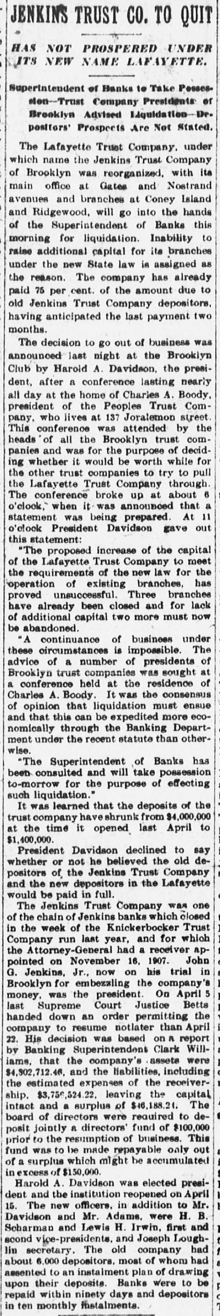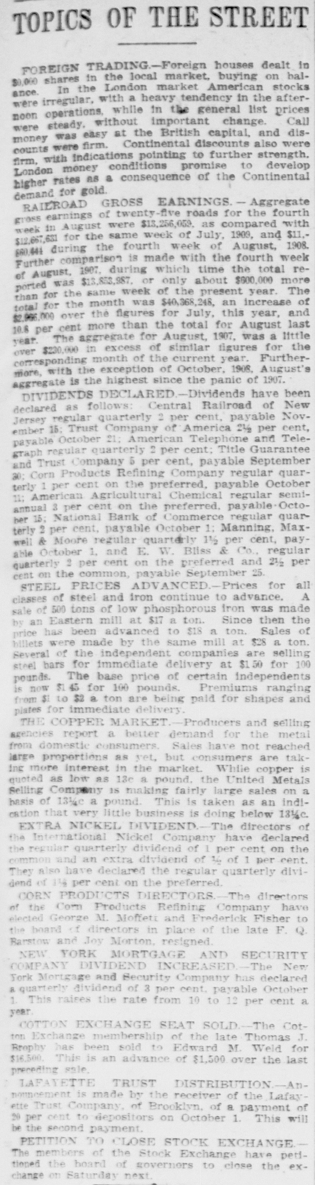 TOPICS OF THE STREET FOREIGN TRADING.-Foreign houses dealt in shares in the local market, buying on bal$0,000 In the London market American stocks ance. irregular, with a heavy tendency in the afterwere operations, while in the general list prices noon steady. without important change. Call easy at the firm. Continental money counts were were was British discounts capital, further also strength. and were diswith indications pointing to firm, money conditions promise to develop rates as a consequence for GROSS higher London demand RAIEROAD gold. EARNINGS. of the for Continental the Aggregate fourth of twenty-five roads gross were $13,256,059. as for the same week of the fourth week 860,444 week $12,667,631 in earnings during August July, of compared 1909, August, fourth and week with 1908. $11.Further comparison is made with the 1907. during which time the total rewas $13,853,987. or only same week of the year. of ported August, for the about present $600,000 more The of than for the month was $40,368,248, an increase total over the figures for July, this year, and cent more than the total for aggregate for August, was a 10.8 year. $2,966,000 per The 1907, August for little last the $230,000 in excess of similar figures corresponding over month of the current year. Furtherthe exception of October, is the highest since aggregate more, with the panic 1908, of August's 1907. DIVIDENDS DECLARED.-Dividends have been declared as follows: Central Railroad of New quarterly 2 per cent. 15: Trust Company of America per ember Jersey regular Telephone payable 21/2 and Nov- Tele- cent, payable October 21; American graph regular quarterly 2 per cent: Title Guarantee Trust Company 5 per cent, payable September Products Refining Company 1 cent on the preferred, 30: and terly Corn per payable regular October quar- semi11; American Agricultural Chemical regular annual 3 per cent on the preferred, payable-OctoNational Bank of Commerce 2 cent. payable October 1: terly her 15: per Manning, regular quar- Max- paywell & Moore regular quarterly 1 1/2 per cent, able October 1. and E. W. Bliss & Co., regular quarterly 2 per cent on the preferred and 2 1/2 per cent on the common, payable September 25. STEEL PRICES ADVANCED.-Prices for all classes of steel and iron continue to advance. A sale of 500 tons of low phosphorous iron was made by an Eastern mill at $17 a ton. Since then the price has been advanced to $18 a ton. Sales of billets were made by the same mill at $28 a ton. Several of the independent companies are selling steel bars for immediate delivery at $1.50 for 100 pounds. The base price of certain independents is now $1.45 for 100 pounds. Premiums ranging from $1 to $2 a ton are being paid for shapes and plates for immediate delivery. THE COPPER MARKET. Producers and selling agencies report a better demand for the metal from domestic consumers. Sales have not reached large proportions as yet, but consumers are taking more interest in the market. While copper is quoted as low as 13c a pound. the United Metals Selling Company is making fairly large sales on a basis of 13% a pound. This is taken as an indication that very little business is doing below 131/c EXTRA NICKEL DIVIDENDThe directors of the International Nickel Company have declared the regular quarterly dividend of 1 per cent on the common and an extra dividend of 1/6 of 1 per cent. They also have declared the regular quarterly dividend of 14 per cent on the preferred CORN PRODUCTS DIRECTORS The directors of the Corn Products Refining Company have elected George M. Moffett and Frederick Fisher to the board of directors in place of the late F. Q. Barstow and Joy Morton resigned NEW YORK MORTGAGE AND SECURITY COMPANY DIVIDEND INCREASED.-The New York Mortgage and Security Company has declared a quarterly dividend of 3 per cent. payable October 1. This raises the rate from 10 to 12 per cent a year COTTON EXCHANGE SEAT SOLD.-The Cotton Exchange membership of the late Thomas J. Brophy has been sold to Edward M. Weld for $16,500. This is an advance of $1,500 over the last preceding sale. LAFAYETTE TRUST IDISTRIBUTION-Announcement is made by the receiver of the Lafayette Trust Company, of Brooklyn, of a payment of 20 per cent to depositors on October 1. This will be the second payment. PETITION TO CLOSE STOCK EXCHANGE.The members of the Stock Exchange have petitioned the board of governors to close the exchange on Saturday next
