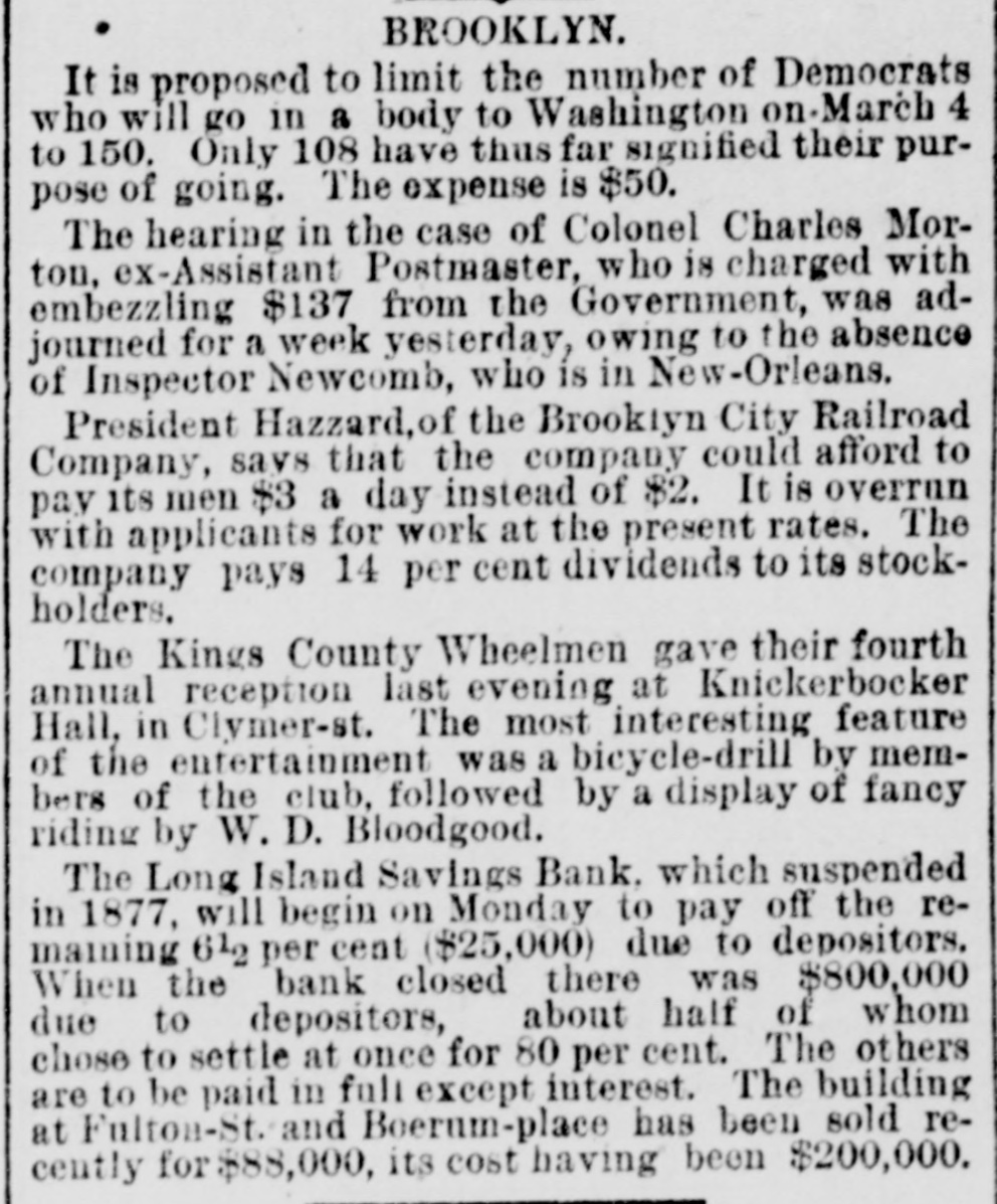 BROOKLYN. It is proposed to limit the number of Democrats who will go in a body to Washington on-March 4 to 150. Only 108 have thus far signified their purpose of going. The expense is $50. The hearing in the case of Colonel Charles Morton, ex-Assistant Postmaster, who is charged with embezzling $137 from the Government, was adjourned for a week yesterday, owing to the absence of Inspector Newcomb, who is in New-Orleans. President Hazzard, of the Brookiyn City Railroad Company, says that the company could afford to pay its men $3 a day instead of $2. It is overrun with applicants for work at the present rates. The company pays 14 per cent dividends to its stockholders. The Kings County Wheelmen gave their fourth annual reception last evening at Knickerbocker Hall, in Clymer-st. The most interesting feature of the entertainment was a bicycle-drill by members of the club, followed by a display of fancy riding by W. D. Bloodgood. The Long Island Savings Bank. which suspended in 1877, will begin on Monday to pay off the remaining 6½ per cent ($25,000) due to depositors. When the bank closed there was $800,000 due to depositors, about half of whom chose to settle at once for 80 per cent. The others are to be paid in full except interest. The building at Fulton-St. and Boerum-place has been sold recently for $88,000, its cost having been $200,000.