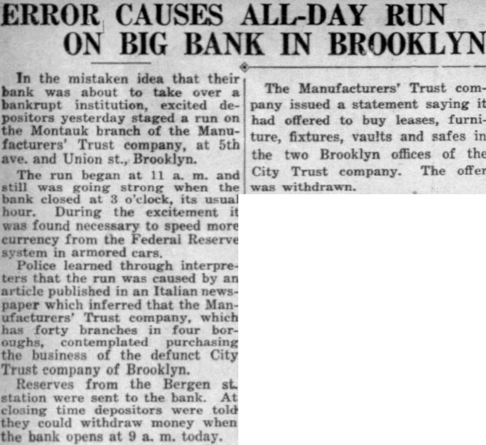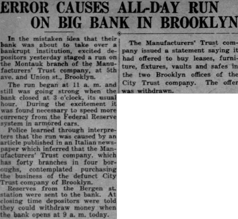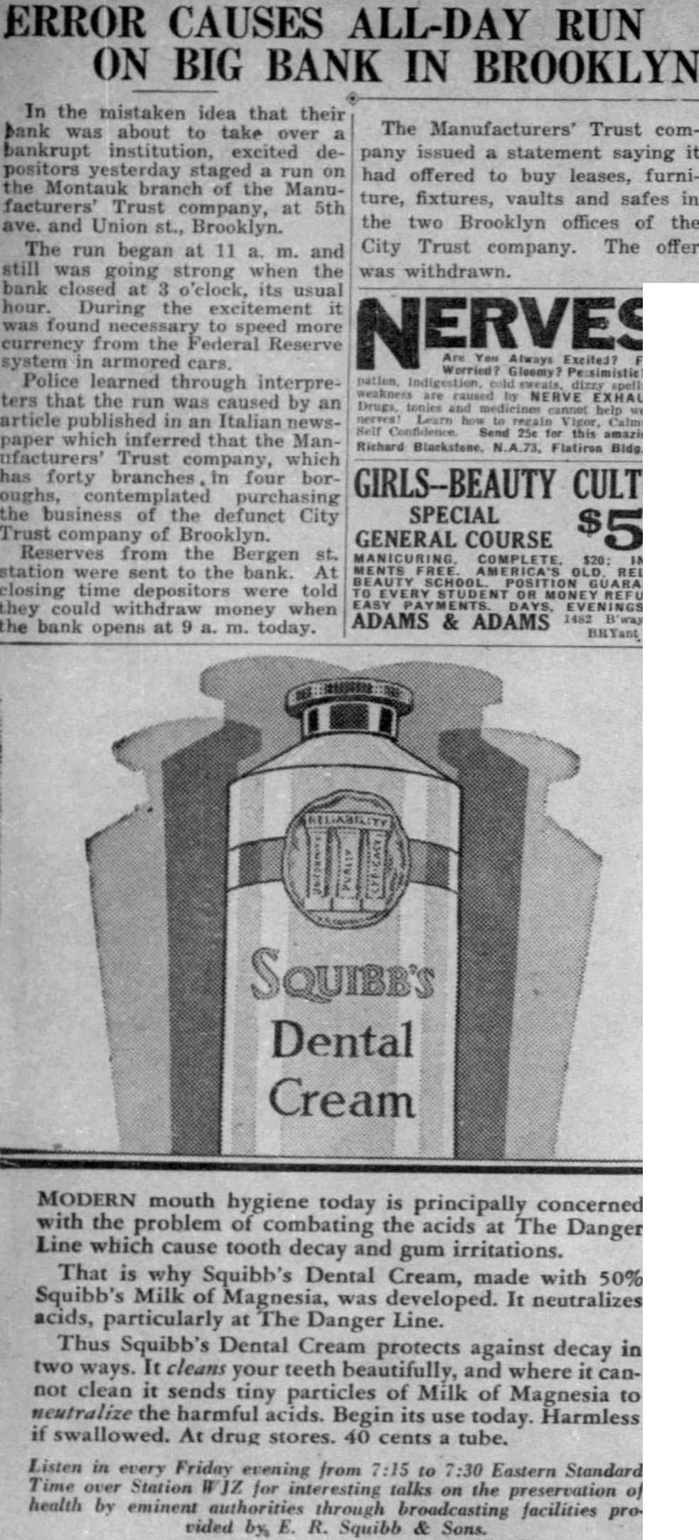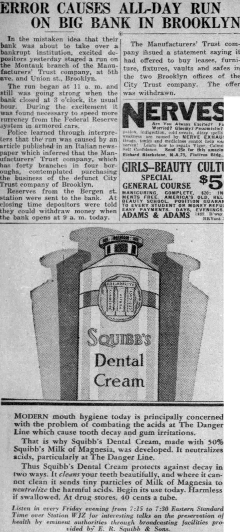 ERROR CAUSES ALL-DAY RUN ON BIG BANK IN BROOKLYN In the mistaken idea that their bank was about to take over a bankrupt institution, excited depositors yesterday staged a run on the Montauk branch of the Manufacturers' Trust company, at 5th ave. and Union st., Brooklyn. The run began at 11 a. m. and still was going strong when the bank closed at 3 o'clock, its usual hour. During the excitement it was found necessary to speed more turrency from the Federal Reserve system in armored cars. Police learned through interpreters that the run was caused by an article published in an Italian newspaper which inferred that the Manufacturers' Trust company, which has forty branches in four boroughs, contemplated purchasing the business of the defunct City Trust company of Brooklyn. Reserves from the Bergen st. station were sent to the bank. At closing time depositors were told they could withdraw money when the bank opens at 9 a. m. today. The Manufacturers' Trust company issued a statement saying it had offered to buy leases, furniture, fixtures, vaults and safes in the two Brooklyn offices of the City Trust company. The offer was withdrawn. Listen in every Friday evening from 7:15 to 7:30 Eastern Standard Time over Station WJZ for interesting talks on the preservation of health by eminent authorities through broadcasting facilities provided by E. R. Squibb & Sons.