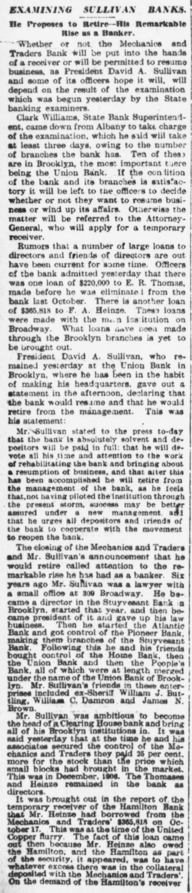 EXAMINING SULLIVAN BANKS. He Proposes to Retire-His Remarkable Rise as a Banker. Whether or not the Mechanics and Traders Bank will be put into the hands of a receiver or will be permitted to resume business, as President David A. Sullivan and some of its officers hope it will, will depend on the result of the examination which was begun yesterday by the State banking examiners. Clark Williams, State Bank Superintendent, came down from Albany to take charge of the examination, which he said will take at least three days, owing to the number of branches the bank has. Ten of these are in Brooklyn, the most important there being the Union Bank. If the con lition of the bank and its branches is satisfactory it will be left to the officers to decide whether or not they want to resume business or wind up its affairs. Otherwise the matter will be referred to the AttorneyGeneral, who will apply for a temporary receiver. Rumors that a number of large loans to directors and friends of directors are out have been current for some time. Officers of the bank admitted yesterday that there was one loan of $220,000 to E. R. Thomas, made before he was eliminated from the bank last October. There is another loan of $365,818 to F. A. Heinze. These loans were made with the me. n institution on Broadway. What loans have been made through the Brooklyn branches is yet to be brought out. President David A. Sullivan, who remained yesterday at the Union Bank in Brooklyn, where he has been in the habit of making his headquarters. gave out a statement in the afternoon, declaring that the bank would resume and that he would retire from the management. This was his statement: Mr.Sullivan stated to the press to-day that the bank is absolutely solvent and depositors will be paid in full: that he will devote all his time and attention to the work of rehabilitating the bank and bringing about a resumption of business, and that alter this has been accomplished he will retire from the management of the bank, as he feels that,not having piloted the institution through the present storm, success may be better assured under a new management. and that he urges all depositors and friends of the bank to cooperate with the movement to reopen the bank. The closing of the Mechanics and Traders and Mr. Sullivan's announcement that he would retire called attention to the remarkable rise he has had as a banker. Six years ago Mr. Sullivan was a lawyer with a small office at 309 Broadway. He became a director in the Stuyvesant Bank n Brooklyn, started that year. and then became president of it and gave up his law business. Then he started the Atlantic Bank and got control of the Pioneer Bank, making them branches of the Stuyvesant Bank. Following this he and his friends bought control of the Home Bank, then the Union Bank and then the People's Bank, all of which were at length merged under the name of the Union Bank of Brooklyn. Mr. Sullivan's friends in these enterprises included ex-Sheriff William J. Buttling, William C. Damron and James N. Brown. Mr. Sullivan was ambitious to become the head of a Clearing House bank and bring all of his Brooklyn institutions in. It was said yesterday that at the time he and his associates secured the control of the Mechanics and Traders they paid 25 per cent. more for the stock than the price which small blocks had brought in the market. This was in December. 1906. The Thomases and Heinze remained in the bank as directors. It was brought out in the report of the temporary receiver of the Hamilton Bank that Mr. Heinze had borrowed from the Mechanics and Traders' $365,818 on October 17. This was at the time of the United Copper flurry. The fact of this loan came out then because Mr. Heinze also owed the Hamilton: and the Hamilton as part of the security, it appeared. was to have whatever excess there was in the collateral deposited with the Mechanics and Traders'. On the demand of the Hamilton's receiver