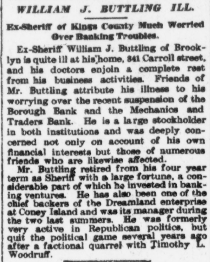 WILLIAM J. BUTTLING ILL. Ex-Sheriff of Kings County Much Worried Over Banking Troubles. Ex-Sheriff William J. Buttling of Brooklyn is quite III at his'home, 841 Carroll street, and his doctors enjoin a complete rest from his business activities. Friends of Mr. Buttling attribute his illness to his worrying over the recent suspension of the Borough Bank and the Mechanics and Traders Bank. He is a large stockholder in both institutions and was deeply concerned not only on account of his own financial interests but those of numerous friends who are likewise affected. Mr. Buttling retired from his four year term as Sheriff with a large fortune, a considerable part of which he invested in banking ventures. He has also been one of the chief backers of the Dreamland enterprise at Coney Island and was its manager during the two last summers. He was formerly very active in Republican politics, but quit the political game several years ago after a factional quarrel with Timothy L. Woodruff.