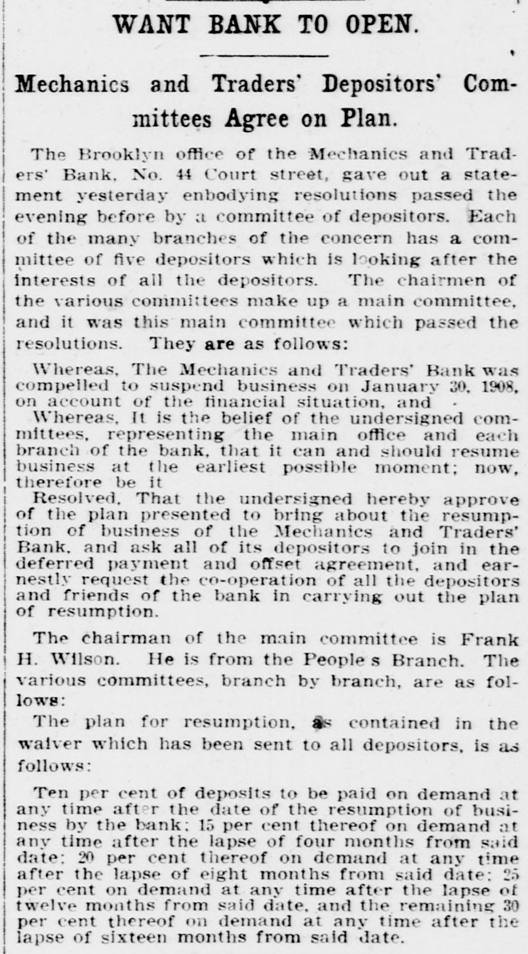 WANT BANK TO OPEN. Mechanics and Traders' Depositors' Committees Agree on Plan. The Brooklyn office of the Mechanics and Traders' Bank, No. 44 Court street, gave out a statement yesterday enbodying resolutions passed the evening before by a committee of depositors. Each of the many branches of the concern has a committee of five depositors which is looking after the interests of all the depositors. The chairmen of the various committees make up a main committee, and it was this main committee which passed the resolutions. They are as follows: Whereas, The Mechanics and Traders' Bank was compelled to suspend business on January 30, 1908, on account of the financial situation, and Whereas, It is the belief of the undersigned committees, representing the main office and each branch of the bank, that it can and should resume business at the earliest possible moment; now, therefore be it Resolved, That the undersigned hereby approve of the plan presented to bring about the resumption of business of the Mechanics and Traders' Bank, and ask all of its depositors to join in the deferred payment and offset agreement, and earnestly request the co-operation of all the depositors and friends of the bank in carrying out the plan of resumption. The chairman of the main committee is Frank H. Wilson. He is from the People's Branch. The various committees, branch by branch, are as follows: contained in the The plan for resumption, waiver which has been sent to all depositors, is as follows: Ten per cent of deposits to be paid on demand at any time after the date of the resumption of business by the bank: 15 per cent thereof on demand at any time after the lapse of four months from said date: 20 per cent thereof on demand at any time after the lapse of eight months from said date: 25 per cent on demand at any time after the lapse of twelve months from said date, and the remaining 30 per cent thereof on demand at any time after the lapse of sixteen months from said date.