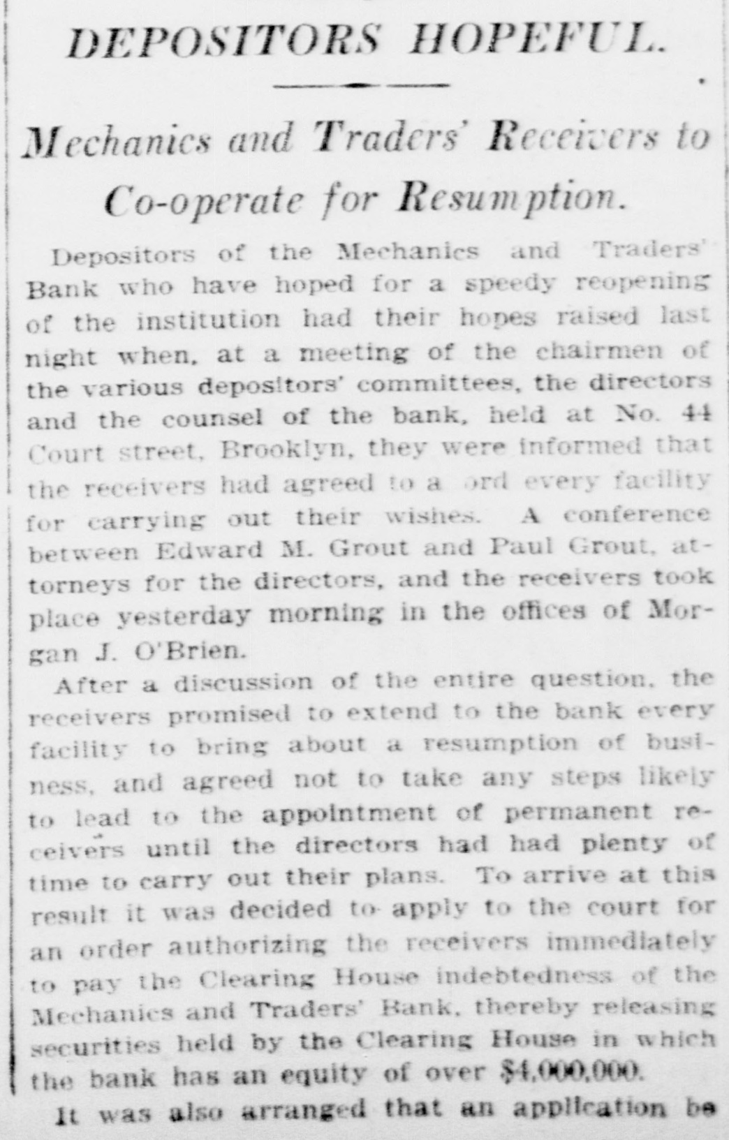 DEPOSITORS HOPEFUL. Mechanics and Traders' Receivers to Co-operate for Resumption. Depositors of the Mechanics and Traders' Bank who have hoped for a speedy reopening of the institution had their hopes raised last night when, at a meeting of the chairmen of the various depositors' committees, the directors and the counsel of the bank, held at No. 44 Court street, Brooklyn, they were informed that the receivers had agreed to a ord every facility for carrying out their wishes. A conference between Edward M. Grout and Paul Grout. attorneys for the directors, and the receivers took place yesterday morning in the offices of Morgan J. O'Brien. After a discussion of the entire question. the receivers promised to extend to the bank every facility to bring about a resumption of business, and agreed not to take any steps likely to lead to the appointment of permanent receivers until the directors had had plenty of time to carry out their plans. To arrive at this result it was decided to apply to the court for an order authorizing the receivers immediately to pay the Clearing House indebtedness of the Mechanics and Traders' Bank, thereby releasing securities held by the Clearing House in which the bank has an equity of over $4,000,000. It was also arranged that an application be