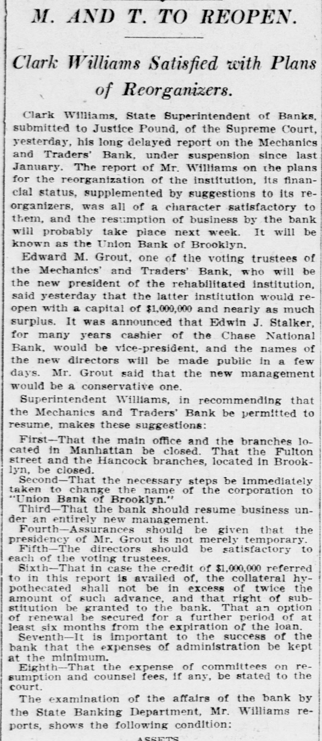 M. AND T. TO REOPEN. Clark Williams Satisfied with Plans of Reorganizers. Clark Williams, State Superintendent of Banks, submitted to Justice Pound, of the Supreme Court, yesterday, his long delayed report on the Mechanics and Traders' Bank, under suspension since last January. The report of Mr. Williams on the plans for the reorganization of the institution, its financial status, supplemented by suggestions to its reorganizers, was all of a character satisfactory to them, and the resumption of business by the bank will probably take place next week. It will be known as the Union Bank of Brooklyn. Edward M. Grout, one of the voting trustees of the Mechanics' and Traders' Bank, who will be the new president of the rehabilitated institution, said yesterday that the latter institution would reopen with a capital of $1,000,000 and nearly as much surplus. It was announced that Edwin J. Stalker, for many years cashier of the Chase National Bank, would be vice-president, and the names of the new directors will be made public in a few days. Mr. Grout said that the new management would be a conservative one. Superintendent Williams, in recommending that the Mechanics and Traders' Bank be permitted to resume, makes these suggestions: First-That the main office and the branches 10cated in Manhattan be closed. That the Fulton street and the Hancock branches, located in Brooklyn, be closed. Second-That the necessary steps be immediately taken to change the name of the corporation to "Union Bank of Brooklyn." Third-That the bank should resume business under an entirely new management. Fourth-Assurances should be given that the presidency of Mr. Grout is not merely temporary. Fifth-The directors should be satisfactory to each of the voting trustees. Sixth-That in case the credit of $1,000,000 referred to in this report is availed of, the collateral hypothecated shall not be in excess of twice the amount of such advance, and that right of substitution be granted to the bank. That an option of renewal be secured for a further period of at least six months from the expiration of the loan. Seventh-It is important to the success of the bank that the expenses of administration be kept at the minimum. Eighth-That the expense of committees on resumption and counsel fees, if any, be stated to the court. The examination of the affairs of the bank by the State Banking Department, Mr. Williams reports, shows the following condition: ASSETS