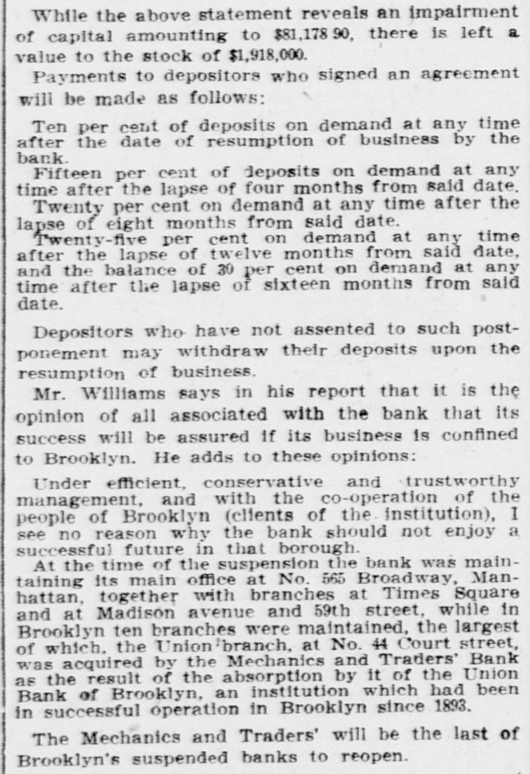 While the above statement reveals an impairment of capital amounting to $81,178 90, there is left a value to the stock of $1,918,000. Payments to depositors who signed an agreement will be made as follows: Ten per cent of deposits on demand at any time after the date of resumption of business by the bank. Fifteen per cent of deposits on demand at any time after the lapse of four months from said date. Twenty per cent on demand at any time after the lapse of eight months from said date. Twenty-five per cent on demand at any time after the lapse of twelve months from said date, and the balance of 30 per cent on demand at any time after the lapse of sixteen months from said date. Depositors who have not assented to such postponement may withdraw their deposits upon the resumption of business. Mr. Williams says in his report that it is the opinion of all associated with the bank that its success will be assured if its business is confined to Brooklyn. He adds to these opinions: Under efficient, conservative and trustworthy management, and with the co-operation of the people of Brooklyn (clients of the institution), I see no reason why the bank should not enjoy a successful future in that borough. At the time of the suspension the bank was maintaining its main office at No. 565 Broadway, Manhattan, together with branches at Times Square and at Madison avenue and 59th street, while in Brooklyn ten branches were maintained, the largest of which. the Union branch, at No. 44 Court street, was acquired by the Mechanics and Traders' Bank as the result of the absorption by it of the Union Bank of Brooklyn, an institution which had been in successful operation in Brooklyn since 1893. The Mechanics and Traders' will be the last of Brooklyn's suspended banks to reopen.