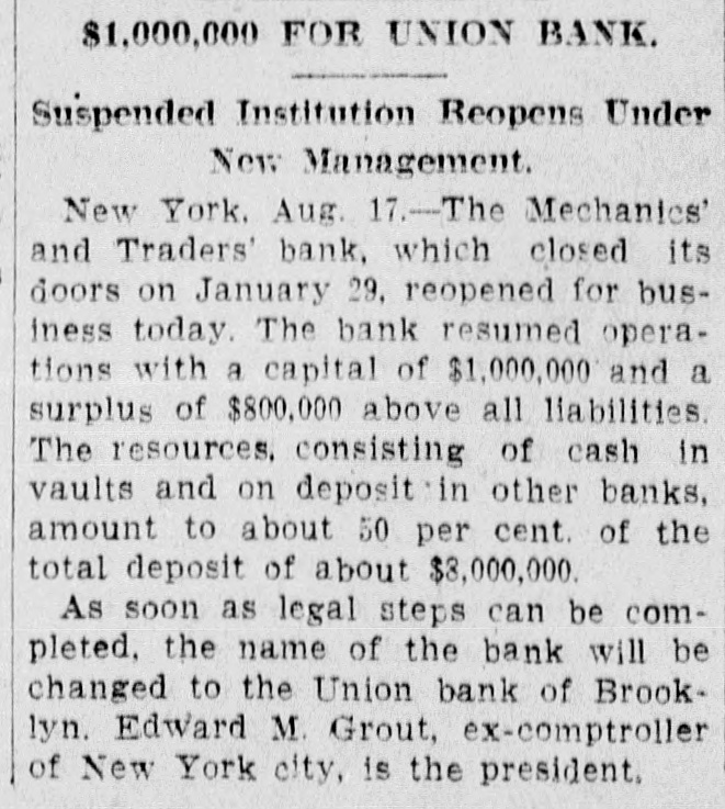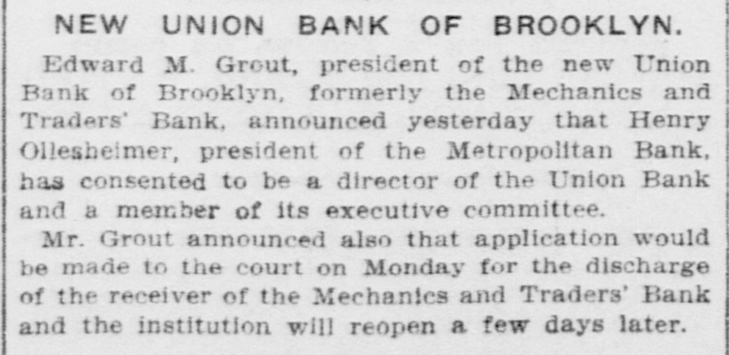 The Mechanics' and Traders bank, which closed its doors on January 29, reopened for business today... As soon as legal steps can be completed, the name of the bank will be changed to the Union bank of Brooklyn. Edward M. Grout... is the president.