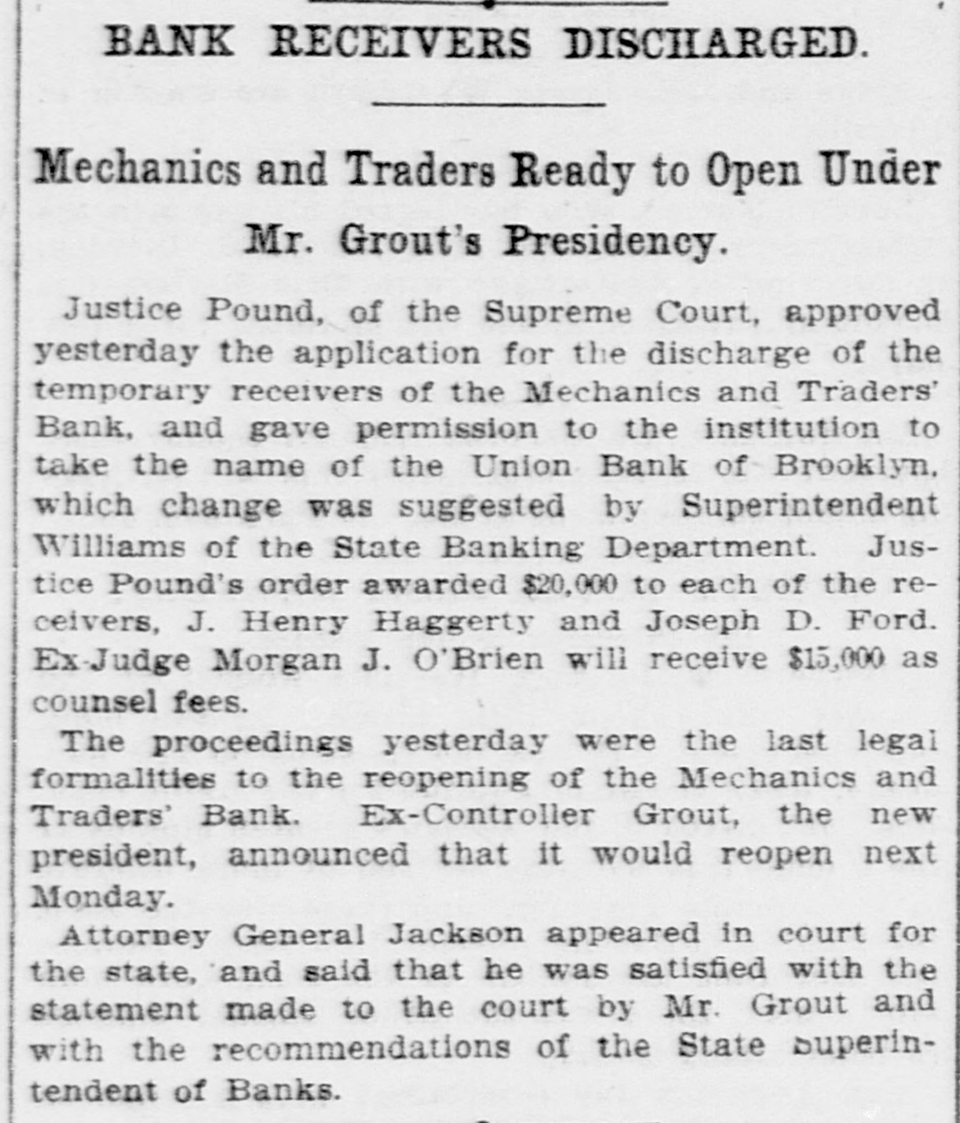 BANK RECEIVERS DISCHARGED. Mechanics and Traders Ready to Open Under Mr. Grout's Presidency. Justice Pound, of the Supreme Court, approved yesterday the application for the discharge of the temporary receivers of the Mechanics and Traders' Bank, and gave permission to the institution to take the name of the Union Bank of Brooklyn. which change was suggested by Superintendent Williams of the State Banking Department. Justice Pound's order awarded $20,000 to each of the receivers, J. Henry Haggerty and Joseph D. Ford. Ex-Judge Morgan J. O'Brien will receive $15,000 as counsel fees. The proceedings yesterday were the last legal formalities to the reopening of the Mechanics and Traders' Bank. Ex-Controller Grout, the new president, announced that it would reopen next Monday. Attorney General Jackson appeared in court for the state, and said that he was satisfied with the statement made to the court by Mr. Grout and with the recommendations of the State Superintendent of Banks.