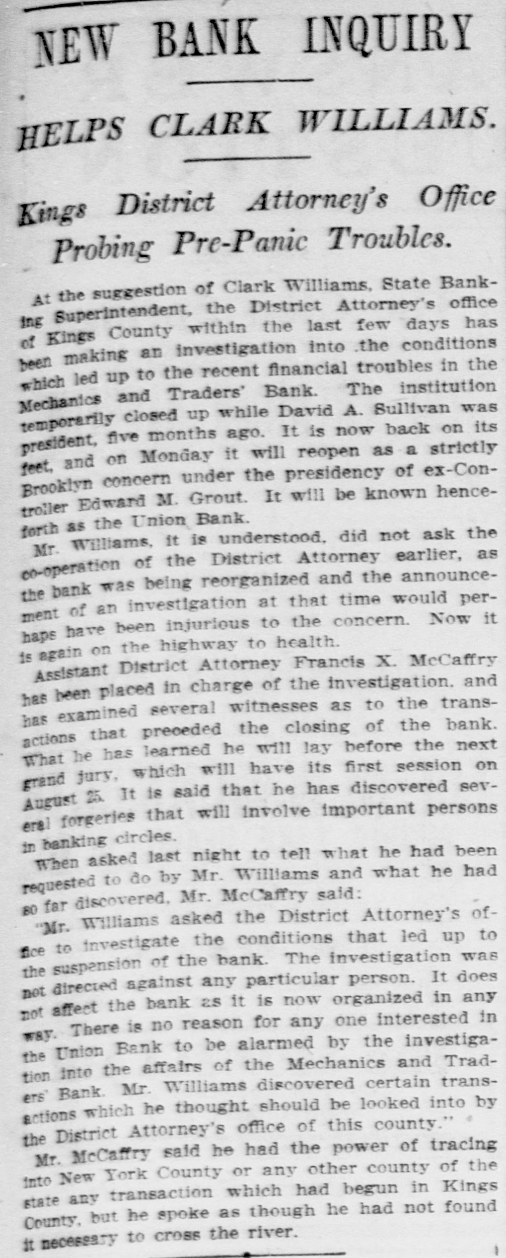 NEW BANK INQUIRY HELPS CLARK WILLIAMS. Kings District Attorney's Office Probing Pre-Panic Troubles. At the suggestion of Clark Williams, State Banking Superintendent, the District Attorney's office of Kings County within the last few days has been making an investigation into the conditions which led up to the recent financial troubles in the Mechanics and Traders' Bank. The institution temporarily closed up while David A. Sullivan was president, five months ago. It is now back on its feet, and on Monday it will reopen as a strictly Brooklyn concern under the presidency of ex-Controller Edward M. Grout. It will be known henceforth as the Union Bank. Mr. Williams, it is understood, did not ask the co-operation of the District Attorney earlier, as the bank was being reorganized and the announcement of an investigation at that time would perhaps have been injurious to the concern. Now it is again on the highway to health. Assistant District Attorney Francis X. McCaffry has been placed in charge of the investigation. and has examined several witnesses as to the transactions that preceded the closing of the bank. What he has learned he will lay before the next grand jury, which will have its first session on August 25. It is said that he has discovered several forgeries that will involve important persons in banking circles. When asked last night to tell what he had been requested to do by Mr. Williams and what he had 80 far discovered, Mr. McCaffry said: "Mr. Williams asked the District Attorney's office to investigate the conditions that led up to the suspension of the bank. The investigation was not directed against any particular person. It does not affect the bank 2S it is now organized in any way. There is no reason for any one interested in the Union Bank to be alarmed by the investigation into the affairs of the Mechanics and Traders Bank Mr. Williams discovered certain transactions which he thought should be looked into by the District Attorney's office of this county." Mr. McCaffry said he had the power of tracing into New York County or any other county of the state any transaction which had begun in Kings County, but he spoke as though he had not found It necessary to cross the river.