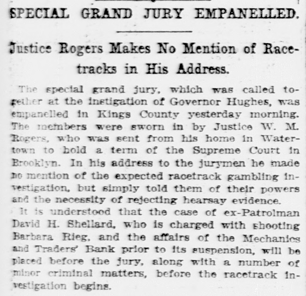 SPECIAL GRAND JURY EMPANELLED. Justice Rogers Makes No Mention of Racetracks in His Address. The special grand jury, which was called together at the instigation of Governor Hughes, was empanelled in Kings County yesterday morning. The members were sworn in by Justice W. M. Rogers, who was sent from his home in Watertown to hold a term of the Supreme Court in Brooklyn. In his address to the jurymen he made no mention of the expected racetrack gambling investigation, but simply told them of their powers and the necessity of rejecting hearsay evidence. It is understood that the case of ex-Patrolman David H. Shellard, who is charged with shooting Barbara Rieg, and the affairs of the Mechanics and Traders' Bank prior to its suspension, will be placed before the jury, along with a number of minor criminal matters, before the racetrack investigation begins.