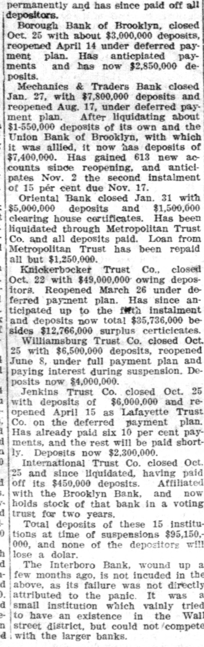 permanently and has since paid off all depositors. Borough Bank of Brooklyn, closed Oct. 25 with about $3,000,000 deposits, reopened April 14 under deferred payment plan. Has anticpiated payments and has now $2,850,000 deposits. Mechanics & Traders Bank closed Jan. 27, with $7,800,000 deposits and reopened Aug. 17, under deferred payment plan. After liquidating about $1-550,000 deposits of its own and the Union Bank of Brooklyn, with which it was allied, it now has deposits of $7,400,000. Has gained 613 new accounts since reopening, and anticlpates Nov. 2 the second instalment of 15 pér cent due Nov. 17. Oriental Bank closed Jan. 31 with $5,000,000 deposits and $1,500,000 clearing house certificates. Has been liquidated through Metropolitan Trust Co. and all deposits paid. Loan from Metropolitan Trust has been repaid all but $1,250,000. Knickerbocker Trust Co., closed Oct. 22 with $49,000,000 owing depositors. Reopened March 26 under deferred payment plan. Has since anticipated up to the fifth instalment and deposits now total $35,736,000 besides $12,766,000 surplus certicicates. Williamsburg Trust Co. closed Oct. 25 with $6,500,000 deposits, reopened June 8, under full payment plan and paying interest during suspension. Deposits now $4,000,000. Jenkins Trust Co. closed Oct. 25 with deposits of $6,000,000 and reopened April 15 as Lafayette Trust Co. on the deferred payment plan. Has already paid six 10 per cent payments, and the rest will be paid shortly. Deposits now $2,300,000. International Trust Co. closed Oct. 25 and since liquidated, having paid off its $450,000 deposits. Affiliated with the Brooklyn Bank, and now holds stock of that bank in a voting d trust for two years. Total deposits of these 15 institutions at time of suspensions $95,150,000, and none of the depositors will lose a dolar. d The Interboro Bank, wound up a few months ago, is not incuded in the d above, as its failure was not directly attributed to the panic. It was a d small institution which vainly tried to have an existence in the Wall n street district, but could not /compete d with the larger banks.