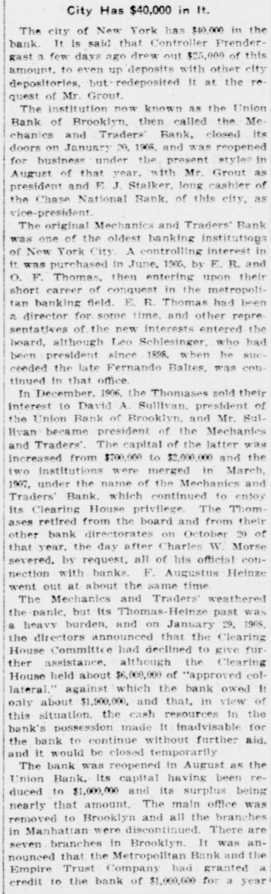 City Has $40,000 in It. The city of New York has $40,000 in the bank. It is said that Controller Prendergast a few days ago drew out $25,000 of this amount, to even up deposits with other city depositories, but-redeposited It at the request of Mr. Grout. The institution now known as the Union Bank of Brooklyn, then called the Mechanics and Traders' Bank, closed its doors on January 20, 1908, and was reopened for business under the present style in August of that year, with Mr. Grout as president and E. J. Stalker. long cashier of the Chase National Bank, of this city, as vice-president. The original Mechanics and Traders' Bank was one of the oldest banking institutions of New York City. A controlling interest in It. was purchased in June, 1905, by E. R. and O. F. Thomas, then entering upon their short career of conquest in the metropolitan banking field. E. R. Thomas had been a director for some time, and other representatives of the new interests entered the board, although Leo Schlesinger. who had been president since 1898, when he succeeded the late Fernando Baltes, was continued in that office. In December, 1906, the Thomases sold their interest to David A. Sullivan, president of the Union Bank of Brooklyn. and Mr. Sullivan became president of the Mechanics and Traders'. The capital of the latter was increased from $700,000 to $2,000,000 and the two Institutions were merged in March, 1907, under the name of the Mechanics and Traders' Bank. which continued to enjoy its Clearing House privilege. The Thomases retired from the board and from their other bank directorates on October 20 of that year, the day after Charles W. Morse severed. by request, all of his official connection with banks. F. Augustus Heinze went out at about the same time. The Mechanics and Traders' weathered the panic, but its Thomas-Heinze past was a heavy burden, and on January 29, 1908, the directors announced that the Clearing House Committee had declined to give further assistance, although the Clearing House held about $6,000,000 of "approved collateral." against which the bank owed It only about $1,900,000, and that, in view of this situation, the cash resources in the bank's possession made it inadvisable for the bank to continue without further aid, and it would be closed temporarily The bank was reopened in August as the Union Bank, its capital having been reduced to $1,000,000 and its surplus being nearly that amount. The main office was removed to Brooklyn and all the branches in Manhattan were discontinued. There are seven branches in Brooklyn. It was announced that the Metropolitan Bank and the Empire Trust Company had granted a credit to the bank of $1,000,000 for a year