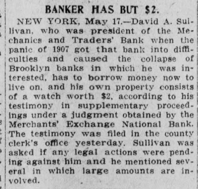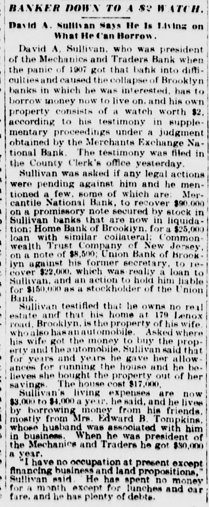 BANKER DOWN TO A $2 " ATCH. David A. Sullivan says He Is Living on What He Can Borrow. David A. Sullivan. who was president of the Mechanics and Traders Bank when the panic of 1907 got that bank into difficuities and caused the collapse of Brooklyn banks in which he was interested, has to borrow money now to live on. and his own property consists of a watch worth $2. according to his testimony in supplementary proceedings under a judgment obtained by the Merchants Exchange National Bank. The testimony was filed in the County Clerk's office yesterday. Sullivan was asked if any legal actions were pending against him and he mentioned a few. some of which are: Mercantile National Bank, to recover $90.000 on a promissory note secured by stock in Sullivan banks that are now in liquidation: Home Bank of Brooklyn. for a $25,000 loan with similar collateral: Commonwealth Trust Company of New Jersey, on a note of $8,500; Union Bank of Brooklyn against his former secretary, to recover $22,000. which was really a loan to Sullivan. and an action to hold him liable for $150,000 as a stockholder of the Union Bank. Sullivan testified that he owns no real estate and that his home at 179 Lenox road. Brooklyn, is the property of his wife. who also hasanautomobile. Asked where his wife got the money to buy the property and the automobile, Sullivan said that for years and years he gave her allowances for running the house and he believes she bought the property out of her savings. The house cost $17,000. Sullivan's living expenses are now $3.000 to $4,000 a year. he said. and he lives by borrowing money from his friends. mostly from Mrs. Edward B. Tompkins. whose husband was associated with him in business. When he was president of the Mechanics and Traders he got $30,000 a year. "I have no occupation at present except financing business and land propositions. Sullivan said. He has spent no money for a month except for lunches and car fare. and he has plenty of debte.