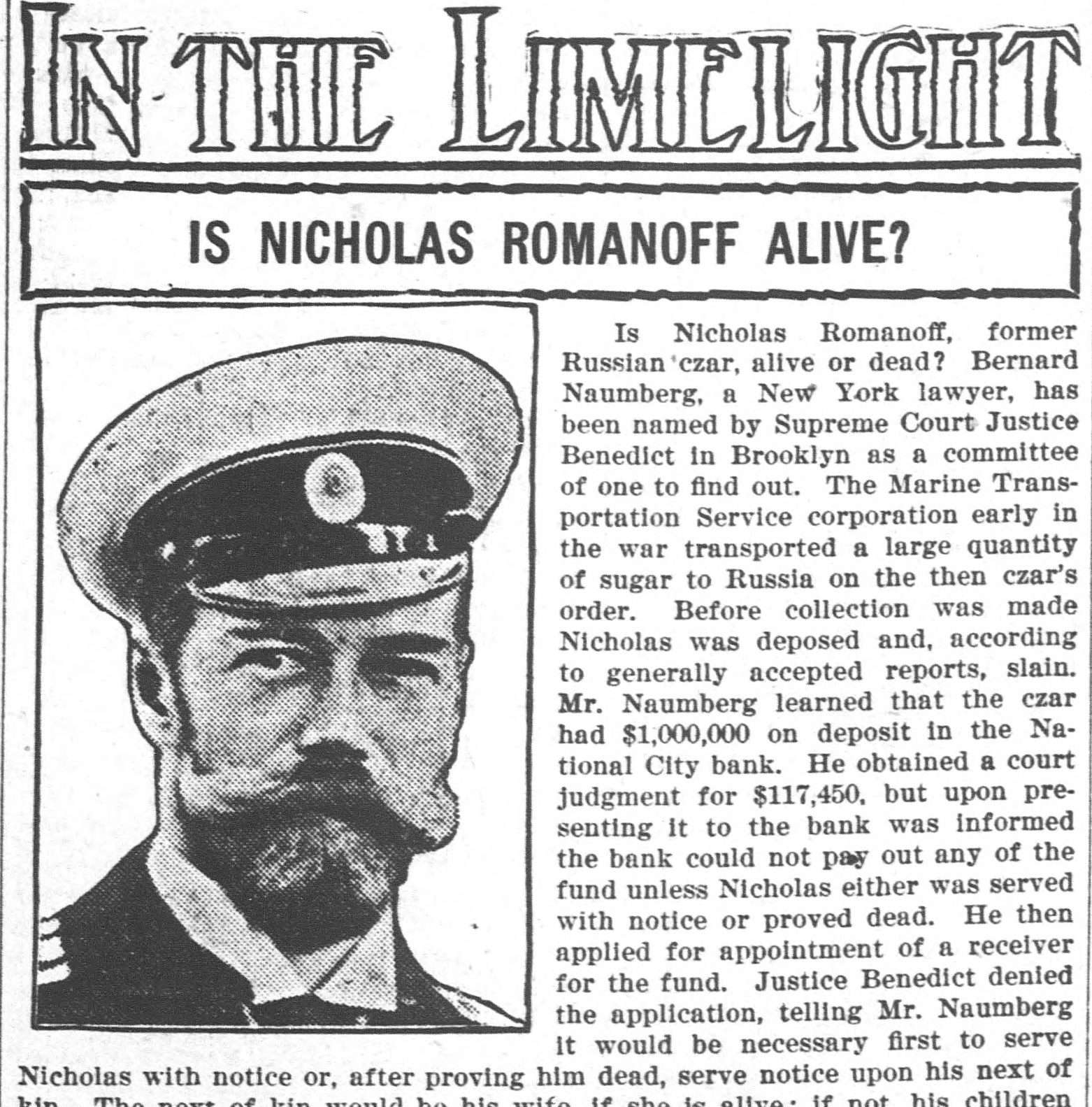 THE LIMELIGHT IS NICHOLAS ROMANOFF ALIVE? Is Nicholas Romanoff, former Russian'czar, alive or dead? Bernard Naumberg, a New York lawyer, has been named by Supreme Court Justice Benedict in Brooklyn as a committee of one to find out. The Marine Transportation Service corporation early in the war transported a large quantity of sugar to Russia on the then czar's order. Before collection was made Nicholas was deposed and, according to generally accepted reports, slain. Mr. Naumberg learned that the czar had $1,000,000 on deposit in the National City bank. He obtained a court judgment for $117,450. but upon presenting it to the bank was informed the bank could not pay out any of the fund unless Nicholas either was served with notice or proved dead. He then applied for appointment of a receiver for the fund. Justice Benedict denied the application, telling Mr. Naumberg it would be necessary first to serve Nicholas with notice or, after proving him dead, serve notice upon his next of children his in not if