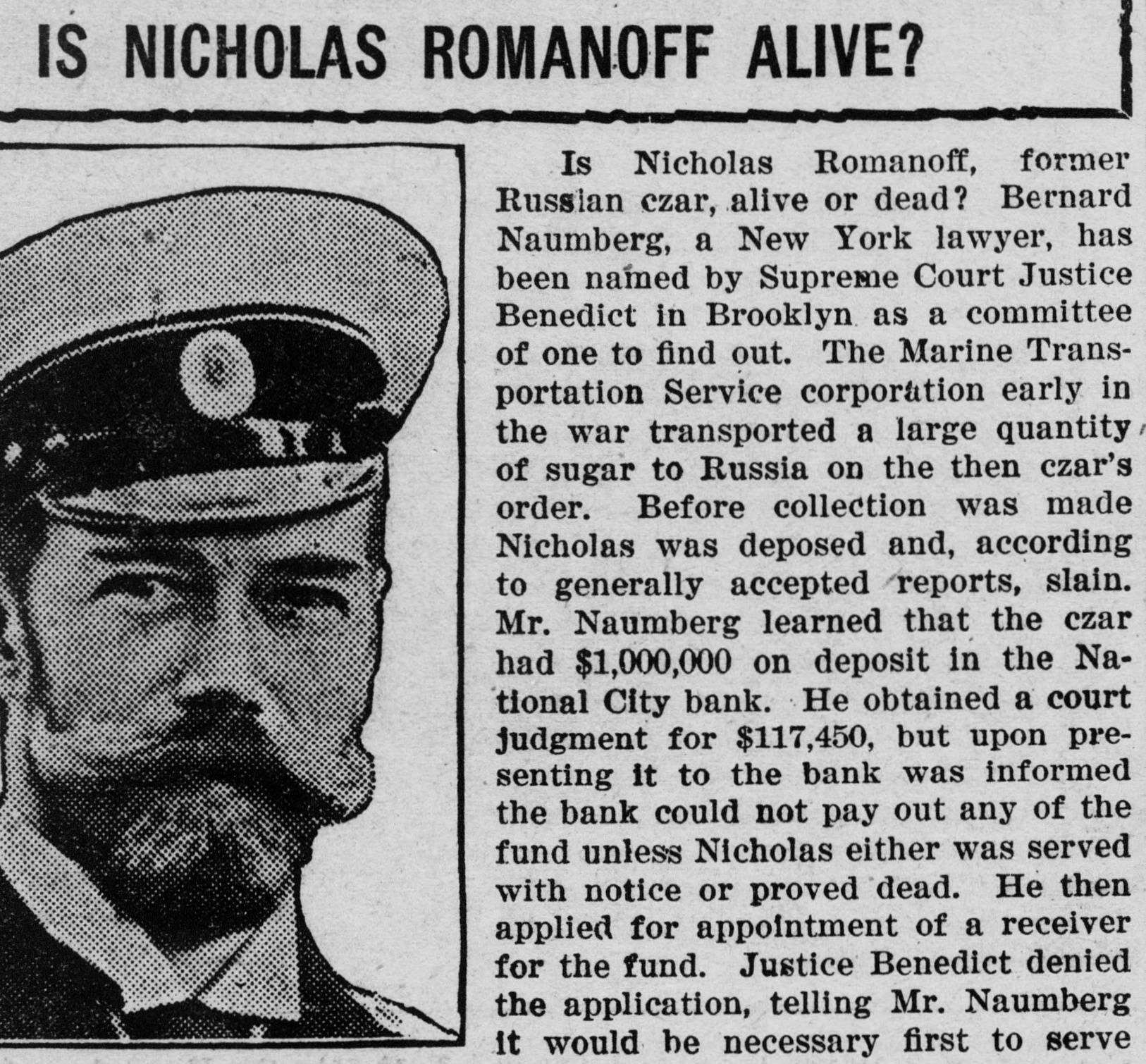 IS NICHOLAS ROMANOFF ALIVE? Is Nicholas Romanoff, former Russian czar, alive or dead? Bernard Naumberg, a New York lawyer, has been named by Supreme Court Justice Benedict in Brooklyn as a committee of one to find out. The Marine Transportation Service corporation early in the war transported a large quantity of sugar to Russia on the then czar's order. Before collection was made Nicholas was deposed and, according to generally accepted reports, slain. Mr. Naumberg learned that the czar had $1,000,000 on deposit in the National City bank. He obtained a court judgment for $117,450, but upon presenting it to the bank was informed the bank could not pay out any of the fund unless Nicholas either was served with notice or proved dead. He then applied for appointment of a receiver for the fund. Justice Benedict denied the application, telling Mr. Naumberg it would he necessary first to serve