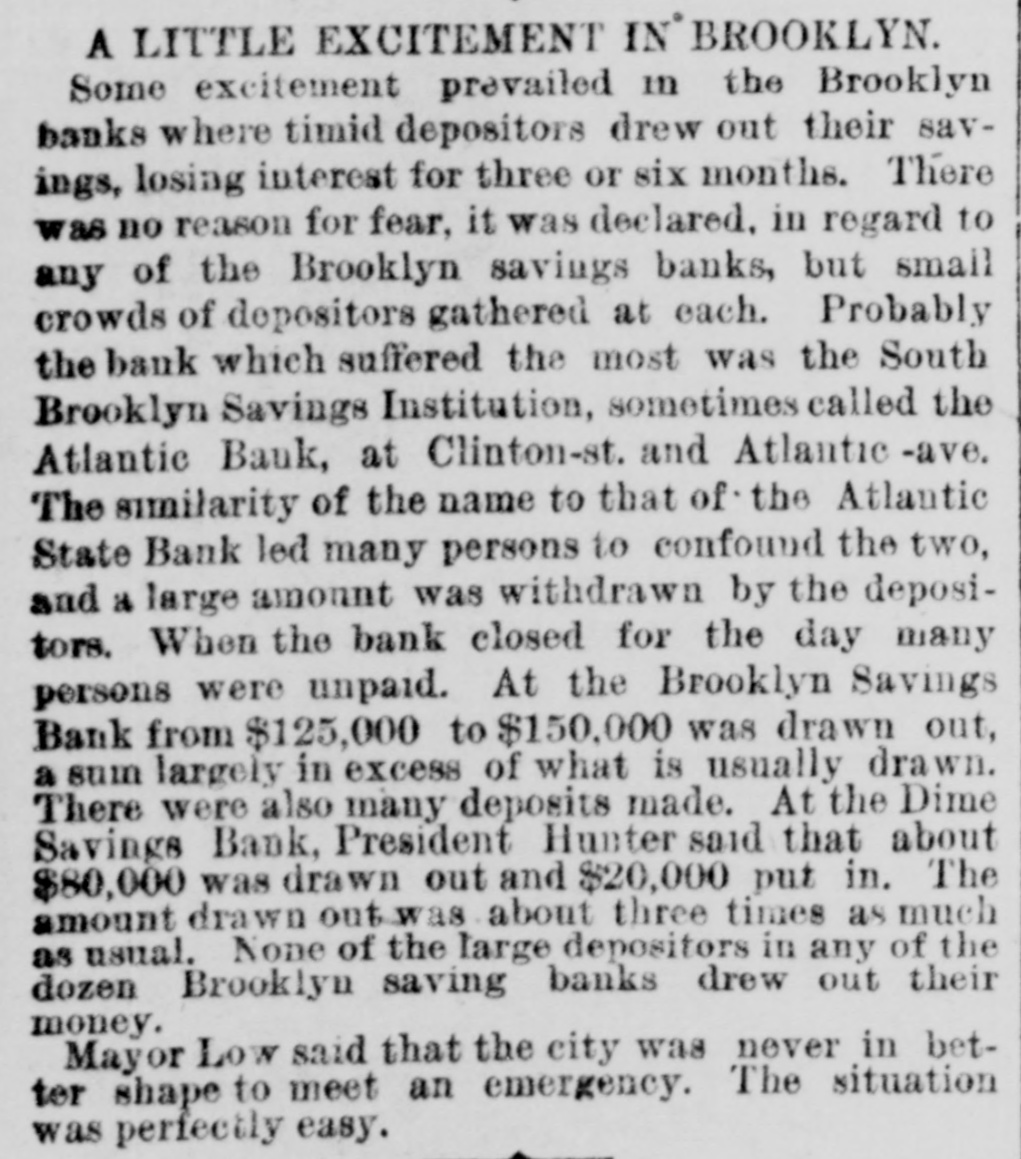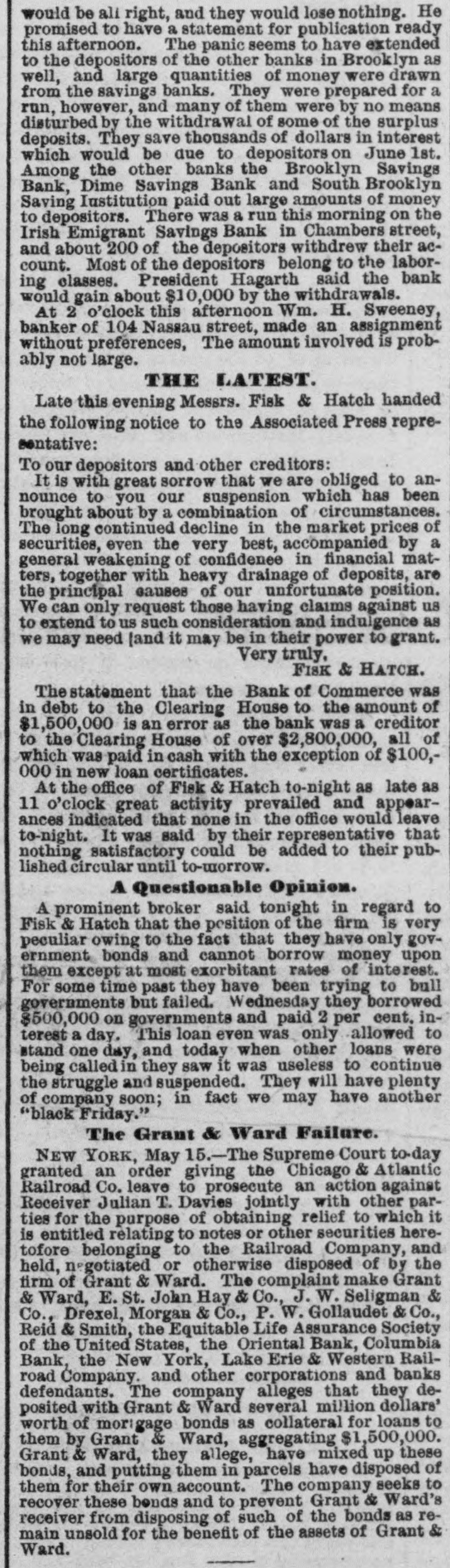 would be all right, and they would lose nothing. He promised to have a statement for publication ready this afternoon. The panic seems to have extended to the depositors of the other banks in Brooklyn as well, and large quantities of money were drawn from the savings banks. They were prepared for a run, however, and many of them were by no means disturbed by the withdrawal of some of the surplus deposits. They save thousands of dollars in interest which would be due to depositors on June 1st. Among the other banks the Brooklyn Savings Bank, Dime Savings Bank and South Brooklyn Saving Institution paid out large amounts of money to depositors. There was a run this morning on the Irish Emigrant Savings Bank in Chambers street, and about 200 of the depositors withdrew their account. Most of the depositors belong to the laboring classes. President Hagarth said the bank would gain about $10,000 by the withdrawals. At 2 o'clock this afternoon Wm. H. Sweeney, banker of 104 Nassau street, made an assignment without preferences, The amount involved is probably not large. THE LATEST. Late this evening Messrs. Fisk & Hatch handed the following notice to the Associated Press reprecontative: To our depositors and other creditors: It is with great sorrow that we are obliged to announce to you our suspension which has been brought about by a combination of circumstances. The long continued decline in the market prices of securities, even the very best, accompanied by a general weakening of confidence in financial matters, together with heavy drainage of deposits, are the principal causes of our unfortunate position. We can only request those having claims against us to extend to us such consideration and indulgence as we may need [and it may be in their power to grant. Very truly, FISK & HATCH. The statement that the Bank of Commerce was in debt to the Clearing House to the amount of $1,500,000 is an error as the bank was a creditor to the Clearing House of over $2,800,000, all of which was paid in cash with the exception of $100,000 in new loan certificates. At the office of Fisk & Hatch to-night as late as 11 o'clock great activity prevailed and appearances indicated that none in the office would leave to-night. It was said by their representative that nothing satisfactory could be added to their published circular until to-morrow. A Questionable Opinion. A prominent broker said tonight in regard to Fisk & Hatch that the position of the firm is very peculiar owing to the fact that they have only government bonds and cannot borrow money upon them except at most exorbitant rates of interest. For some time past they have been trying to bull governments but failed. Wednesday they borrowed $500,000 on governments and paid 2 per cent. interest a day. This loan even was only allowed to stand one day, and today when other loans were being called in they saw it was useless to continue the struggle and suspended. They will have plenty of company soon; in fact we may have another "black Friday." The Grant & Ward Failure. NEW YORK, May 15.-The Supreme Court to-day granted an order giving the Chicago & Atlantic Railroad Co. leave to prosecute an action against Receiver Julian T. Davies jointly with other parties for the purpose of obtaining relief to which it is entitled relating to notes or other securities heretofore belonging to the Railroad Company, and held, negotiated or otherwise disposed of by the firm of Grant & Ward. The complaint make Grant & Ward, E. St. John Hay & Co., J. W. Seligman & Co., Drexel, Morgan & Co., P. W. Gollaudet & Co., Reid & Smith, the Equitable Life Assurance Society of the United States, the Oriental Bank, Columbia Bank, the New York, Lake Erie & Western Railroad Company. and other corporations and banks defendants. The company alleges that they deposited with Grant & Ward several million dollars' worth of mortgage bonds as collateral for loans to them by Grant & Ward, aggregating $1,500,000. Grant & Ward, they allege, have mixed up these bonds, and putting them in parcels have disposed of them for their own account. The company seeks to recover these bonds and to prevent Grant & Ward's receiver from disposing of such of the bonds as remain unsold for the benefit of the assets of Grant & Ward.