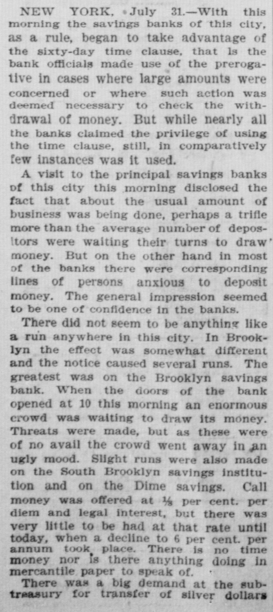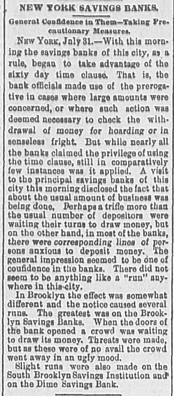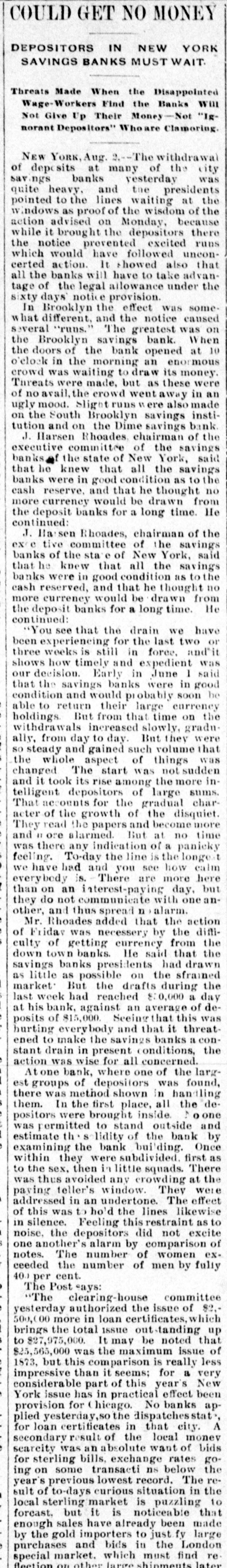 KATE GANNETT WELLS. CONCERNING BUSINESS AND FINANCE. CHICAGO, July 81.-A special from Denver, Col., says that Attorney General Engloy has rendered an opinion to the effect that it is within the power of the Legislature to enact appropriate legislation for the establishment of a statutory depository of silver bullion and the issuance of certificates thereon, assignable to delivery and receivable by the State in the payment of State taxes. WASHINGTON, July 31.-Acting Mint Director Preston characterizes as & wild heresy the proposition of State Attorney General Engley, of Colorado, to establish State bullion depository to issue certificates against silver bullion. The scheme is not violative of the United States statutes, it is said, but it is regarded at the treasury as a temporary make-shift and impracticable. NEW YORK, July 31.-With this morning the savings banks, as & rule, began to take advantage of the sixty day time clause. That is, the bank officials made use of the prerogative in cases where large amounts were concerned, or where such action was deemed necessary to check the withdrawal of money for hoarding or in senseless fright. But while nearly all the banks claimed the privilege of using the time clause, still in comparatively few instances was it applied. A visit to the principal savings banks of this city this morning disclosed the fact that about the usual amount of business was being done. Perhaps & trifte more than the average number of depositors were waiting their turns to draw money, but on the other hand, in most of the banks there were corresponding lines of persons anxious to deposit money. The general impression seemed to be one of confidence in the banks. There did not seem to be anything like a "run" anywhere in this city. In Brooklyn the effect was somewhat different, and the notice caused several runs. The greatest was on the Brooklyn Savings Bank. When the doors of the bank opened a crowd was waiting to draw its money. Threats were made, but as these were of no avail the crowd went away in an ugly mood. Slight runs were also made on the South Brooklyn Savings Institution, and on the Dime Savings Bank. AKRON, O., July 31.-The Akron Savings bank did not open this morning for business. William Buchtel, President of the bank, has been appointed receiver. The capital stock is $200,000, with a reserve fund of $50,000 and undivided profits of $18,000. The bank will pay dollar for dollar. Cause of suspension, inability to realize on securities. HORNELLSVILLE, N. Y., July 31.-The private balking house of N. M. Crane & Company closed its doors this morning. The suspension is attributed to the general stringency prevailing in business circles, and the value of the assets are stated to equal the liabilities, but cannot be realized on at present. MILWAUKEE, WIS., July 31.-A special from Ashland, Wis., savs the First National Bank of Ashland, Wis., failed to open its doors this morning. There has been a steady draw on the banks deposits for & month past. Its resoerces according to the statement filed July 15, were $396,. 488. D. R. Ellis is President and ex-Governor Sam S. Fifield Vice President. The other banks are experiencing runs in consequence of the First National failure. CHICAGO, July 31.-As a result of the big drop in the price of September wheat on the Board of Trade to-day the firm of Lyon & Hurlburt notified its customers to protect themselves. The firm is understood to have been carrying 800,000 bushels of wheat on which there was a loss of some $70,000, but was short about 600,000 bushels of corn on which there was a profit of $20,000, leaving a net loss of $50,000. The firm promises to pay in full as soon as it can realize on collaterals. The senior member of the firm, J. B. Lyon, is one of the oldest and best known members of the Board of Trade and at one time made a great stir by running a corner in corn.