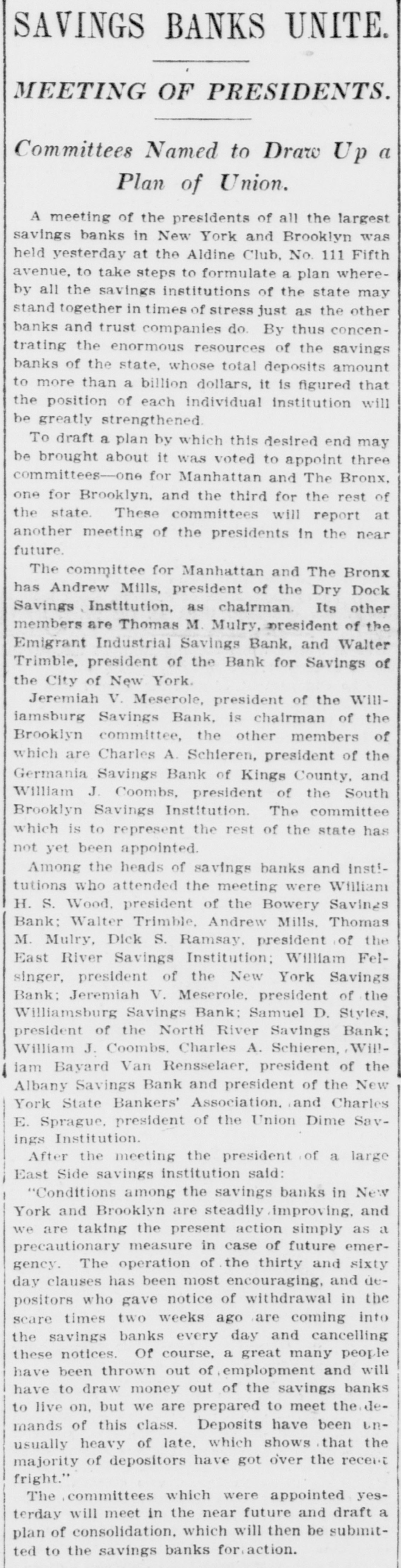 SAVINGS BANKS UNITE. MEETING OF PRESIDENTS. Committees Named to Draw Up a Plan of Union. A meeting of the presidents of all the largest savings banks in New York and Brooklyn was held yesterday at the Aldine Club, No. 111 Fifth avenue, to take steps to formulate a plan whereby all the savings institutions of the state may stand together in times of stress just as the other banks and trust companies do. By thus concentrating the enormous resources of the savings banks of the state, whose total deposits amount to more than a billion dollars, it is figured that the position of each individual institution will be greatly strengthened To draft a plan by which this desired end may be brought about it was voted to appoint three committees-one for Manhattan and The Bronx. one for Brooklyn, and the third for the rest of the state. These committees will report at another meeting of the presidents in the near future. The committee for Manhattan and The Bronx has Andrew Mills, president of the Dry Dock Savings Institution, as chairman. Its other members are Thomas M. Mulry, president of the Emigrant Industrial Savings Bank, and Walter Trimble, president of the Bank for Savings of the City of New York. Jeremiah V. Meserole, president of the Williamsburg Savings Bank, is chairman of the Brooklyn committee, the other members of which are Charles A. Schleren, president of the Germania Savings Bank of Kings County, and William J. Coombs, president of the South Brooklyn Savings Institution. The committee which is to represent the rest of the state has not yet been appointed. Among the heads of savings banks and inst!tutions who attended the meeting were William H. S. Wood. president of the Bowery Savings Bank: Walter Trimble, Andrew Mills, Thomas M. Mulry, Dick S. Ramsay, president of the East River Savings Institution: William Felsinger, president of the New York Savings Bank: Jeremiah V. Meserole, president of the Williamsburg Savings Bank: Samuel D. Styles, president of the North River Savings Bank: William J. Coombs. Charles A. Schieren, William Bayard Van Rensselaer, president of the Albany Savings Bank and president of the New York State Bankers' Association, and Charles E. Sprague, president of the Union Dime Savings Institution. After the meeting the president of a large East Side savings institution said: "Conditions among the savings banks in New York and Brooklyn are steadlly improving. and we are taking the present action simply as a precautionary measure in case of future emergency. The operation of the thirty and sixty day clauses has been most encouraging, and depositors who gave notice of withdrawal in the scare times two weeks ago are coming into the savings banks every day and cancelling these notices. Of course, a great many people have been thrown out of emplopment and will have to draw money out of the savings banks to live on, but we are prepared to meet the demands of this class. Deposits have been inusually heavy of late. which shows that the majority of depositors have got over the recent fright." The committees which were appointed yesterday will meet in the near future and draft a plan of consolidation, which will then be submitted to the savings banks for action.