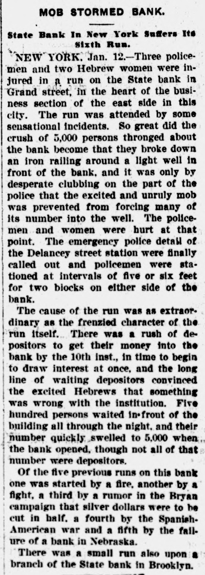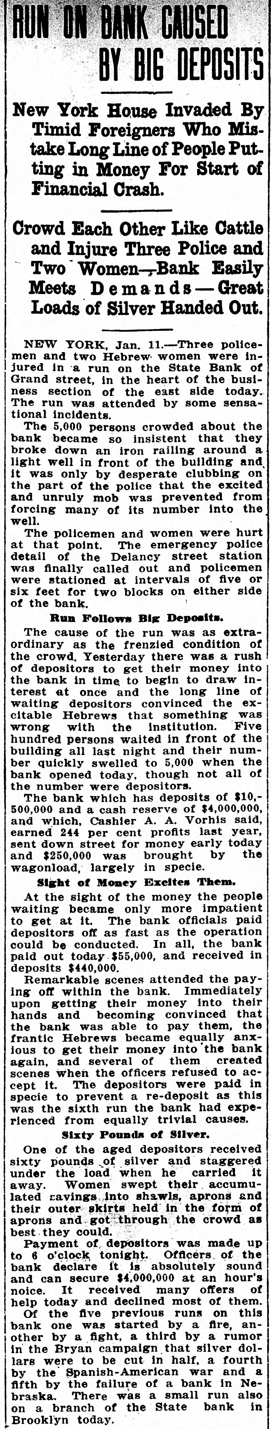 AT STATE BANK/RUN. OVER $80,000 PAID OUT. Deposits Exceed Payments Police Charge Frenzied Crowd. Panic stricken, and like a flock of sheep foltheir leader, the motles throng of 378 delowing in the State Bank, Nos. 376 and positors continued the run on that institution time Grand-st from 9 a. m. to For a inyesterday forenoon the excitement became so in the that a serious riot sprevented only by tense quick action of the police. the of the most anxious had remained in the to Some all night waiting for the bank doors street when they did open for admission, more open, and struggled three than hundred half were women. By 11 a frenzied mob, and of persons whom become o'clock Captain the crowd Tighe had to send for reinforcements. Reserves came The had the Eldridge and Fifth st. stations. from jammed itself against & brass railing the basement in crowd that surrounded had break. front Twenty of the The railing threatened to and some plain clothes men with their clubs just in to the bank. policemen mob time charged avert accident. After this the sidewalk was roped an off and the people kept in line. The blocks on side of the bank were patrolled. became evident that the run was continue all day, and for each When to it perhaps likely several days. two of the bank officials were sent Wall Street, one with a $50,000 gold certifito and the other with one for $25,000. They brought cate back two truckloads of silver dollars. depositor is told that he or she must take Every all his or her money out or none at all, they must accept silver dollars. These and weigh so much that several were unable to away the amounts due them. carry Cohen, of No. 227 Broome-st., one of Becky women to draw her money, received the first in a bag. Each $1,000 of silver weighs $1,085 pounds. When she found the money it fifty-five heavy she begged the cashier to take was so and keep it. but he refused. Up to 3:40 which p. back women were allowed in the line cashm. formed only on the sidewalk and ended at the ier's window in the basement. soon became the rule for a woman who reIt over $200 to take off her skirt, or petti- a celved and make a bag of it. One woman cut into coat. from her waist and made a bag of it, sleeve she poured several hundred dollars. which While some $60,000 was paid out yesterday $400,000 was deposited in the same time. bank officials said they would allow none The old depositors to put back their money, the and of the were paying in specie, so they could tell old depositors when they came back. Roundsmen Blunt and Robinson and Detective crowd were injured in the crush. The of the jammed Kenny them against the railing in front was bank. The six-inch coping of granite out about two inches by the pulling away of of pulled the railing, and the railing was bent out shape. is the sixth run that this bank has weathered. This The "runs" have occurred from all of causes. The first was started by a fight sorts in front of the bank, excited Hebrews thinking that the crowd was storming the bank. The second was caused by a man who had an epileptic fit at the bank and fell into the areathird started from a fire. The fourth occurred in the Spanish war, when there was talk that the Spanish fleet would bombard NewYork and foot the banks. The fifth was in one of the Bryan campaigns. A Nebraska State bank had 2 run. Some of the papers used "Neb." and the Hebrews thought it meant "neblesh," which means poor. A handbill was distributed among the crowd, printed in Yiddish, stating that the bank would pay out money day and night. and that there was nothing to be feared. This seemed to have a good effect, as the crowd thinned out afterward. After the last of the depositors, just before 5 o'clock had been paid. the crowd melted away. With the coming of the men and women from of work at 6 o'clock and after, there was none the congestion or attempts at disorder feared by a Inspector Titus. By 7 o'clock there was not person standing about the bank, and the police guard had been reduced to two men. President O. L. Richard said he was confident the run was about over. Five hundred and eighty-seven accounts had been closed, aggregating $80,763. The depositors, he said, by withdrawing their funds lost the 2 1/2 per cent interest, which would have been paid to-day. The senseless scare had not interfered with deposits made by active depositors. Vice-President Kohn showed a check for $23,750 from Harry Fischel, which was the first deposit received yesterday. He said that up to noon over $20,000 had been deposited, the usual amount and the "scare" money was therefore below the of running business, deposits. At the Brownsville branch of the State Bank, Pitkin and Stone aves. Brooklyn. a number of small depositors withdrew their accounts on account of the stories from Manhattan, and there run was some excitement, but nothing approaching a