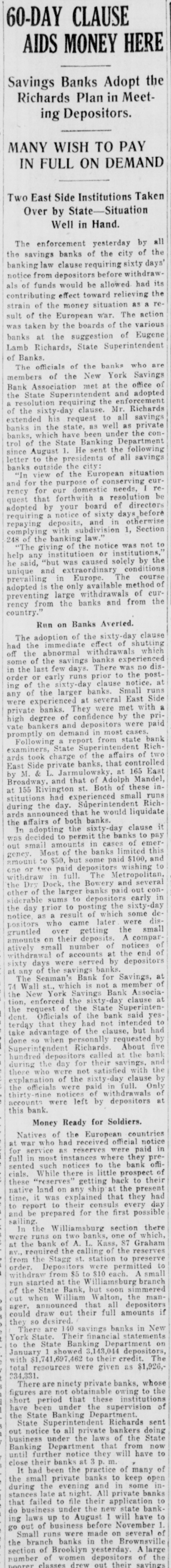 60-DAY CLAUSE AIDS MONEY HERE Savings Banks Adopt the Richards Plan in Meeting Depositors. MANY WISH TO PAY IN FULL ON DEMAND Two East Side Institutions Taken Over by State-Situation Well in Hand. The enforcement yesterday by all the savings banks of the city of the banking law clause requiring sixty days' notice from depositors before withdrawals of funds would be allowed had its contributing effect toward relieving the strain of the money situation as a result of the European war. The action was taken by the boards of the various banks at the suggestion of Eugene Lamb Richards, State Superintendent of Banks. The officials of the banks who are members of the New York Savings Bank Association met at the office of the State Superintendent and adopted a resolution requiring the enforcement of the sixty-day clause. Mr. Richards extended his request to all savings banks in the state, as well as private banks, which have been under the control of the State Banking Department since August 1. He sent the following letter to the presidents of all savings banks outside the city: "In view of the European situation and for the purpose of conserving currency for our domestic needs, request that forthwith a resolution be adopted by your board of directors requiring a notice of sixty days before repaying deposits, and in otherwise complying with subdivision 1, Section 248 of the banking law. "The giving of the notice was not to help any institution or institutions," he said, "but was caused solely by the unique and extraordinary conditions prevailing in Europe. The course adopted is the only available method of preventing large withdrawals of currency from the banks and from the country." Run on Banks Averted. The adoption of the sixty-day clause had the immediate effect of shutting off the abnormal withdrawals which some of the savings banks experienced in the last few days. There was no disorder or early runs prior to the posting of the sixty-day clause notice, at any of the larger banks. Small runs were experienced at several East Side private banks. They were met with a high degree of confidence by the private bankers and depositors were paid promptly on demand in most cases. Following a report from state bank examiners, State Superintendent Richards took charge of the affairs of two East Side private banks, that controlled by M. & L. Jarmulowsky, at 165 East Broadway and that of Adolph Mandel, at 155 Rivington st. Both of these institutions had experienced small runs during the day. Superintendent Rich. ards announced that he would liquidate the affairs of both banks. In adopting the sixty-day clause it was decided to permit the banks to pay out small amounts in cases of emergeney. Most of the banks limited this amount to $50, but some paid $100, and one or two paid depositors wishing to withdraw in full. The Metropolitan, the Dry Dock, the Bowery and several other of the larger banks paid out considerable sums to depositors early in the day prior to posting the sixty-day notice as a result of which some de positors who came later were disgruntled over getting the small amounts on their deposits. A compar atively small number of notices of withdrawal of accounts at the end of sixty days were served by depositors at any of the savings banks. The Seaman's Bank for Savings, at 74 Wall st., which is not a member of the New York Savings Bank Associa tion, enforced the sixty-day clause at the request of the State Superinten dent Officials of the bank said yes terday that they had not intended to take advantage of the clause, but had done so when personally requested by Superintendent Richards. About five hundred depositors called at the bank during the day for their savings, and those who were not satisfied with the explanation of the sixty-day clause by the officials were paid in full. Only thirty nine notices of withdrawals of accounts were left by depositors at this bank. Money Ready for Soldiers. Natives of the European countries at war who had received official notice for service as reserves were paid in full in most instances where they presented such notices to the bank officials. While there is little prospect of these "reserves" getting back to their native land on any ship at the present time, it was explained that they had to report to their consuls every day and be prepared for the first possible sailing. In the Williamsburg section there were runs on two banks, one of which, at the bank of A. L. Kass, 87 Graham av. required the calling of the reserves from the Stagg st. station to preserve order. Depositors were permitted to withdraw from $5 to $10 each. A small run started at the illiamsburg branch of the State Bank, but soon simmered out when William Walton, the manager, announced that all depositors could draw out their full amounts if desired. SO they There are 140 savings banks in New York State. Their financial statements to the State Banking Department on January showed 3,143,044 depositors, with $1,741,697,462 to their credit. The total resources were given as $1,926,334,331. There are ninety private banks, whose figures are not obtainable owing to the short period that these institutions have been under the supervision of the State Banking Department. State Superintendent Richards sent out notice to all private bankers doing business under the laws of the State Banking Department that from now until further notice they will have to close their banks at 3 p. m. It had been the practice of many of the small private banks to keep open during the evening and in some instances late at night. All private banks that failed to file their application to