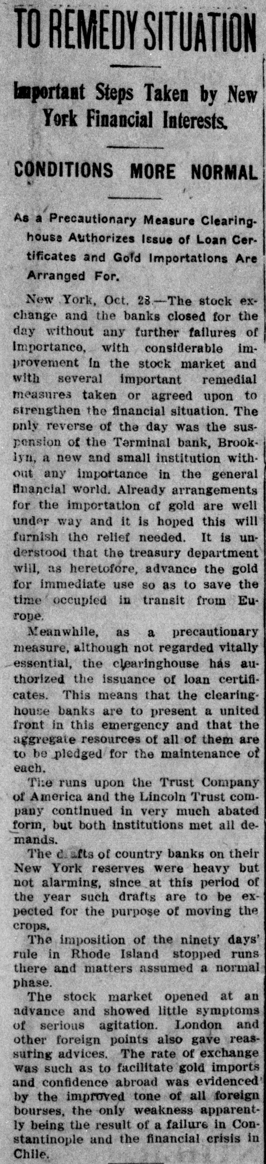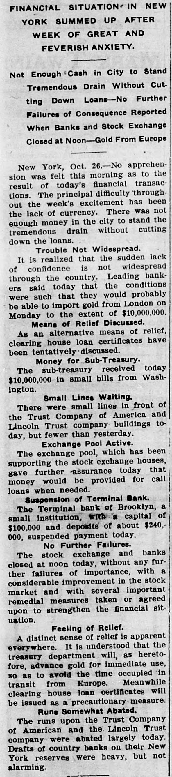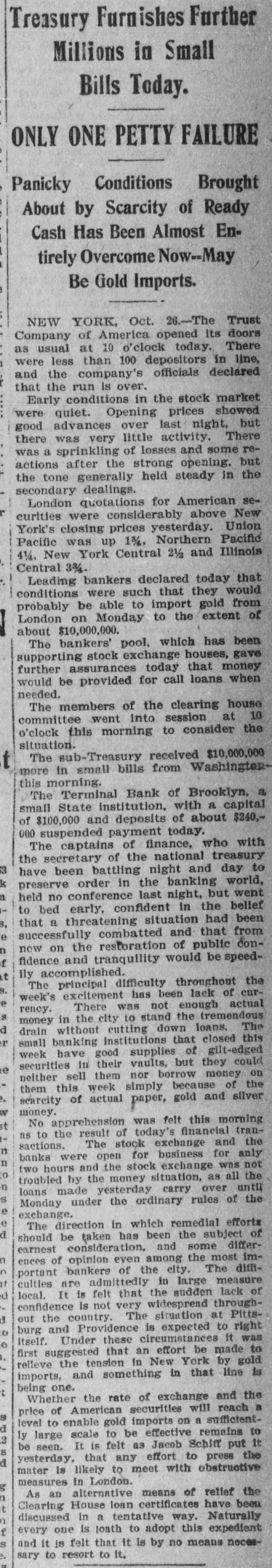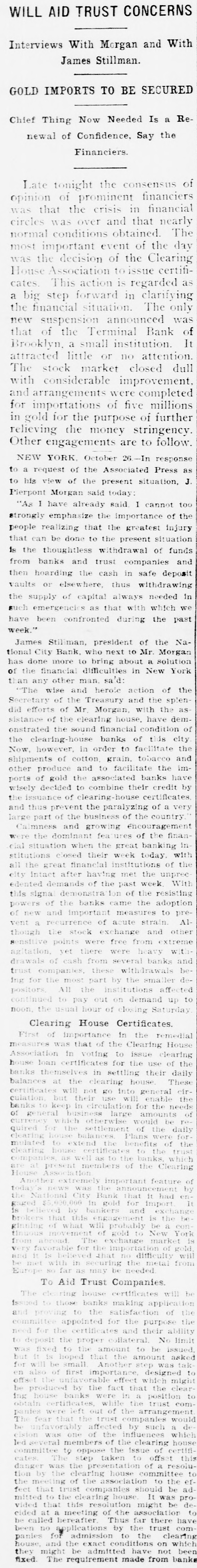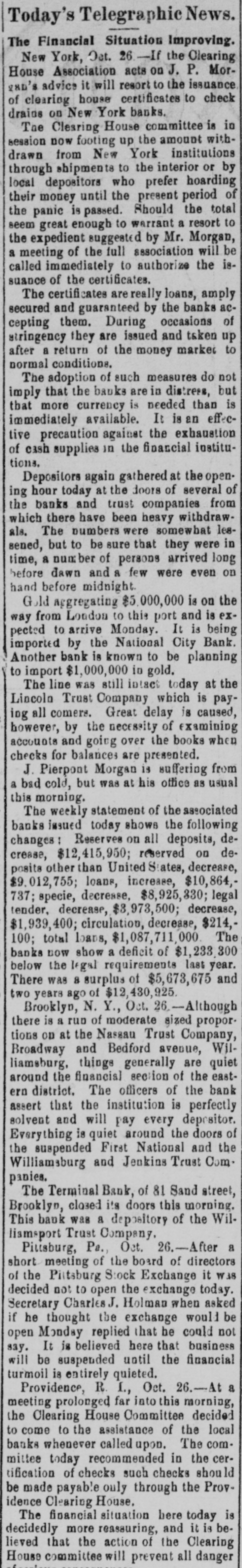 Today's Telegraphic News. The Financial Situation Improving. New York, Oct. 26 -If the Clearing House Association acts on J. P. Morgad's advice it will resort to the issuance of clearing house certificates to check drains on New York banks. The Clearing House committee is in session now footing up the amount withdrawn from New York institutions through shipments to the interior or by local depositors who prefer hoarding their money until the present period of the panic is passed. Should the total seem great enough to warrant a resort to the expedient suggested by Mr. Morgan, a meeting of the full association will be called immediately to authorize the issuance of the certificates. The certificates are really loans, amply secured and guaranteed by the banks accepting them. During occasions of stringency they are issued and taken up after a return of the money market to normal conditions. The adoption of such measures do not imply that the banks are in distress, but that more currency is needed than is immediately available. It is an effective precaution against the exhaustion of cash supplies in the financial institutions. Depositors again gathered at the opening hour today at the doors of several of the banks and trust companies from which there have been heavy withdrawals. The numbers were somewhat lessened, but to be sure that they were in time, a number of persons arrived long before dawn and a few were even on hand before midnight. Gold aggregating $5,000,000 is on the way from London to this port and is expected to arrive Monday. It is being imported by the National City Bank. Another bank is known to be planning to import $1,000,000 in gold. The line was still intact today at the Lincoln Trust Company which is paying all comers. Great delay is caused, however, by the necessity of examining accounts and going over the books when checks for balances are presented. J. Pierpont Morgan is suffering from a bad cold, but was at his office as usual this morning. The weekly statement of the associated banks issued today shows the following changes : Reserves on all deposits, decrease, $12,415,950; reserved on deposits other than United States, decrease, $9,012,755; loans, increase, $10,864,737; specie, decrease, $8,925,330; legal tender, decrease, $8,973,500; decrease, $1,939,400; circulation, decrease, $214,100; total loans, $1,087,711,000. The banks now show a deficit of $1,233,300 below the legal requirements last year. There was 8 surplus of $5,673,675 and two years ago of $12,430,925. Brooklyn, N. Y., Oct. 26-Although there is a ruo of moderate sized proportions on at the Nassau Trust Company, Broadway and Bedford avenue, Williamsburg, things generally are quiet around the financial section of the eastern district. The officers of the bank assert that the institution is perfectly solvent and will pay every depositor. Everything is quiet around the doors of the suspended First National and the Williamsburg and Jenkins Trust Com. panies. The Terminal Bank, of 81 Sand street, Brooklyn, closed its doors this morning. This bank was a depository of the Willismsport Trust Company. Pittsburg, Pa., Oct. 26.-After a short meeting of the board of directors of the Pittsburg Stock Exchange it W38 decided not to open the exchange today. Secretary Charles J. Holman when asked if he thought the exchange would be open Monday replied that be could not say. It js believed here that business will be suspended until the financial turmoil is entirely quieted. Providence, R 1., Oct. 26.-At a meeting prolonged far into this morning, the Clearing House Committee decided to come to the assistance of the local banks whenever called upon. The committee today recommended in the certification of checks such checks should be made payable only through the Providence Clearing House, The financial situation here today is decidedly more reassuring, and it is believed that the action of the Clearing House committee will prevent all danger