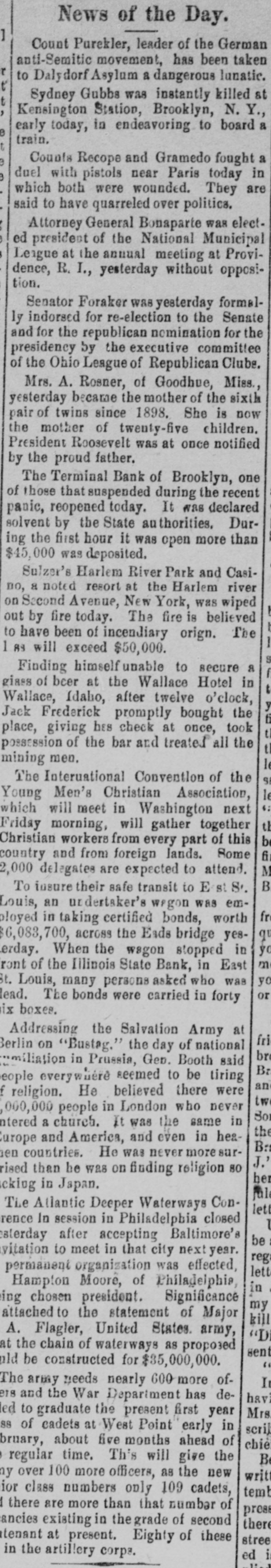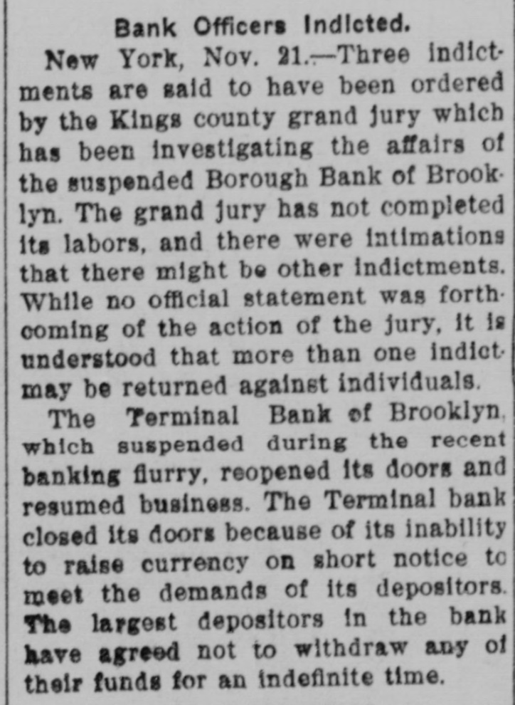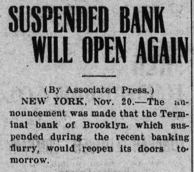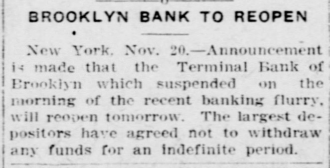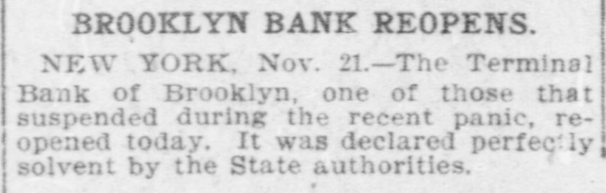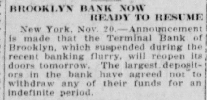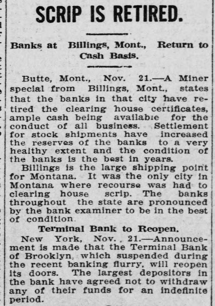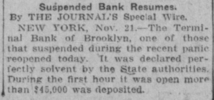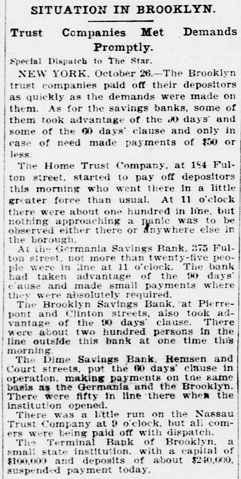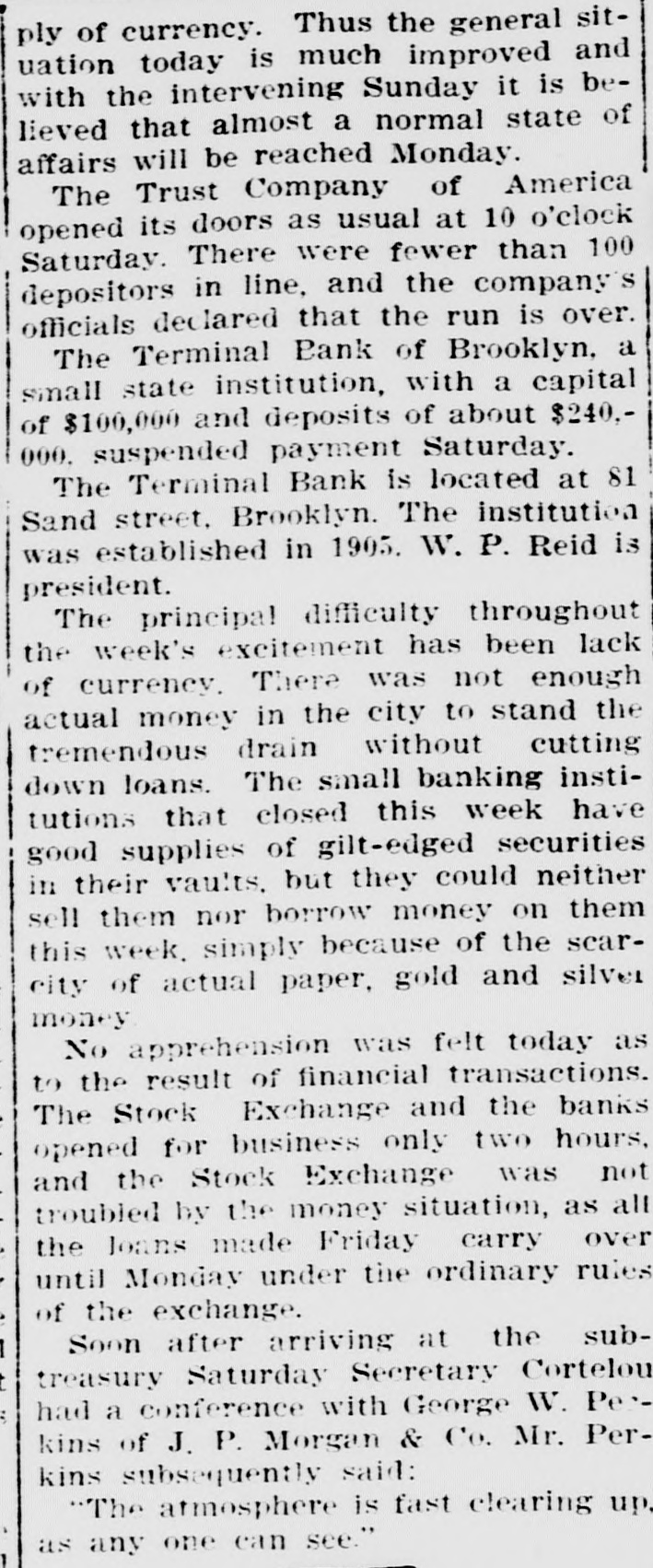 Today's Telegraphic News. The Financial Situation Improving. New York, Oct. 26 -If the Clearing House Association acts on J. P. Morgad's advice it will resort to the issuance of clearing house certificates to check drains on New York banks. The Clearing House committee is in session now footing up the amount withdrawn from New York institutions through shipments to the interior or by local depositors who prefer hoarding their money until the present period of the panic is passed. Should the total seem great enough to warrant a resort to the expedient suggested by Mr. Morgan, a meeting of the full association will be called immediately to authorize the issuance of the certificates. The certificates are really loans, amply secured and guaranteed by the banks accepting them. During occasions of stringency they are issued and taken up after a return of the money market to normal conditions. The adoption of such measures do not imply that the banks are in distress, but that more currency is needed than is immediately available. It is an effective precaution against the exhaustion of cash supplies in the financial institutions. Depositors again gathered at the opening hour today at the doors of several of the banks and trust companies from which there have been heavy withdrawals. The numbers were somewhat lessened, but to be sure that they were in time, a number of persons arrived long before dawn and a few were even on hand before midnight. Gold aggregating $5,000,000 is on the way from London to this port and is expected to arrive Monday. It is being imported by the National City Bank. Another bank is known to be planning to import $1,000,000 in gold. The line was still intact today at the Lincoln Trust Company which is paying all comers. Great delay is caused, however, by the necessity of examining accounts and going over the books when checks for balances are presented. J. Pierpont Morgan is suffering from a bad cold, but was at his office as usual this morning. The weekly statement of the associated banks issued today shows the following changes : Reserves on all deposits, decrease, $12,415,950; reserved on deposits other than United States, decrease, $9,012,755; loans, increase, $10,864,737; specie, decrease, $8,925,330; legal tender, decrease, $8,973,500; decrease, $1,939,400; circulation, decrease, $214,100; total loans, $1,087,711,000. The banks now show a deficit of $1,233,300 below the legal requirements last year. There was 8 surplus of $5,673,675 and two years ago of $12,430,925. Brooklyn, N. Y., Oct. 26-Although there is a ruo of moderate sized proportions on at the Nassau Trust Company, Broadway and Bedford avenue, Williamsburg, things generally are quiet around the financial section of the eastern district. The officers of the bank assert that the institution is perfectly solvent and will pay every depositor. Everything is quiet around the doors of the suspended First National and the Williamsburg and Jenkins Trust Com. panies. The Terminal Bank, of 81 Sand street, Brooklyn, closed its doors this morning. This bank was a depository of the Willismsport Trust Company. Pittsburg, Pa., Oct. 26.-After a short meeting of the board of directors of the Pittsburg Stock Exchange it W38 decided not to open the exchange today. Secretary Charles J. Holman when asked if he thought the exchange would be open Monday replied that be could not say. It js believed here that business will be suspended until the financial turmoil is entirely quieted. Providence, R 1., Oct. 26.-At a meeting prolonged far into this morning, the Clearing House Committee decided to come to the assistance of the local banks whenever called upon. The committee today recommended in the certification of checks such checks should be made payable only through the Providence Clearing House, The financial situation here today is decidedly more reassuring, and it is believed that the action of the Clearing House committee will prevent all danger