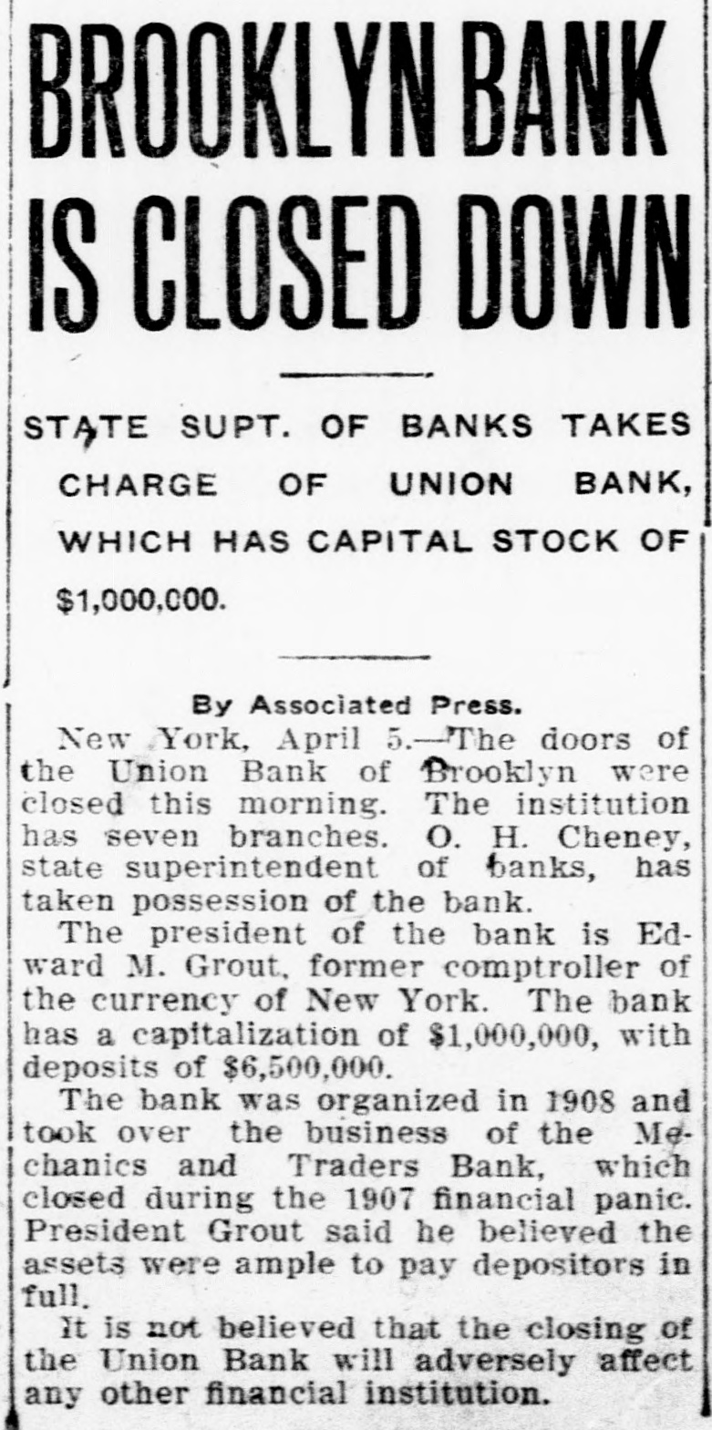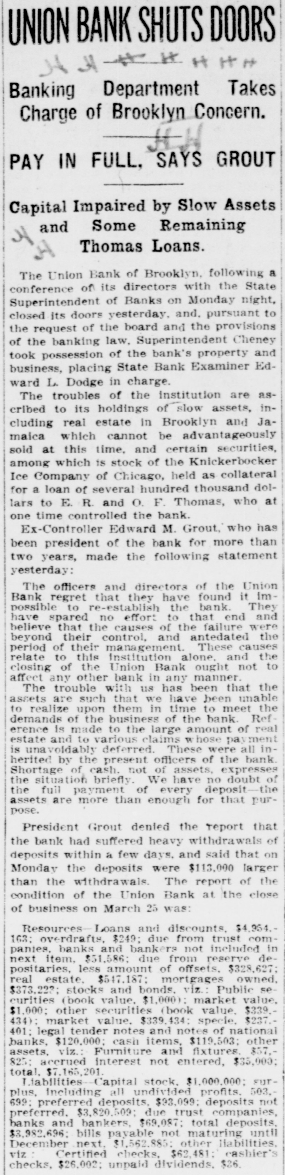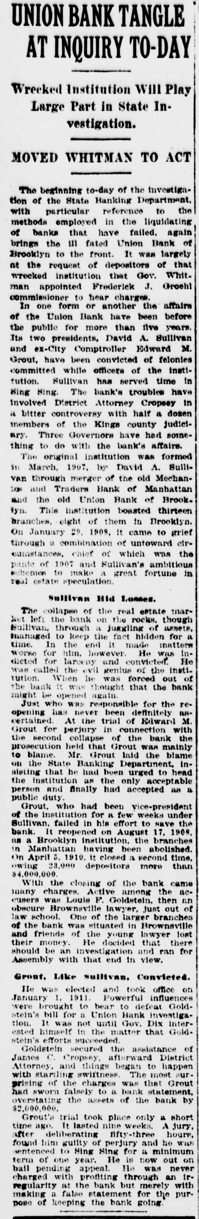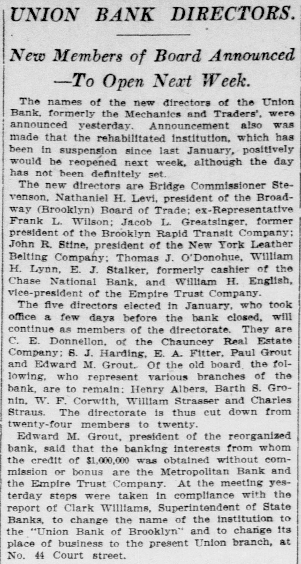 UNION BANK DIRECTORS. New Members of Board Announced -To Open Next Week. The names of the new directors of the Union Bank, formerly the Mechanics and Traders', were announced yesterday. Announcement also was made that the rehabilitated institution, which has been in suspension since last January, positively would be reopened next week, although the day has not been definitely set. The new directors are Bridge Commissioner Stevenson, Nathaniel H. Levi, president of the Broadway (Brooklyn) Board of Trade: ex-Representative Frank L. Wilson; Jacob L. Greatsinger, former president of the Brooklyn Rapid Transit Company; John R. Stine, president of the New York Leather Belting Company: Thomas J. O'Donohue, William H. Lynn, E. J. Stalker, formerly cashier of the Chase National Bank, and William H. English, vice-president of the Empire Trust Company. The five directors elected in January, who took office a few days before the bank closed, will continue as members of the directorate. They are C. E. Donnellon, of the Chauncey Real Estate Company; S. J. Harding, E. A. Fitter, Paul Grout and Edward M. Grout. Of the old board the following, who represent various branches of the bank, are to remain: Henry Albers, Barth S. Gronin, W. F. Corwith, William Strasser and Charles Straus. The directorate is thus cut down from twenty-four members to twenty. Edward M. Grout, president of the reorganized bank, said that the banking interests from whom the credit of $1,000,000 was obtained without commission or bonus are the Metropolitan Bank and the Empire Trust Company. At the meeting yesterday steps were taken in compliance with the report of Clark Williams, Superintendent of State Banks, to change the name of the institution to the "Union Bank of Brooklyn" and to change its place of business to the present Union branch, at No. 44 Court street.