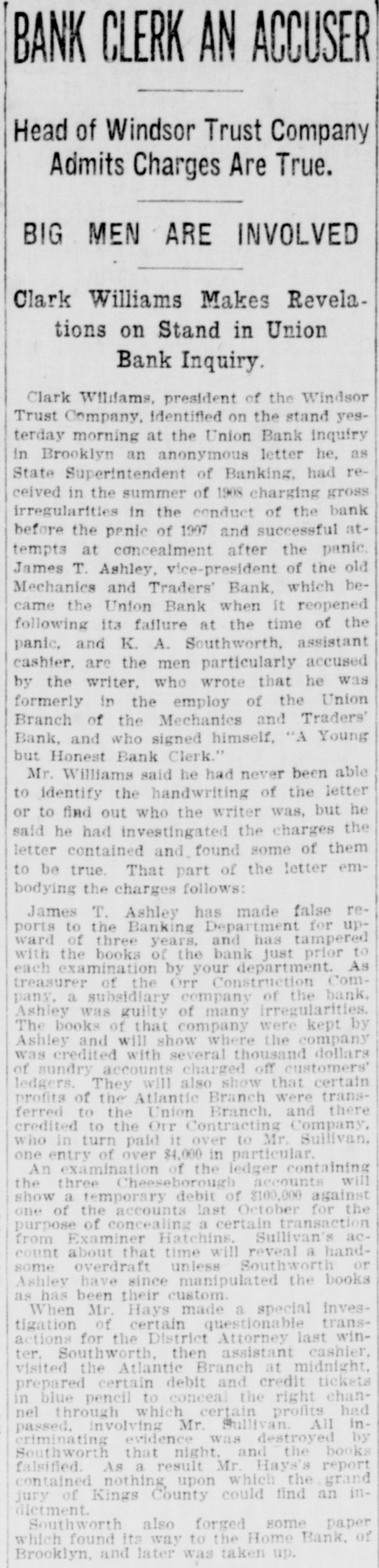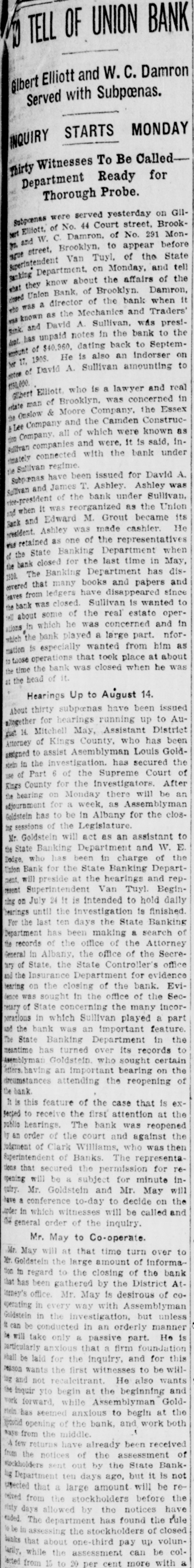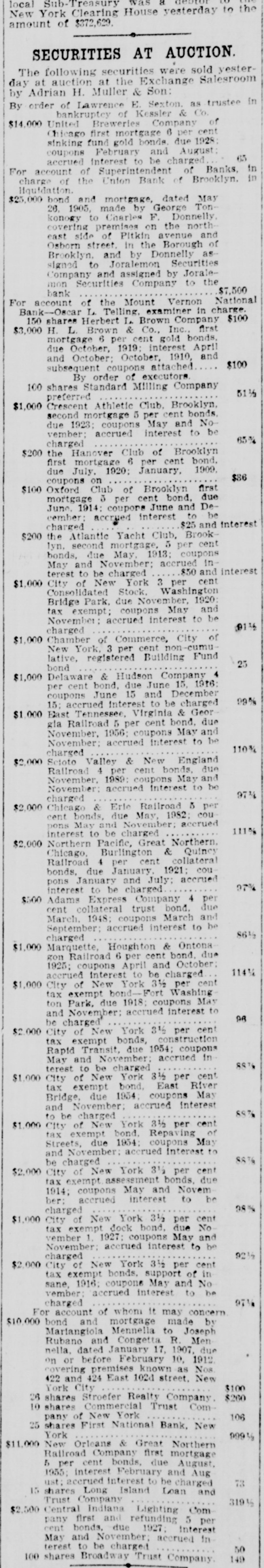 a local New York Sub Clearing Treasury House was yesterday to the amount of $372,629. SECURITIES AT AUCTION. The following securities were sold yesterday at auction at the Exchange Salesroom by Adrian H. Muller & Son: By order of Lawrence E. Sexton. as trustee in bankruptcy of Kessler & Co. $14,000 United Brewerles Company of Chicago first mortgage 6 per cent sinking fund gold bonds. due 1928: coupons February and August 65 accrued interest to be charged For account of Superintendent of Banks, in charge of the Union Bank of Brooklyn. in Hquidation. $25,000 bond and mortgage, dated May 26, 1905, made by George Tonkonogy to Charles F. Donnelly, covering premises on the northeast side of Pitkin avenue and Osborn street. in the Borough of Brooklyn, and by Donnelly assigned to Joralemon Securities Company and assigned by Joralemon Securities Company to the $7,500 For account bank of the Mount Vernon National Bank-Oscar L. Telling. examiner in charge. 150 shares Herbert L. Brown Company $100 $3,000 H. L. Brown & Co., Inc., first mortgage 6 per cent gold bonds, due October, 1919: interest April and October: October, 1910, and $100 subsequent coupons attached By order of executors. 100 shares Standard Milling Company 51½ $1,000 preferred Crescent Athletic Club, Brooklyn, second mortgage 5 per cent bonds, due 1923; coupons May and November; accrued interest to be 65% charged $200 the Hanover Club of Brooklyn first mortgage 6 per cent bond. due July. 1920: January, 1909, $86 coupons on $100 Oxford Club of Brooklyn first mortgage 5 per cent bond. due June. 1914: coupons June and December: accrued interest to be $25 and interest charged $200 the Atlantic Yacht Club, Brooklyn, second mortgage, 5 per cent bonds, due May, 1913: coupons May and November: accrued in terest to be charged $50 and interest $1,000 City of New York 3 per cent Consolidated Stock, Washington Bridge Park, due November, 1920 tax exempt; coupons May and November accrued interest to be 0116 charged $1,000 Chamber of Commerce, City of New York, 3 per cent non-cumu lative, registered Building Fund 25 bond $1,000 Delaware & Hudson Company 4 per cent bond, due June 15. 1916: coupons June 15 and December 99% 15: accrued interest to be charged $1,000 East Tennessee, Virginia & Geor gla Railroad 5 per cent bond. due November, 1956: coupons May and November: accrued interest to be 110% charged $2,000 Scioto Valley & New England Railroad 4 per cent bonds. due November, 1989: coupons May and November: accrued interest to be 97% charged $2,000 Chicago & Erle Railroad 5 per cent bonds, due May, 1982; cou pons May and November: accrued 111% interest to be charged $2,000 Northern Pacific, Great Northern. Chicago, Burlington & Quincy Railroad 4 per cent collateral bonds, due January, 1921: cou pons January and July; accrued 97% interest to be charged $500 Adams Express Company 4 per cent collateral trust bond. due March. 1948: coupons March and September: accrued interest to be 86½ charged $1,000 Marquette, Houghton & Ontona gon Railroad 6 per cent bond. due 1925: coupons April and October: 114% accrued interest to be charged $1,000 City of New York 3½ per cent tax exempt bond- Fort Washing ton Park, due 1918; coupons May and November: accrued interest to 96 be charged $2.000 City of New York 3½ per cent tax exempt bonds, construction Rapid Transit, due 1954; coupons May and November: accrued in 88% terest to be charged $1,000 City of New York 3½ per cent tax exempt bond, East River Bridge, due 1954 coupons May and November: accrued interest 88% to be charged $1,000 City of New York 3½ per cent tax exempt bond, Repaving of Streets, due 1954 coupons May and November: accrued interest to 88% be charged $2,000 City of New York 3½ per cent tax exempt assessment bonds, due 1914; coupons May and Novem ber: accrued interest to be 98% charged $1,000 City of New York 3½ per cent tax exempt dock bond, due No vember 1. 1927: coupons May and November: accrued interest to be 9216 charged $2,000 City of New York 3½ per cent tax exempt bonds. support of in sane, 1916; coupons May and No vember: accrued interest to be 97% charged For account of whom it may concern $10.000 bond and mortgage made by Mariangiola Mennella to Joseph Rubano and Congetta R Men nella, dated January 17, 1907. due on or before February 10, 1912 covering premises known as Nos 422 and 424 East 102d street, New $100 York City $260 26 shares Stroefer Realty Company. 10 shares Commercial Trust Com106 pany of New York 25 shares First National Bank, New York 99916 $11,000 New Orleans & Great Northern Railroad Company first mortgage 5 per cent bonds, due August, 1955; interest February and Aug 73 ust: accrued interest to be charged 15 shares Long Island Loan and Trust Company 319% $2,500 Central Indiana Lighting Com pany first and refunding 5 per cent bonds, due 1927: interest May and November; accrued in terest to be charged 50 149 100 shares Broadway Trust Company