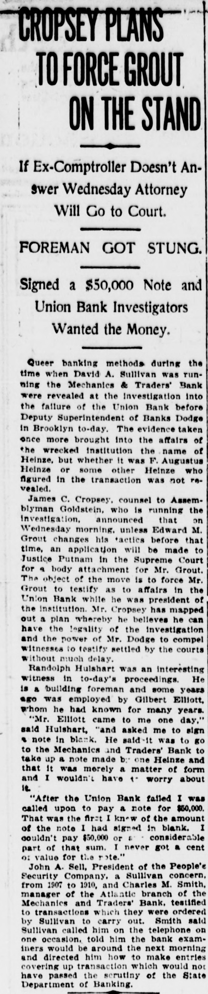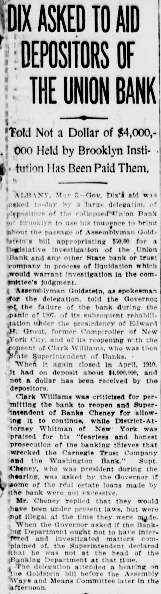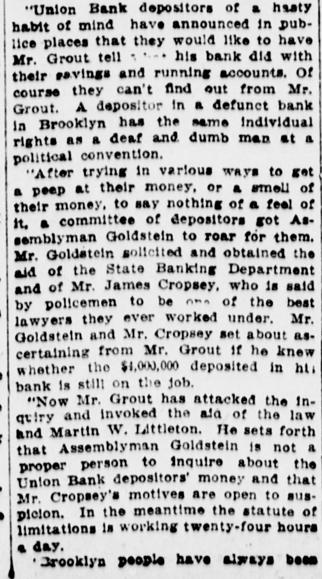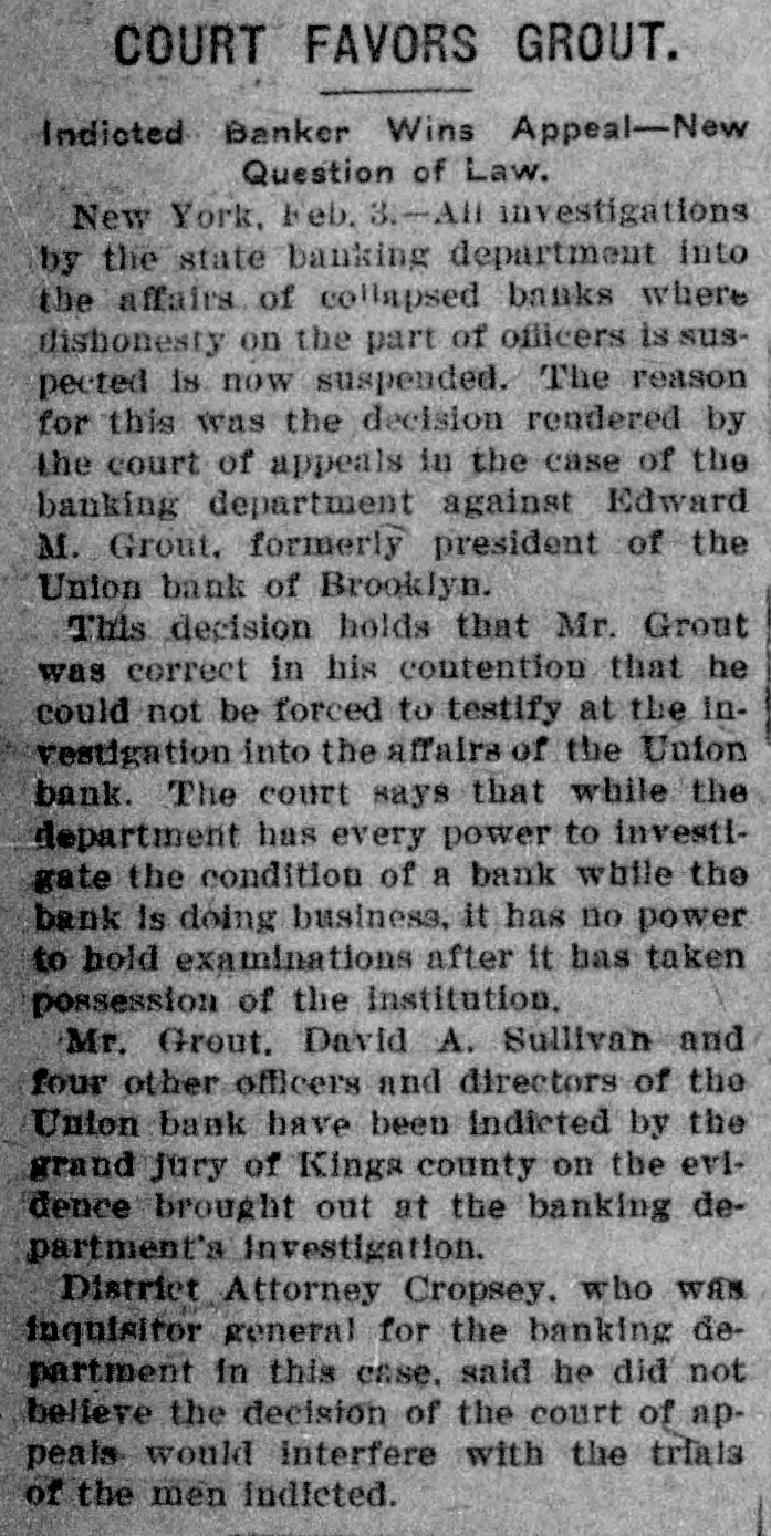 a local New York Sub Clearing Treasury House was yesterday to the amount of $372,629. SECURITIES AT AUCTION. The following securities were sold yesterday at auction at the Exchange Salesroom by Adrian H. Muller & Son: By order of Lawrence E. Sexton. as trustee in bankruptcy of Kessler & Co. $14,000 United Brewerles Company of Chicago first mortgage 6 per cent sinking fund gold bonds. due 1928: coupons February and August 65 accrued interest to be charged For account of Superintendent of Banks, in charge of the Union Bank of Brooklyn. in Hquidation. $25,000 bond and mortgage, dated May 26, 1905, made by George Tonkonogy to Charles F. Donnelly, covering premises on the northeast side of Pitkin avenue and Osborn street. in the Borough of Brooklyn, and by Donnelly assigned to Joralemon Securities Company and assigned by Joralemon Securities Company to the $7,500 For account bank of the Mount Vernon National Bank-Oscar L. Telling. examiner in charge. 150 shares Herbert L. Brown Company $100 $3,000 H. L. Brown & Co., Inc., first mortgage 6 per cent gold bonds, due October, 1919: interest April and October: October, 1910, and $100 subsequent coupons attached By order of executors. 100 shares Standard Milling Company 51½ $1,000 preferred Crescent Athletic Club, Brooklyn, second mortgage 5 per cent bonds, due 1923; coupons May and November; accrued interest to be 65% charged $200 the Hanover Club of Brooklyn first mortgage 6 per cent bond. due July. 1920: January, 1909, $86 coupons on $100 Oxford Club of Brooklyn first mortgage 5 per cent bond. due June. 1914: coupons June and December: accrued interest to be $25 and interest charged $200 the Atlantic Yacht Club, Brooklyn, second mortgage, 5 per cent bonds, due May, 1913: coupons May and November: accrued in terest to be charged $50 and interest $1,000 City of New York 3 per cent Consolidated Stock, Washington Bridge Park, due November, 1920 tax exempt; coupons May and November accrued interest to be 0116 charged $1,000 Chamber of Commerce, City of New York, 3 per cent non-cumu lative, registered Building Fund 25 bond $1,000 Delaware & Hudson Company 4 per cent bond, due June 15. 1916: coupons June 15 and December 99% 15: accrued interest to be charged $1,000 East Tennessee, Virginia & Geor gla Railroad 5 per cent bond. due November, 1956: coupons May and November: accrued interest to be 110% charged $2,000 Scioto Valley & New England Railroad 4 per cent bonds. due November, 1989: coupons May and November: accrued interest to be 97% charged $2,000 Chicago & Erle Railroad 5 per cent bonds, due May, 1982; cou pons May and November: accrued 111% interest to be charged $2,000 Northern Pacific, Great Northern. Chicago, Burlington & Quincy Railroad 4 per cent collateral bonds, due January, 1921: cou pons January and July; accrued 97% interest to be charged $500 Adams Express Company 4 per cent collateral trust bond. due March. 1948: coupons March and September: accrued interest to be 86½ charged $1,000 Marquette, Houghton & Ontona gon Railroad 6 per cent bond. due 1925: coupons April and October: 114% accrued interest to be charged $1,000 City of New York 3½ per cent tax exempt bond- Fort Washing ton Park, due 1918; coupons May and November: accrued interest to 96 be charged $2.000 City of New York 3½ per cent tax exempt bonds, construction Rapid Transit, due 1954; coupons May and November: accrued in 88% terest to be charged $1,000 City of New York 3½ per cent tax exempt bond, East River Bridge, due 1954 coupons May and November: accrued interest 88% to be charged $1,000 City of New York 3½ per cent tax exempt bond, Repaving of Streets, due 1954 coupons May and November: accrued interest to 88% be charged $2,000 City of New York 3½ per cent tax exempt assessment bonds, due 1914; coupons May and Novem ber: accrued interest to be 98% charged $1,000 City of New York 3½ per cent tax exempt dock bond, due No vember 1. 1927: coupons May and November: accrued interest to be 9216 charged $2,000 City of New York 3½ per cent tax exempt bonds. support of in sane, 1916; coupons May and No vember: accrued interest to be 97% charged For account of whom it may concern $10.000 bond and mortgage made by Mariangiola Mennella to Joseph Rubano and Congetta R Men nella, dated January 17, 1907. due on or before February 10, 1912 covering premises known as Nos 422 and 424 East 102d street, New $100 York City $260 26 shares Stroefer Realty Company. 10 shares Commercial Trust Com106 pany of New York 25 shares First National Bank, New York 99916 $11,000 New Orleans & Great Northern Railroad Company first mortgage 5 per cent bonds, due August, 1955; interest February and Aug 73 ust: accrued interest to be charged 15 shares Long Island Loan and Trust Company 319% $2,500 Central Indiana Lighting Com pany first and refunding 5 per cent bonds, due 1927: interest May and November; accrued in terest to be charged 50 149 100 shares Broadway Trust Company