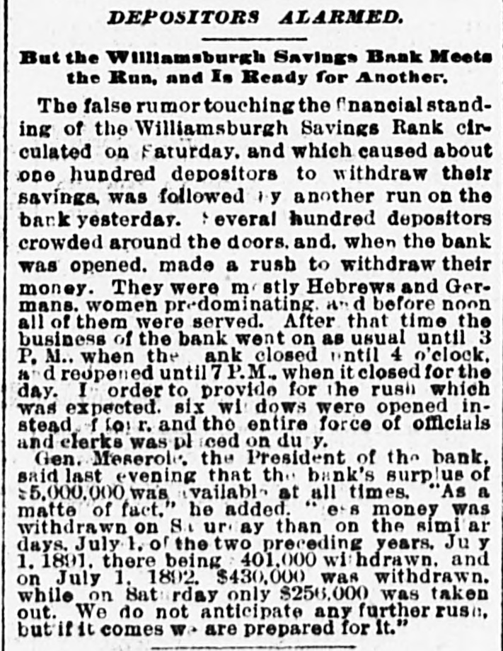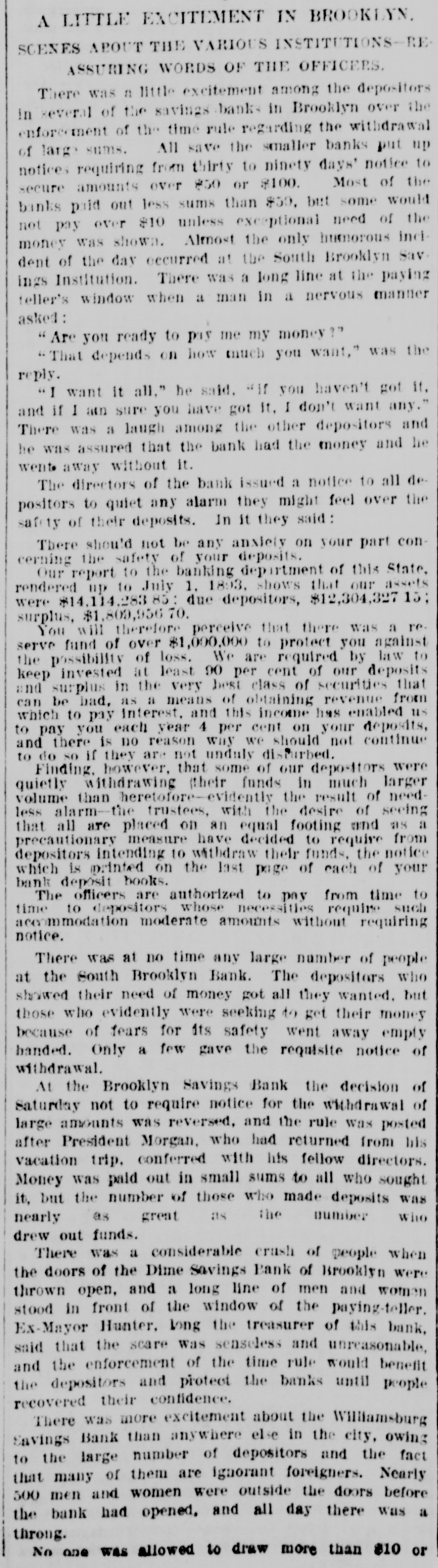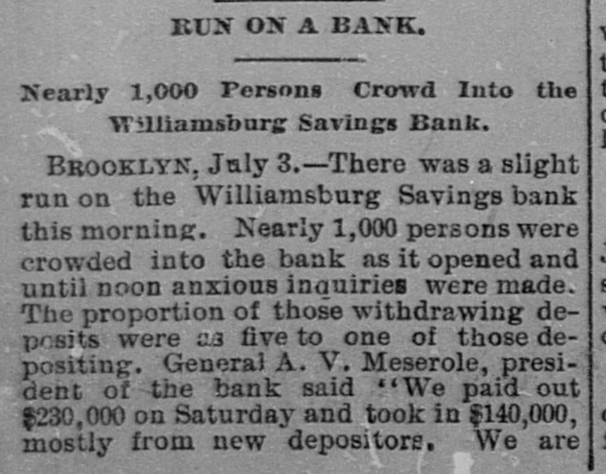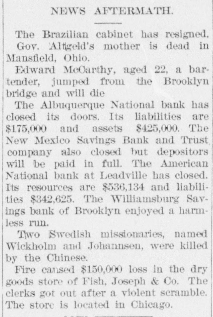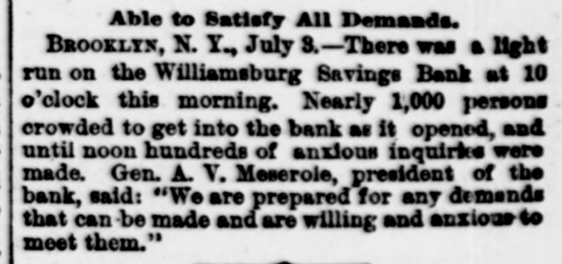 BANK FAILURE. The Albuquerqne National Temporarily Suspends Business. ALBUQUERQUE (N. M.), July 3.-The following note was posted on the door of the Albuquerque National Bank this morning: The Albuquerque National Bank is compelled temporarily to suspend business. This is brought about by the unusual demands of depositors since the suspension of the California banks about ten days ago, and the absolute impossibility during the present business depression to call in our loans. It is confidently hoped that we can soon resuine business and that every creditor will be paid in full, as the assets greatly exceed the liabilities. JOHN A. LEE, Vice-President. The suspension will cause no loss to depositors, as the bank has a surplus of $40,000. Other banks are exceptionally strong, and have large cash reserves. Full confidence is expressed by citizens, and no runs whatever are being made. The liabilities of the Albuquerque National Bank are $270,000, and the assets $420,000. The New Mexico Savings Bank and Trust Company is also closed, but they say the depositors will be paid in full. RESUMING BUSINESS. WASHINGTON, July 3. - Comptroller Eckels is advised that the First National Bank at San Diego, Cal., which failed one month ago, will resume business Wednesday, having complied with the conditions imposed by the Comptroller. It is probable, also, that the failed Washington National Bank of Spokane, Wash., will resume business in ten days. A RUN AT LEADVILLE. LEADVILLE (Col.), July 3.-A run was made on the California, Carbondale and American Banks to-day, but all demands of depositors were promptly met with cash, and at the closing hour the run had ceased. The American National Bank closed its doors this morning, but the directors say the depositors will be paid in full. The statement shows the resources to be $536,134 and the liabilities $347,625. RUN ON A BROOKLYN BANK. BROOKLYN, July 3.-There was a slight run on the Williamsburg Savings Bank this morning. Nearly 1,000 persons crowded into the bank as it opened, and until noon, anxious inquiries made show the proportion of those withdrawing deposits as to five to one of those depositing. General A. V. Meserole, President of the bank, said: "We paid out $230,000 on Saturday and took in $140,000, mostly from new depositors. We are doing business fast, and preparing for a run should it come." HAS PLENTY OF FUNDS. Cisco (Tex.), July 3.-The doors of the National Bank of Cisco were closed by the Inspector to-day, while the inspections of the bank's condition are being made, to prevent a run. The Cashier stated that the bank had two and a half dollars for every dollar of liabilities. DECLARED INSOLVENT. WINNIPEG (Man.), July 3.-The Commercial Bank of Manitoba has been declared insolvent and liquidators appointed to wind up its business. Bills of the bank are as good as gold under the Dominion law.