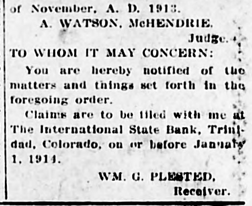 of November, A. D. 1913. A. WATSON, McHENDRIE . Judge. TO WHOM IT MAY CONCERN: You are hereby notified of the matters and things set forth in the foregoing order. Claims are to be filed with me at The International State Bank, Trintdad, Colorado, on or before January 1. 1914. WM. G. PLESTED. Receiver.